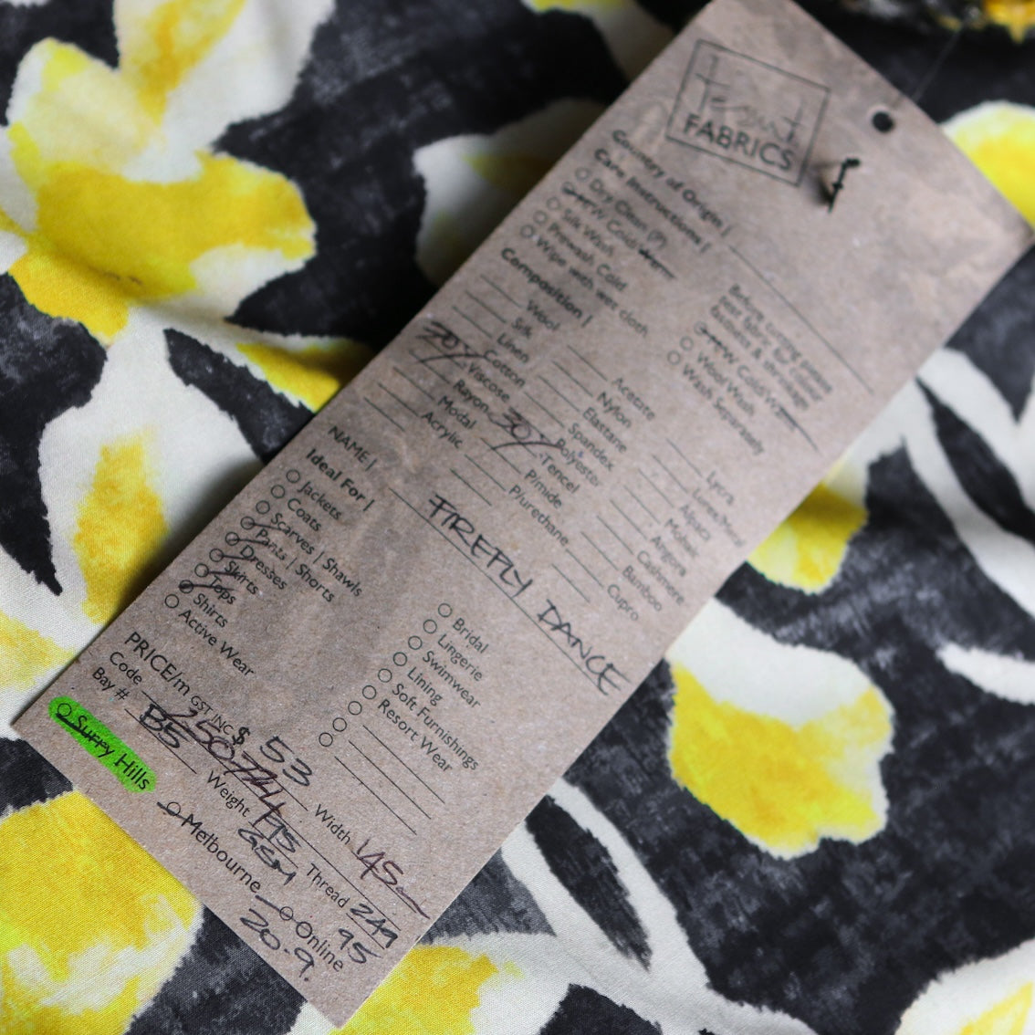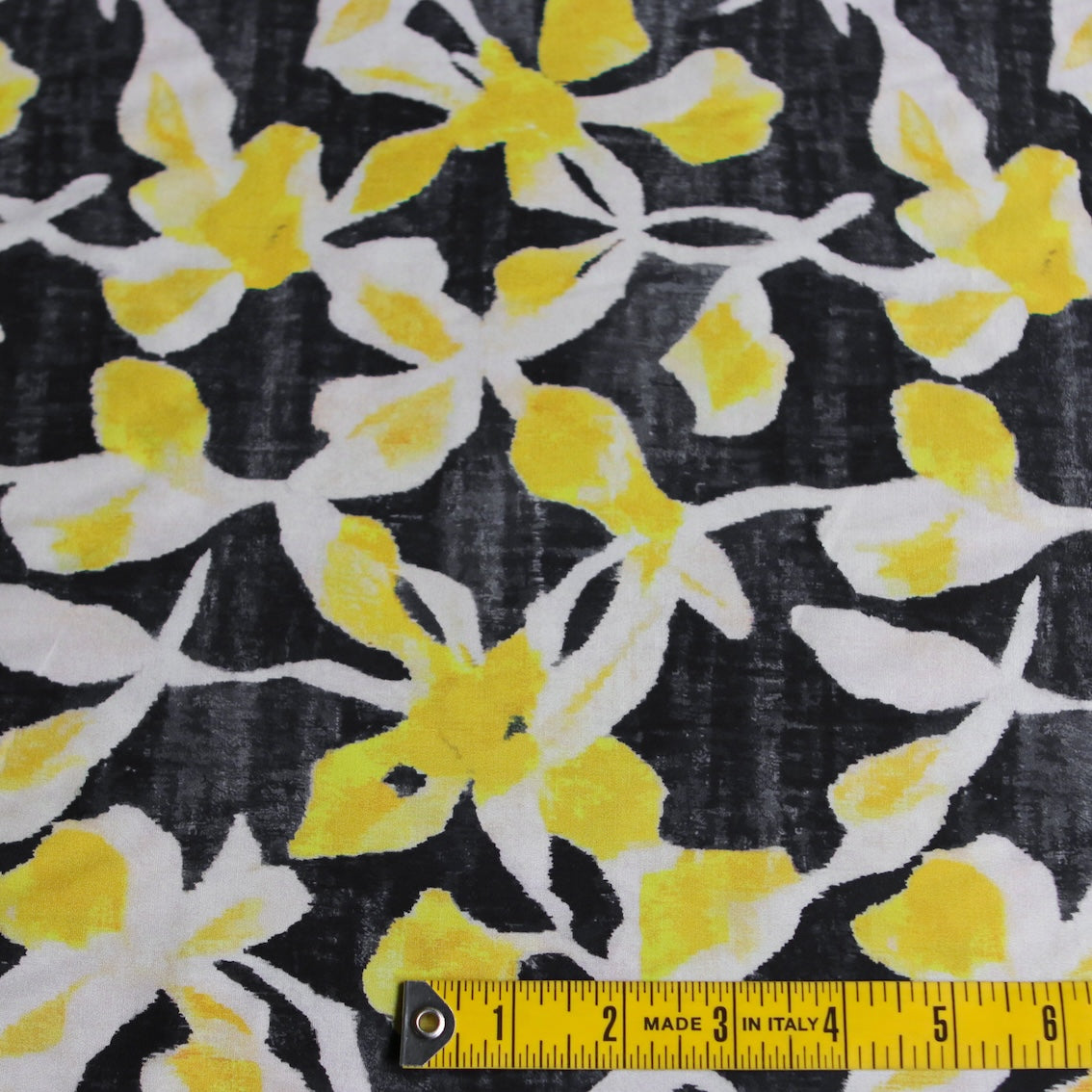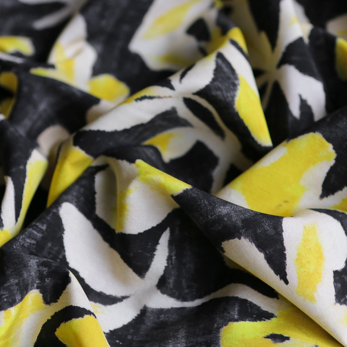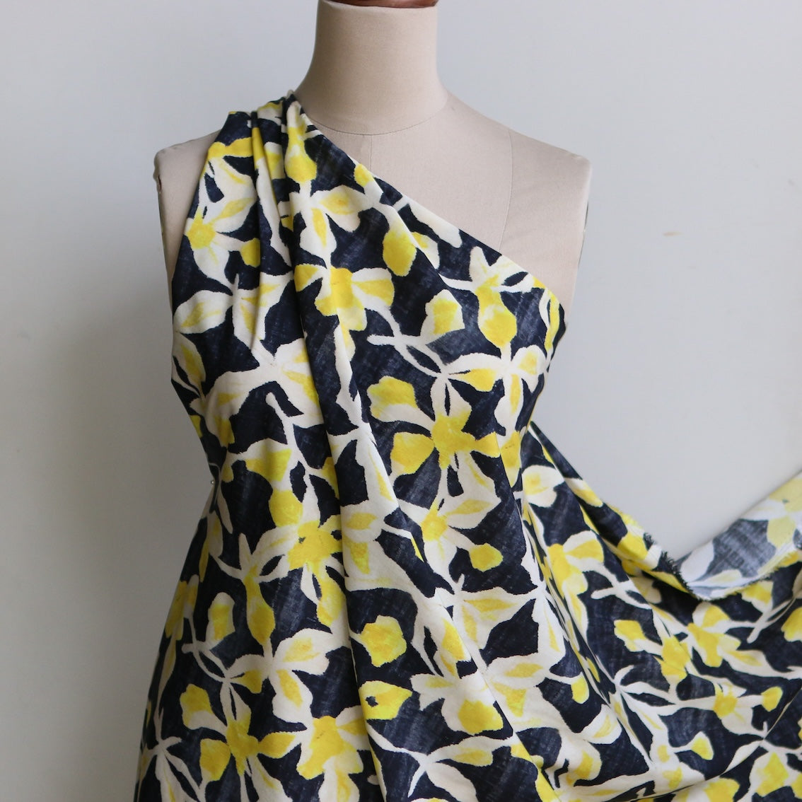 Soft & drapey daffodil yellow/charcoal/ecru digitally printed 70% viscose 30% tencel
