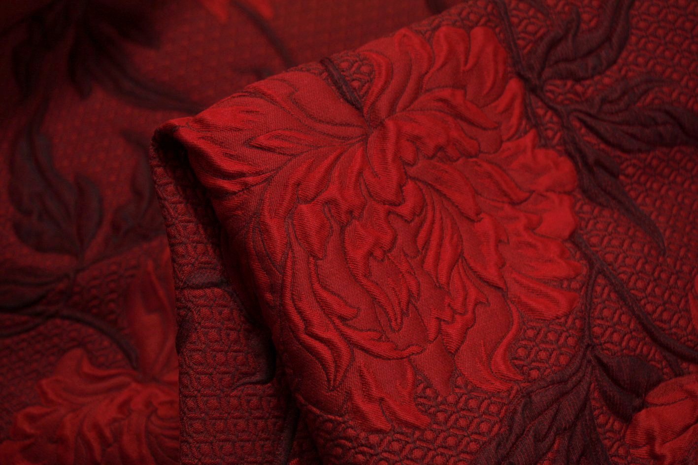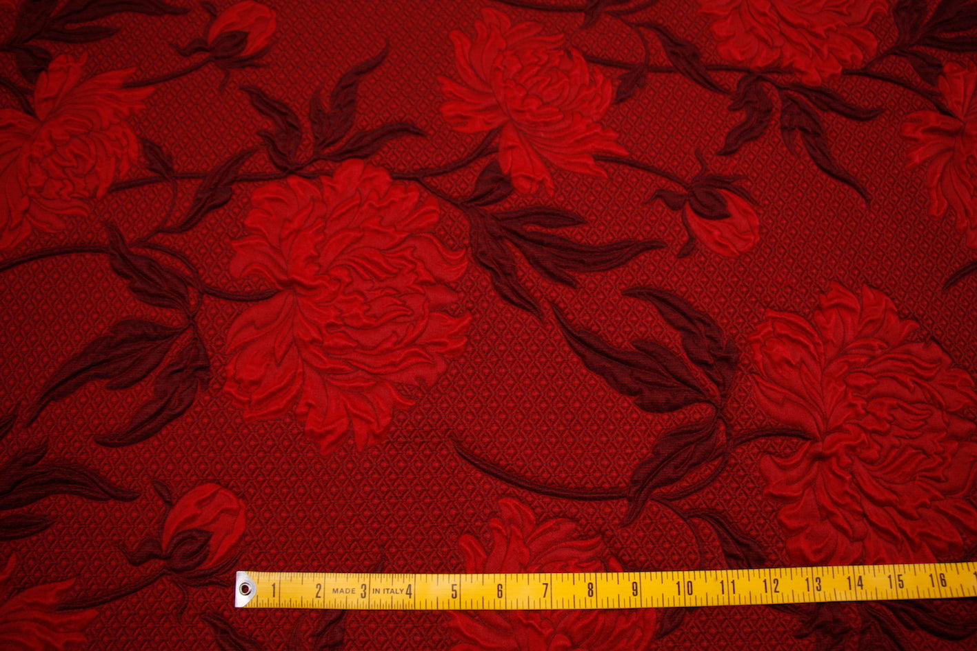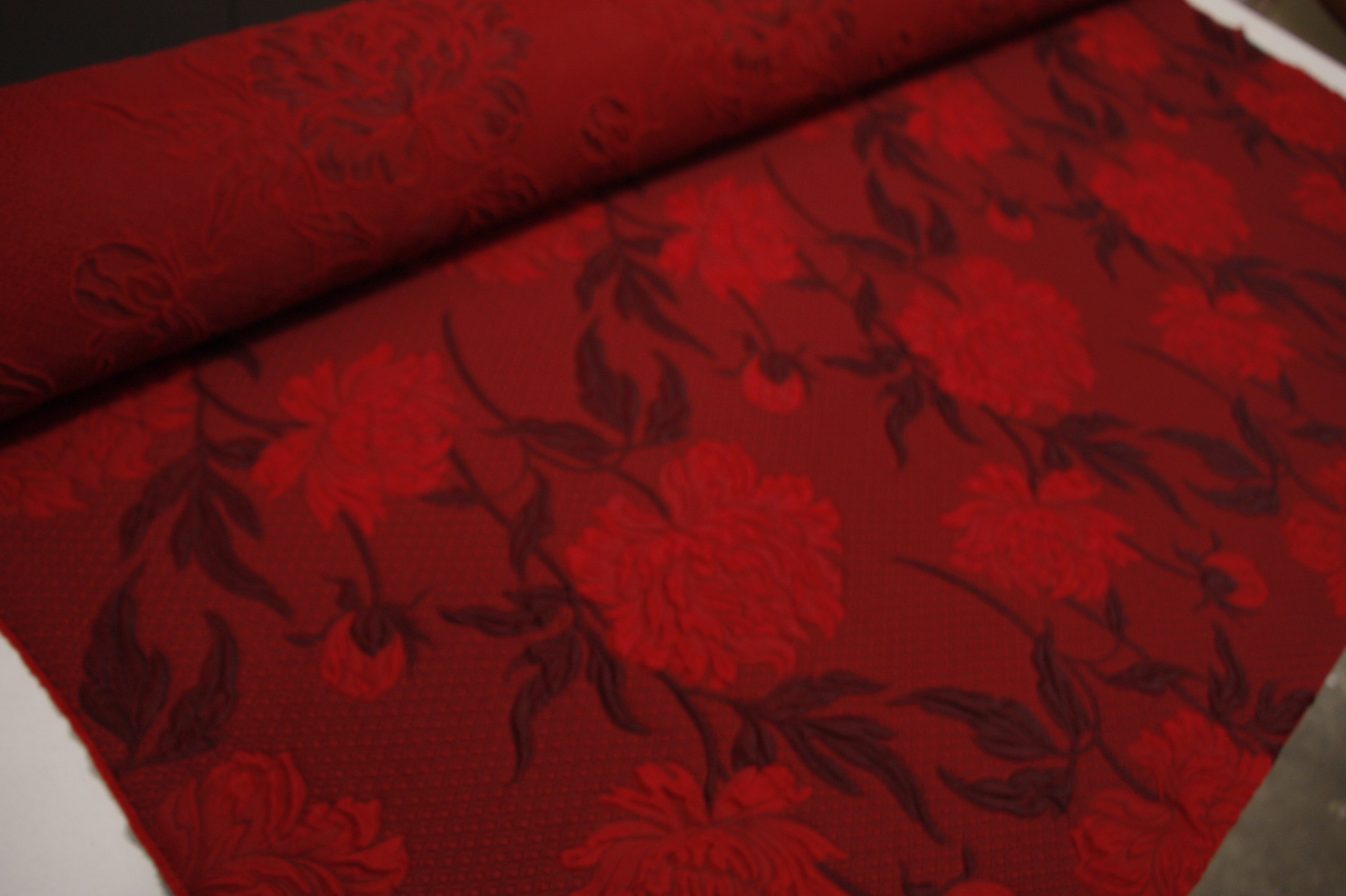 Italian designer red/garnet/oxblood floral 44% wool 44% acetate 8% silk 4% polyamide floral jacquard . Width: 145cm