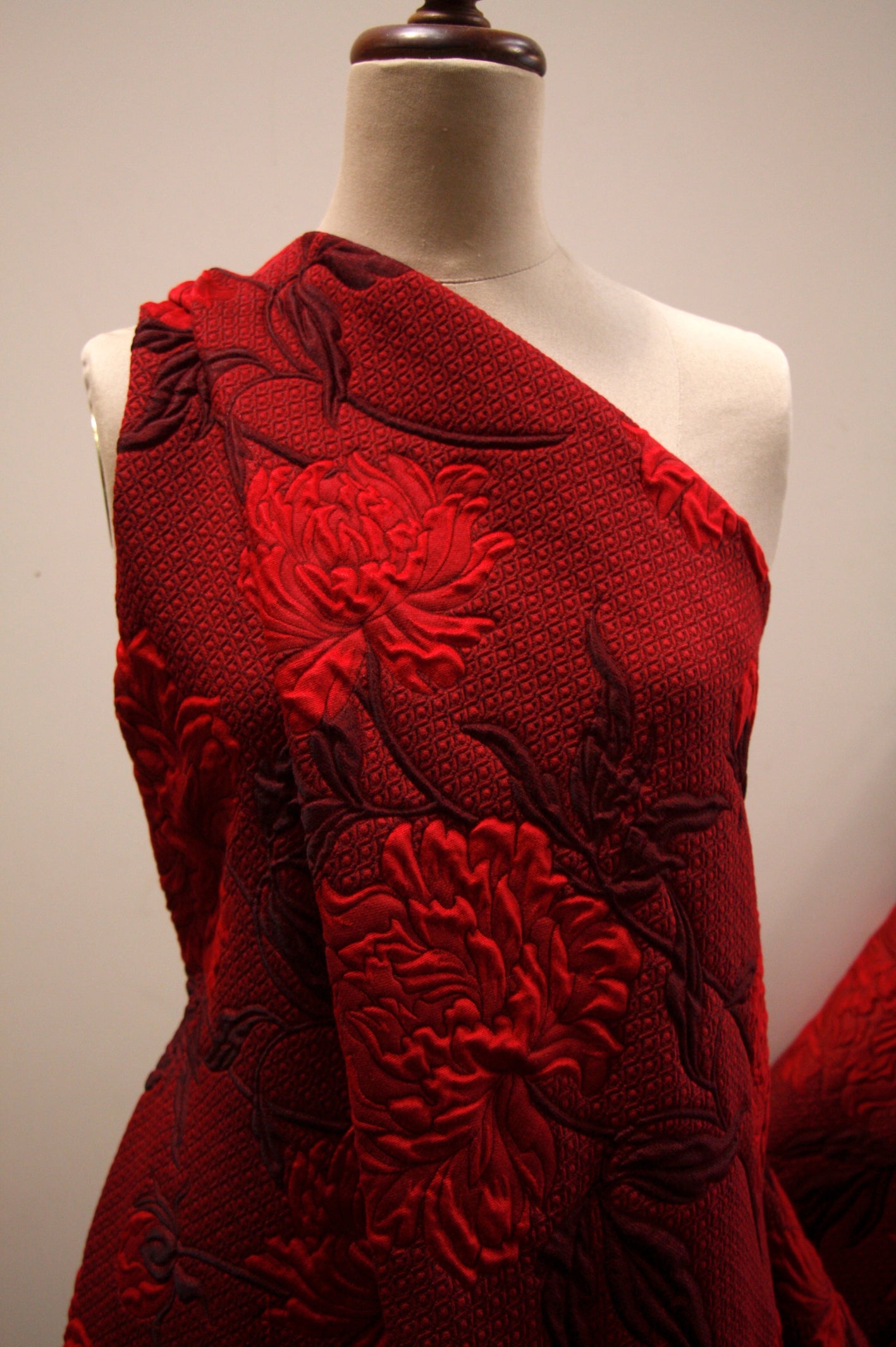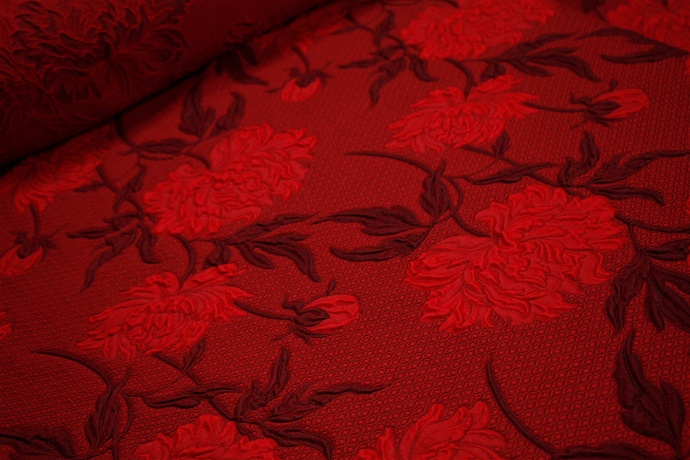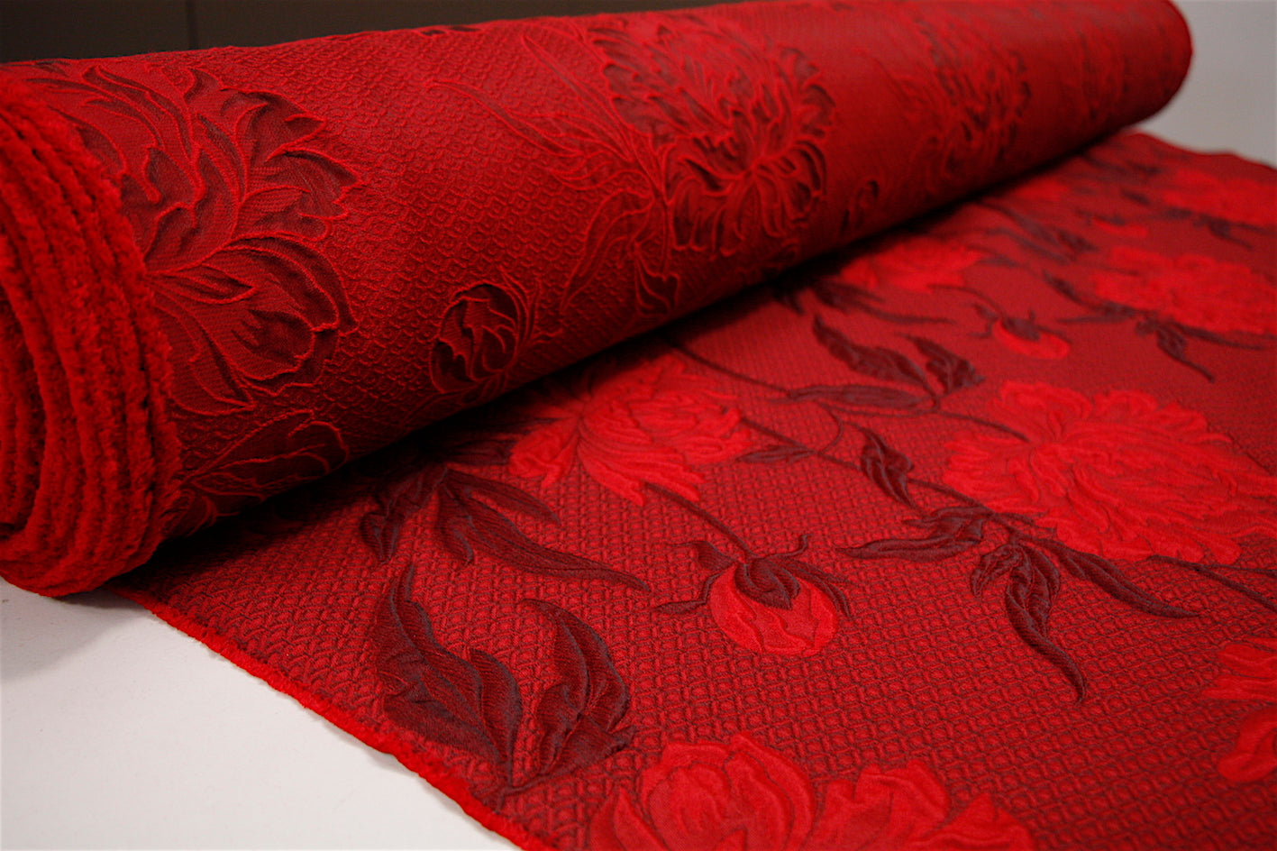 Italian designer red/garnet/oxblood floral 44% wool 44% acetate 8% silk 4% polyamide floral jacquard . Width: 145cm