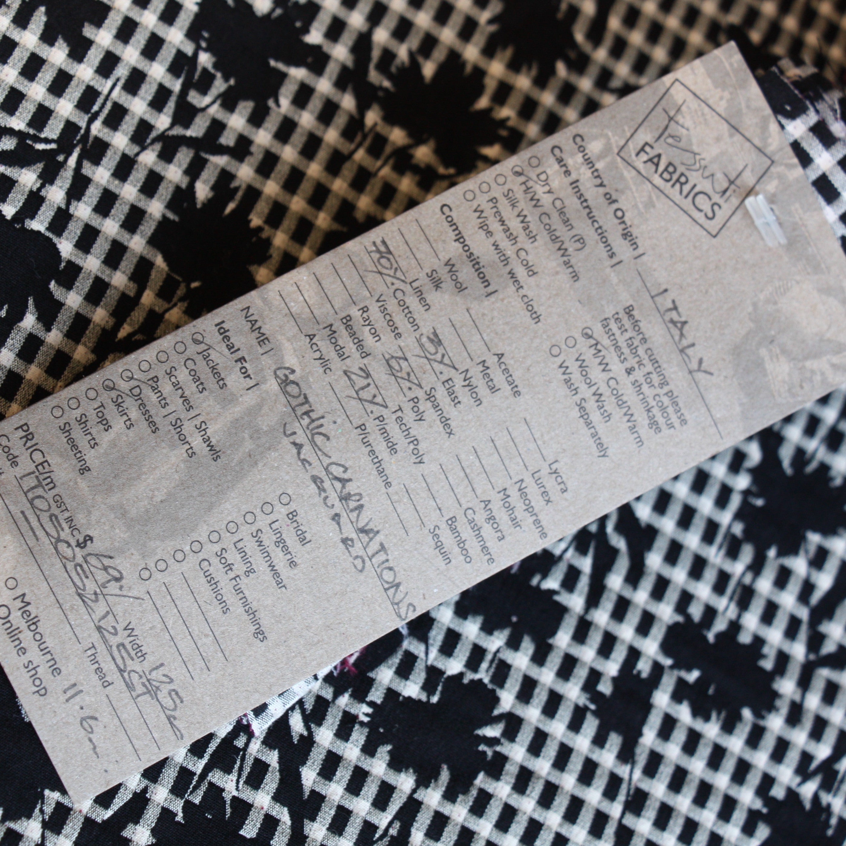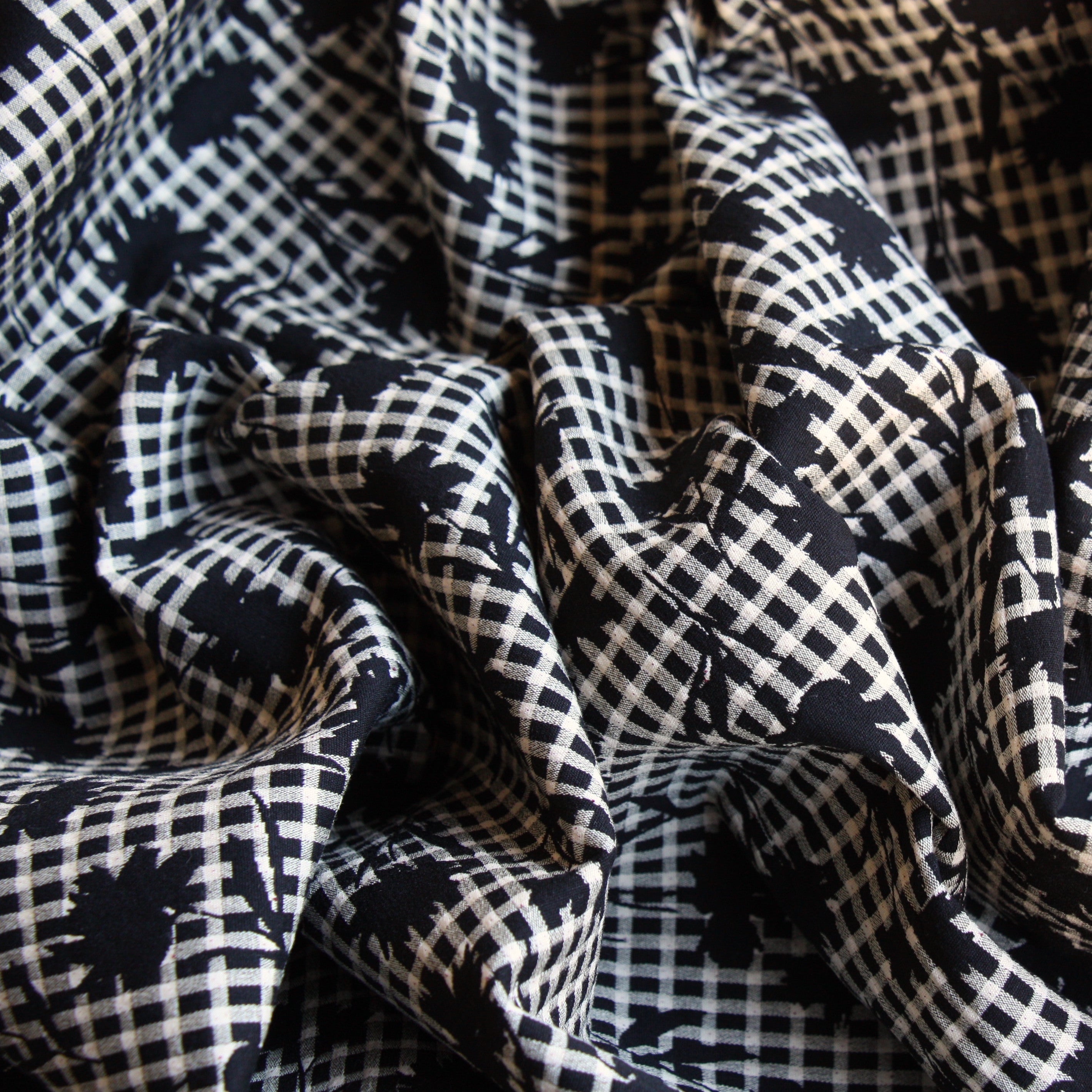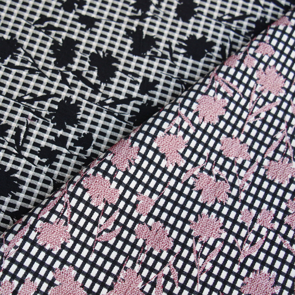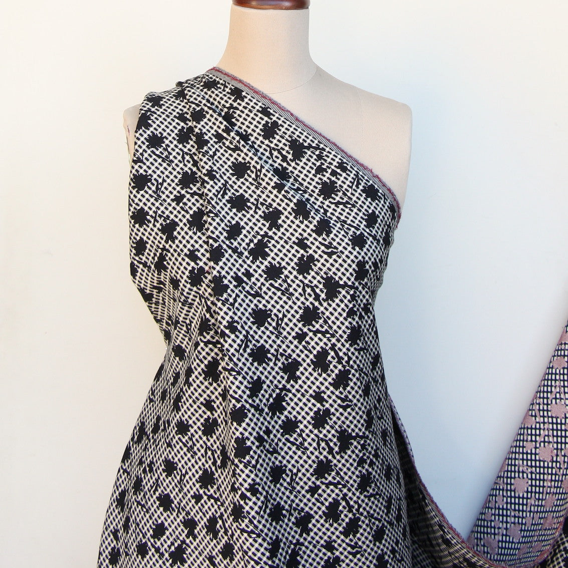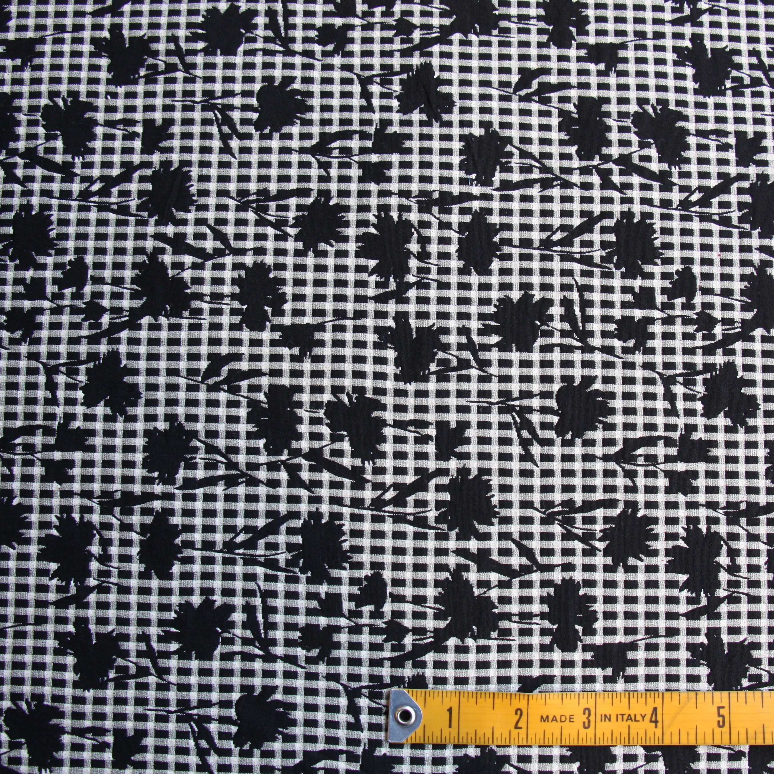 Designer Italian 70% cotton 21% polyamide 6% polyester 3% elastane cream/black check with black/dark red floral stretch jacquard.