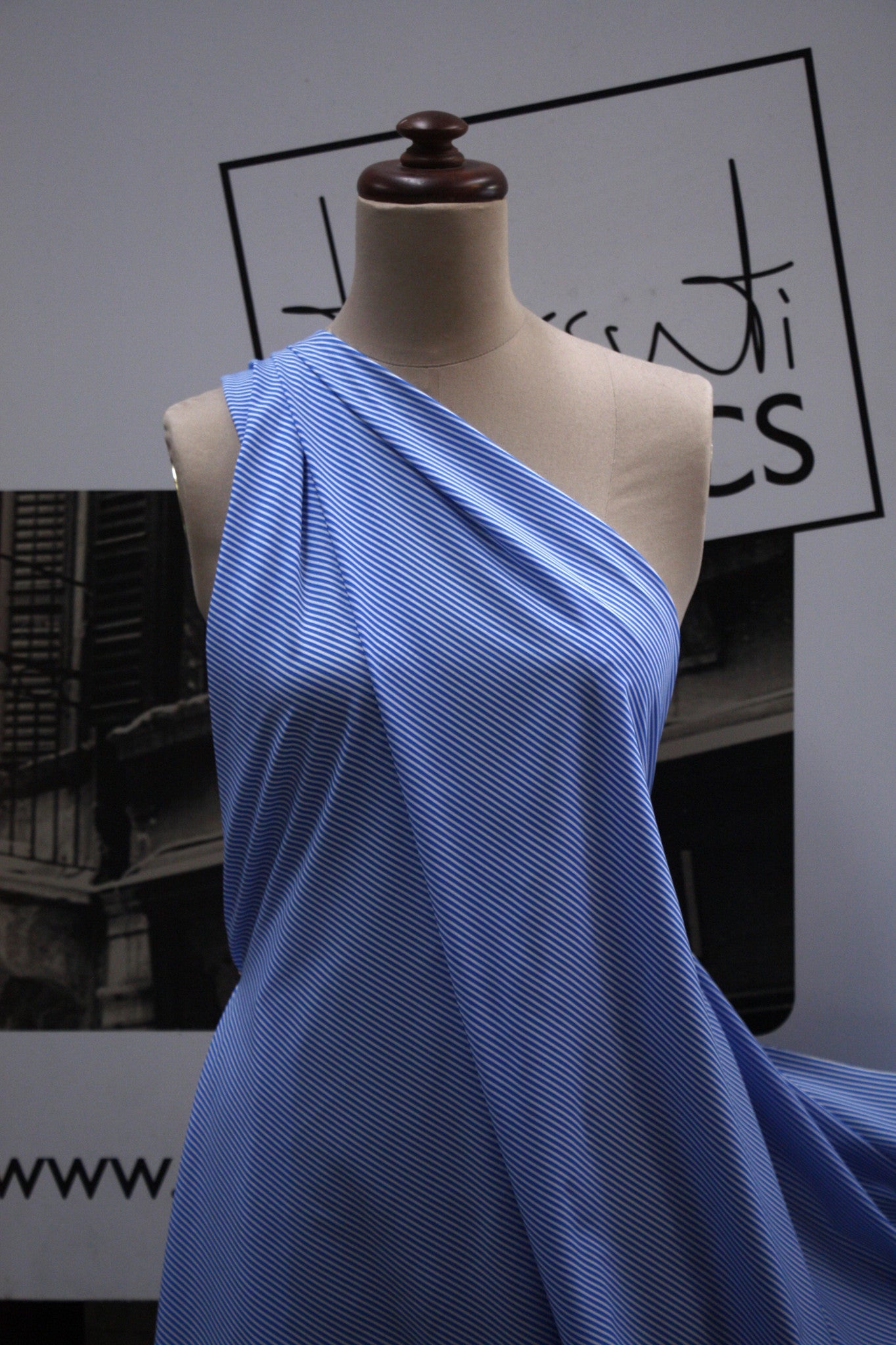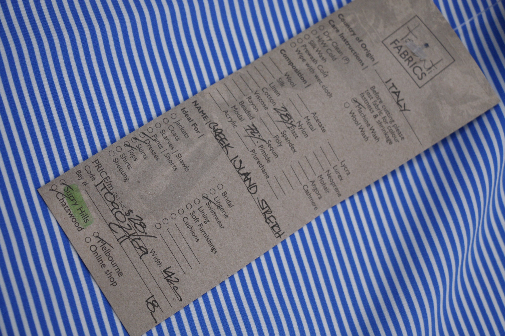 Designer Italian blue striped 72% Polyamide 23% Spandex swimwear fabric. Width:150cmAlso available in other colourways - Black Line, Greek Island and Mediterranean Stretch