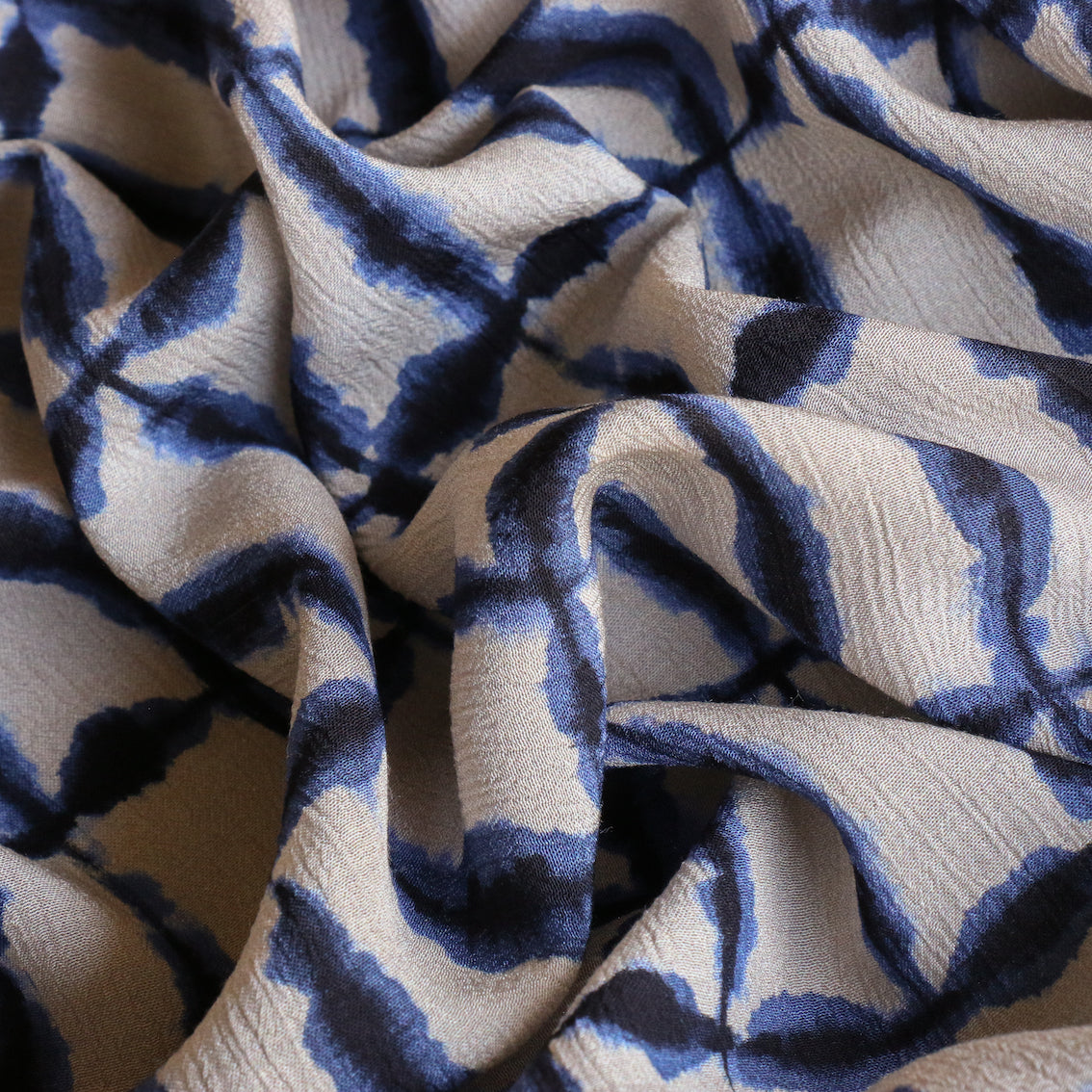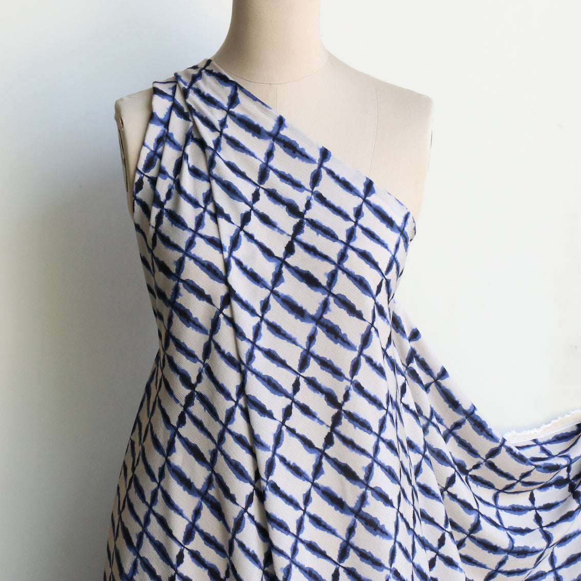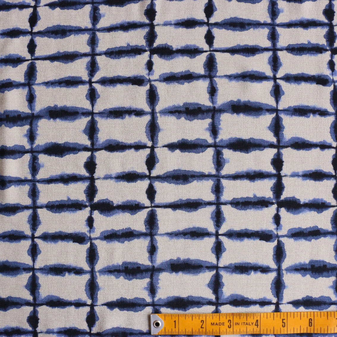 Italian tie-dye ink check on silver grey printed 100% viscose crinkle