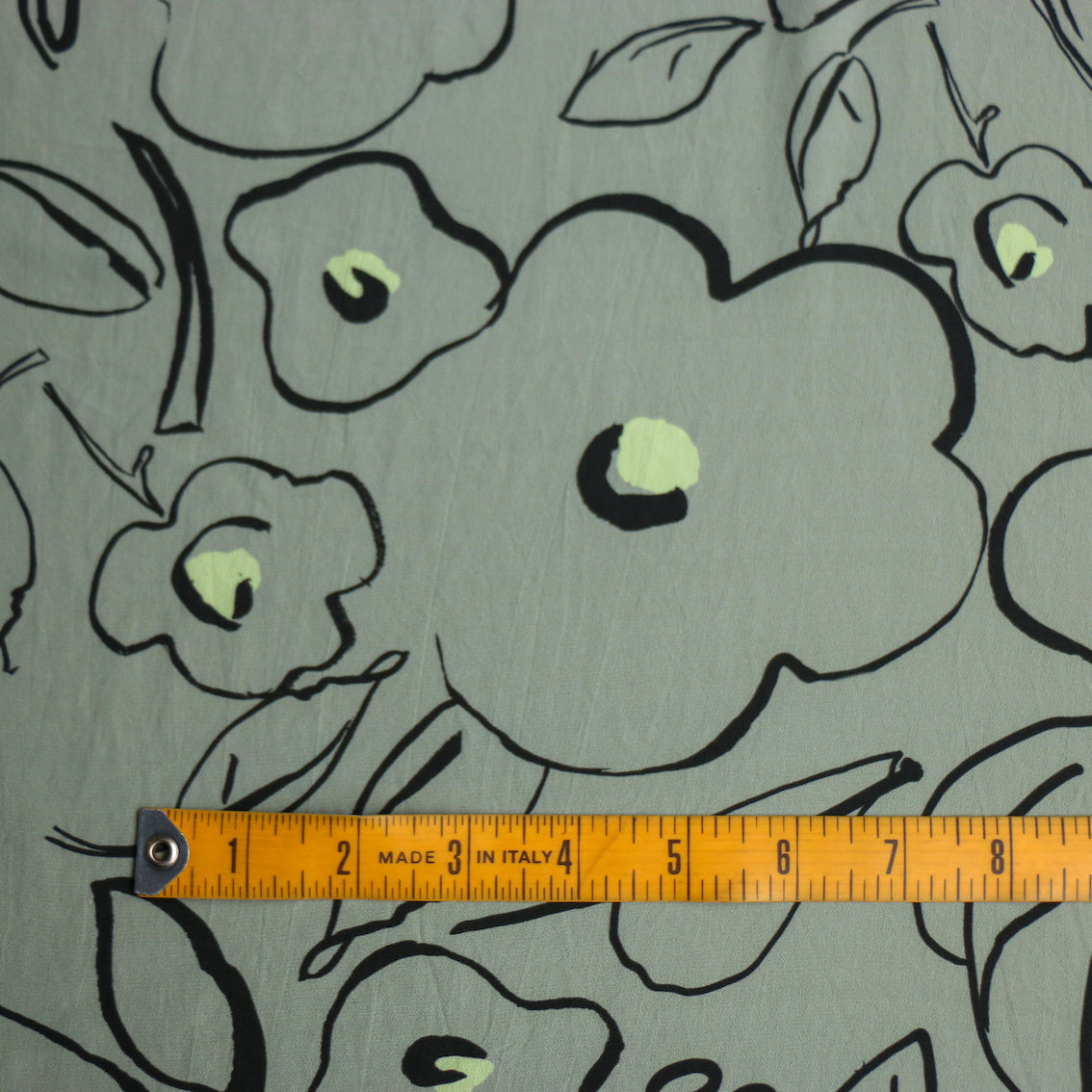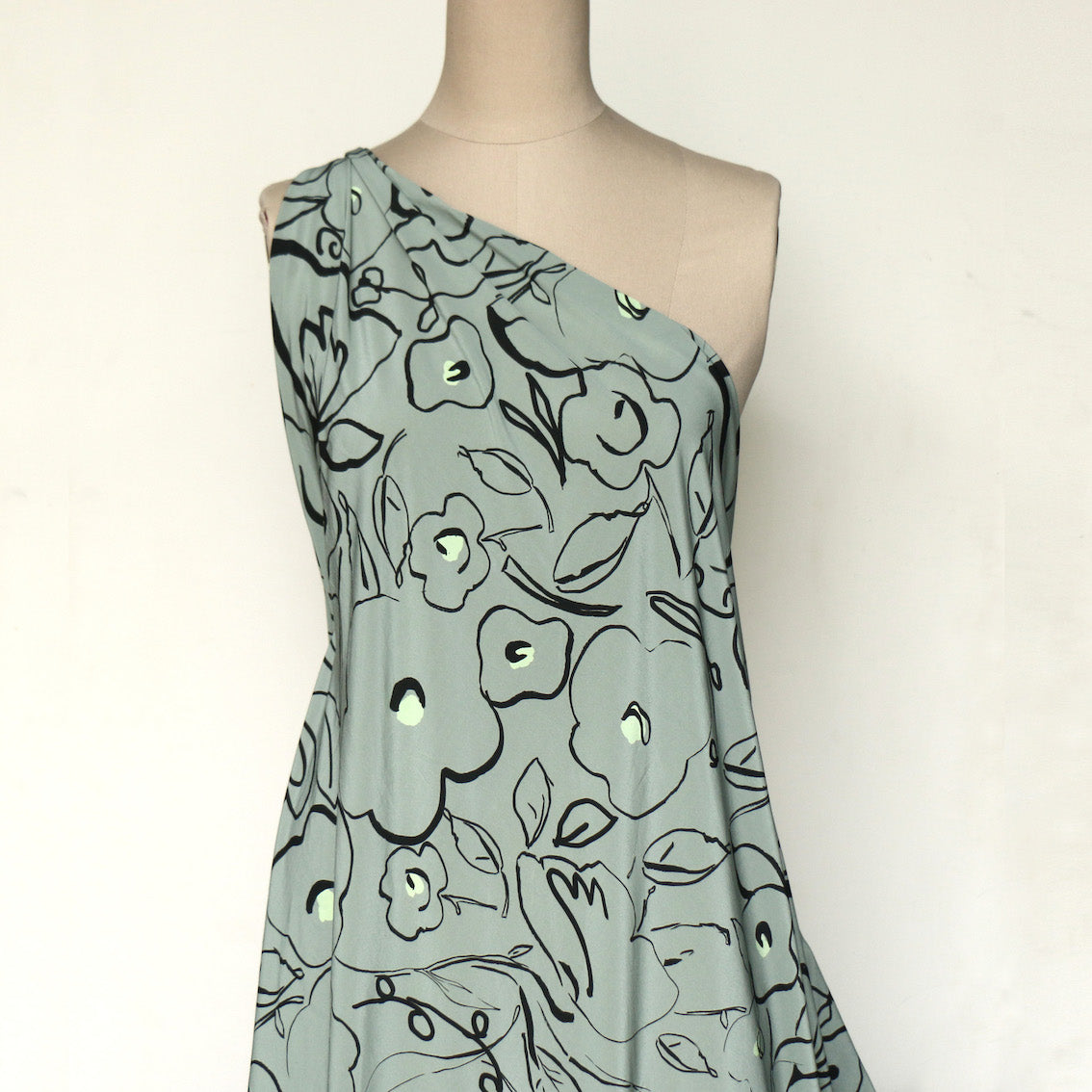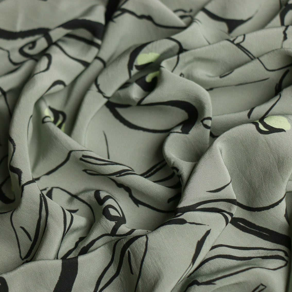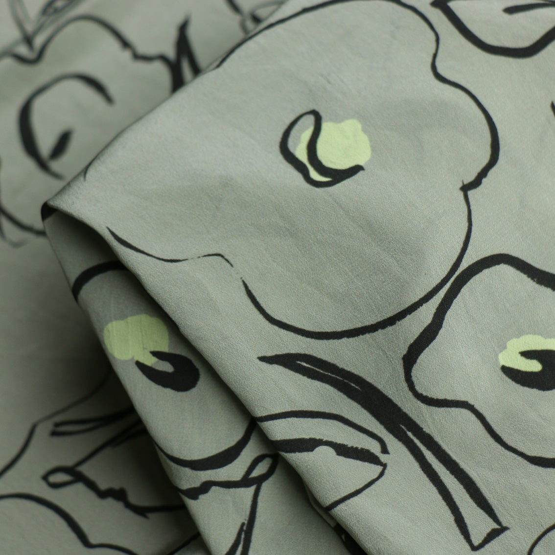 This water washed viscose uses filament yarn that is FSC (Forest Stewarship Council) certified and sustainable. After being digitally printed it is specially water washed which requires a separate process in a special machine giving the fabric an unrivaled hand feel for viscose. This process also limits shrinkage. Due to this base having a special finish, the shrinkage to hand washing will be limited to around 3%.