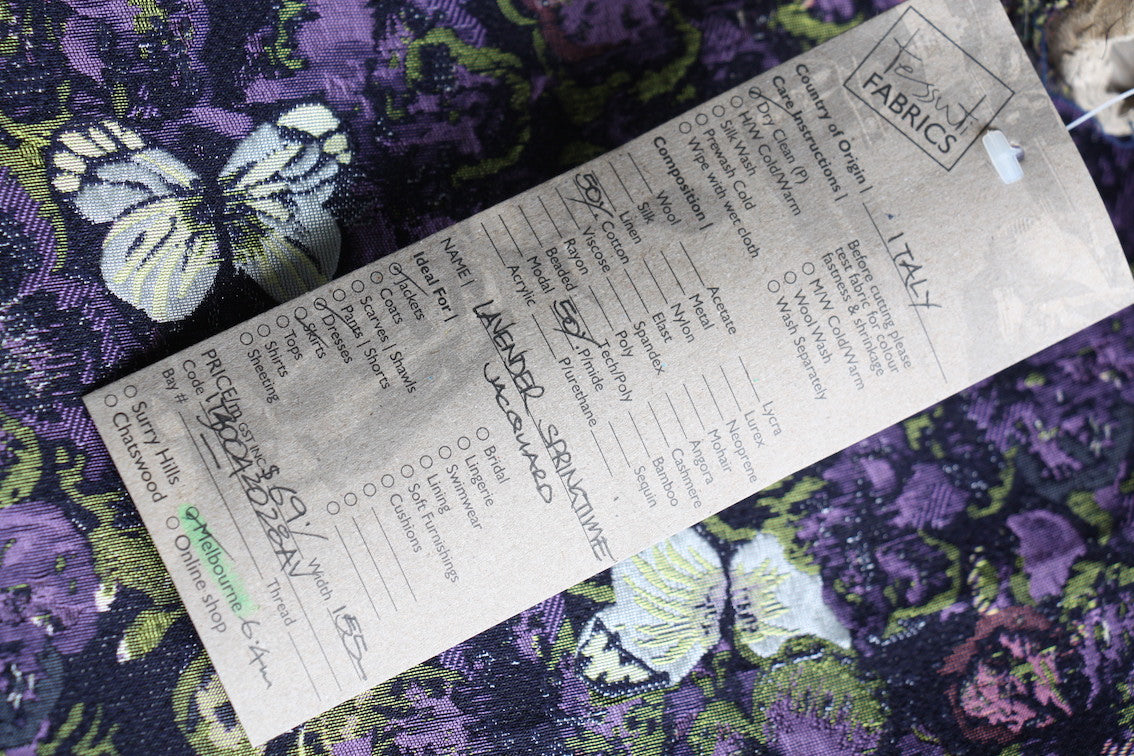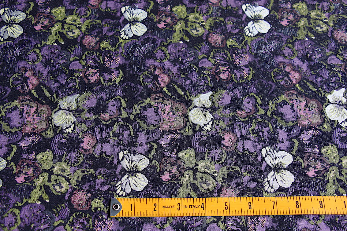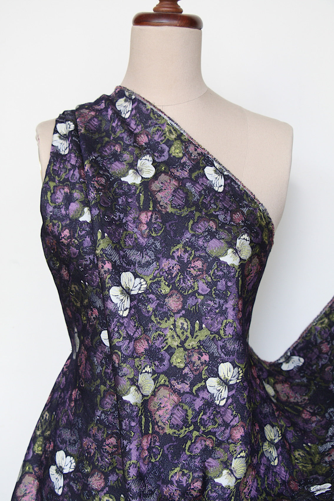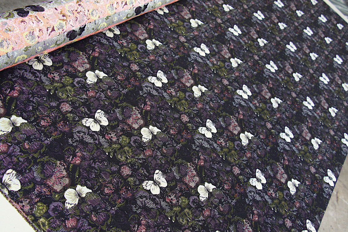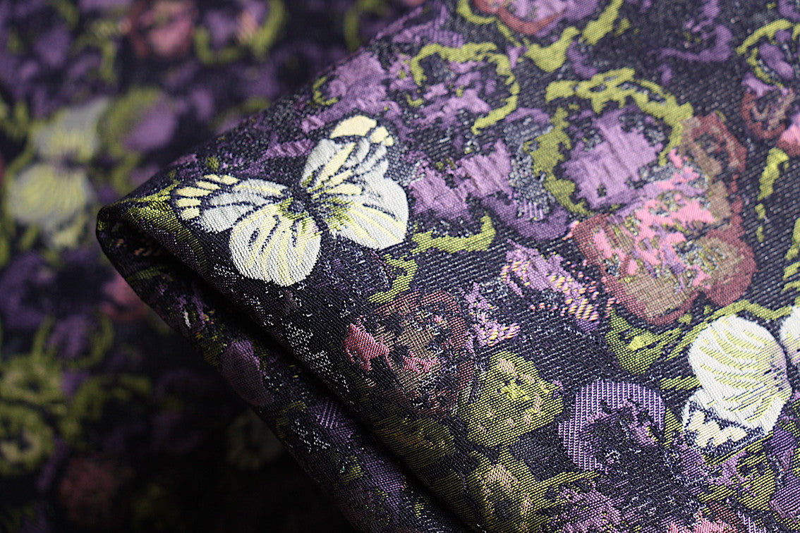 Navy/purple/green butterfly 50% cotton 50% polymide jacquard. Width: 155cm