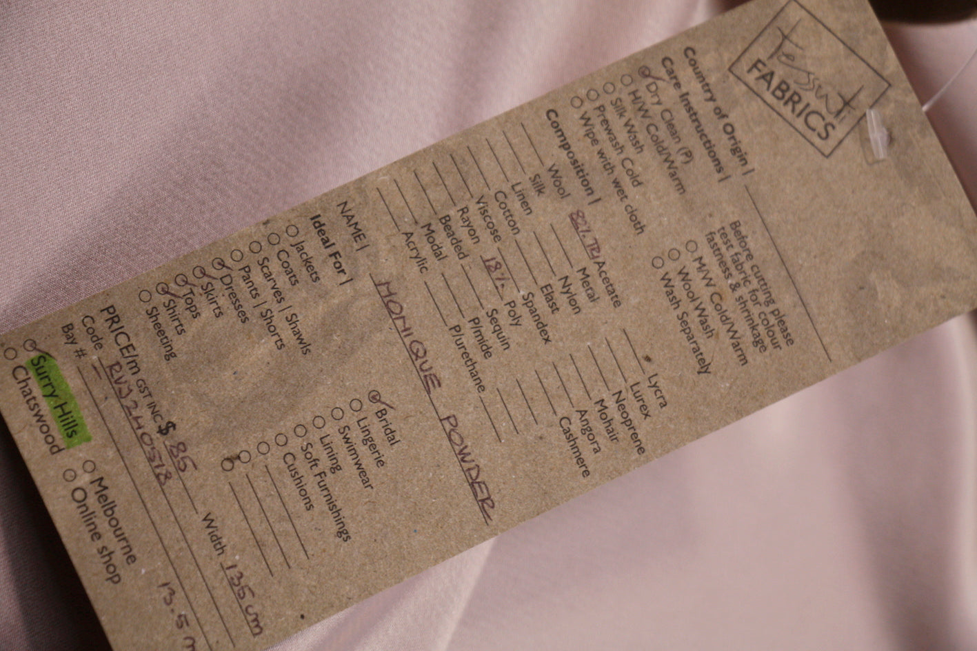 Powder pink satin backed 82% acetate 18% polyester. Width: 135cm