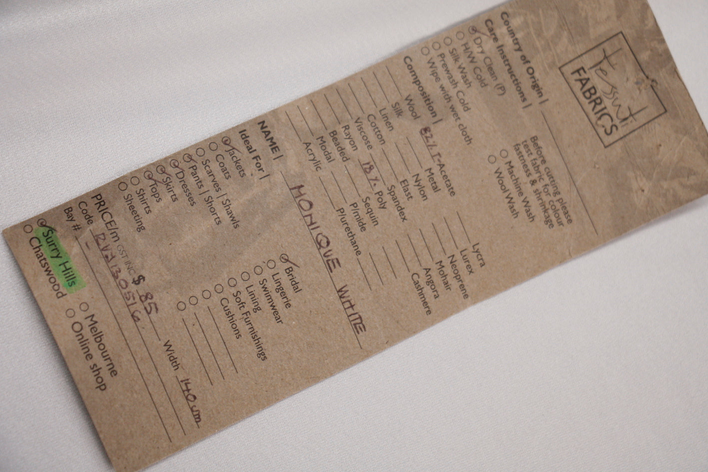 White satin backed 82% acetate 18% polyester. Width: 135cm