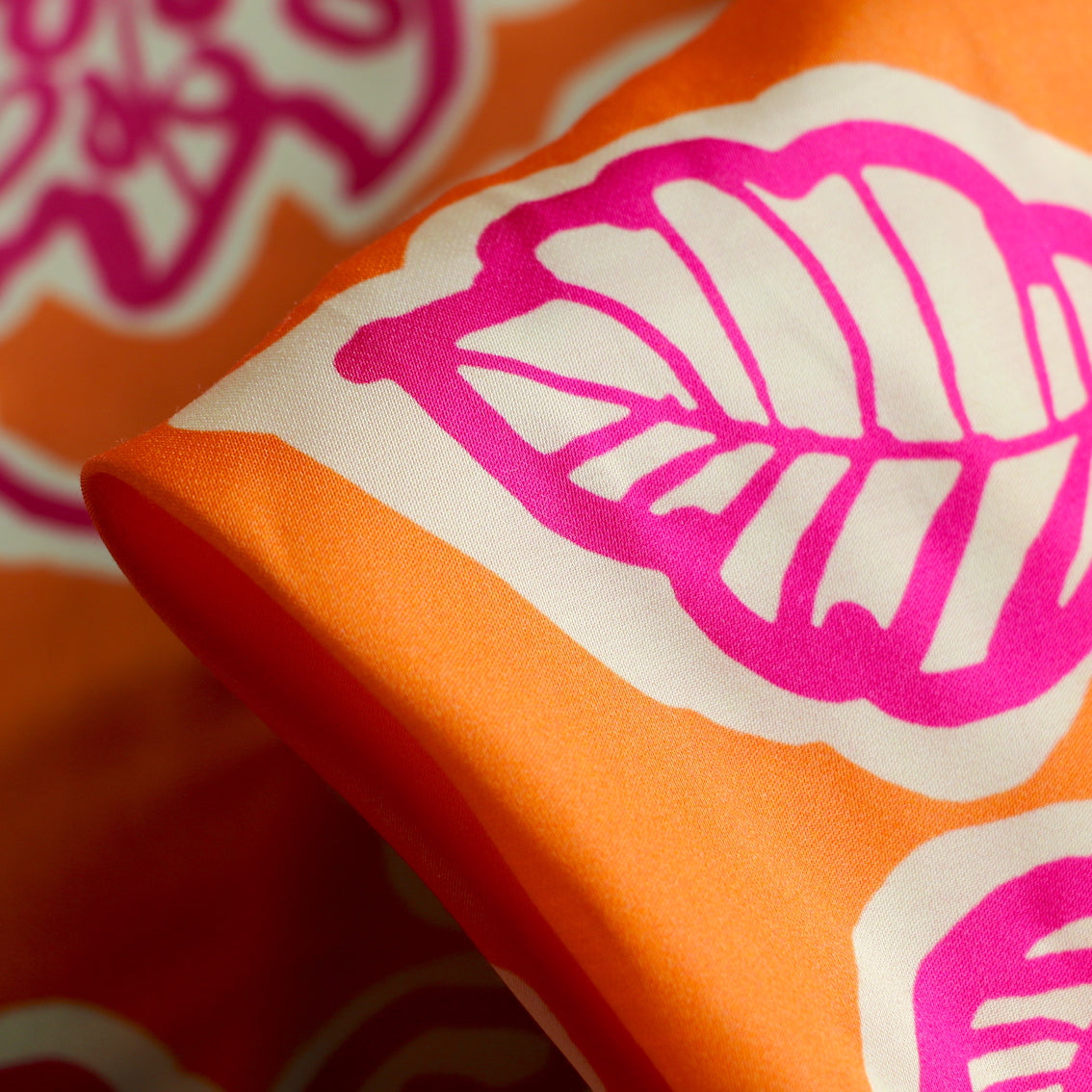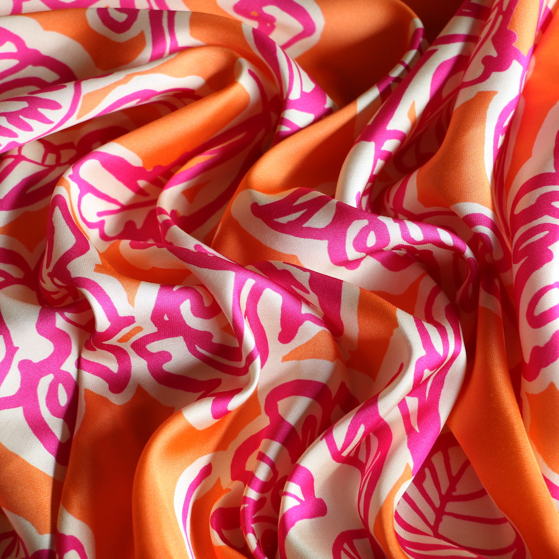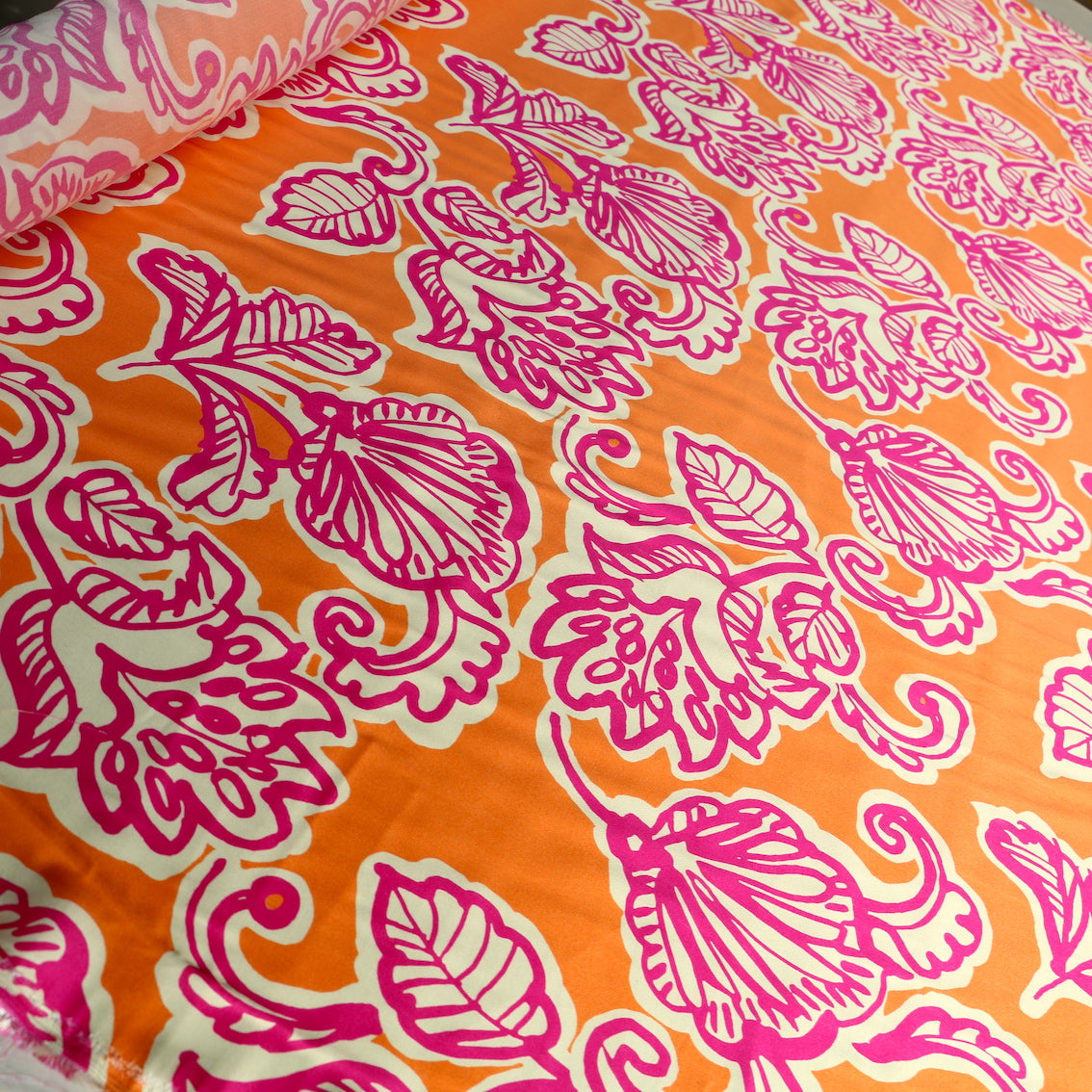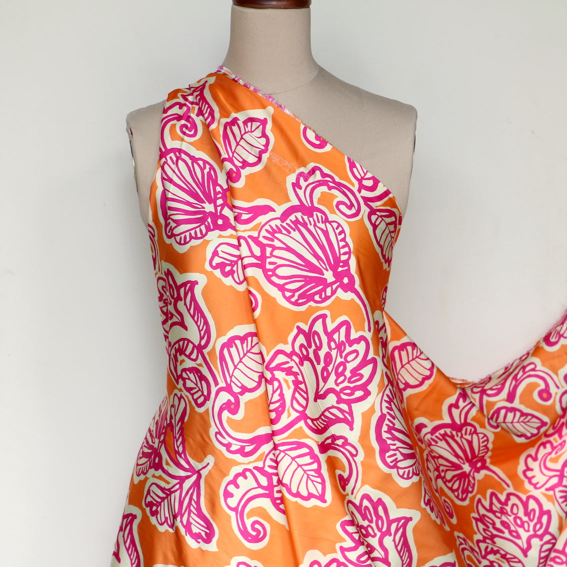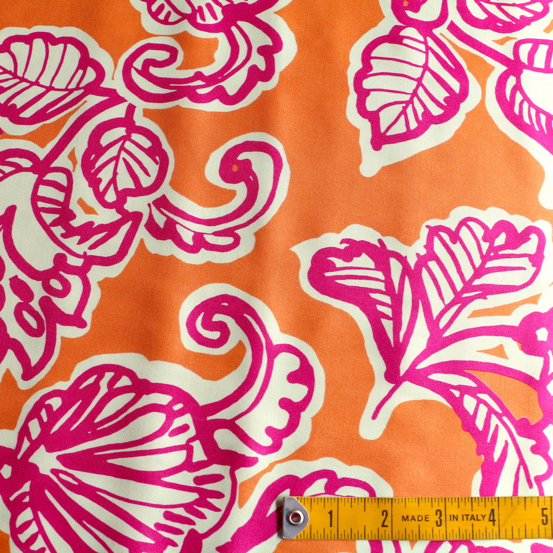 Italian designer orange/ivory/fuschia floral printed 51% viscose 49% rayon sateen