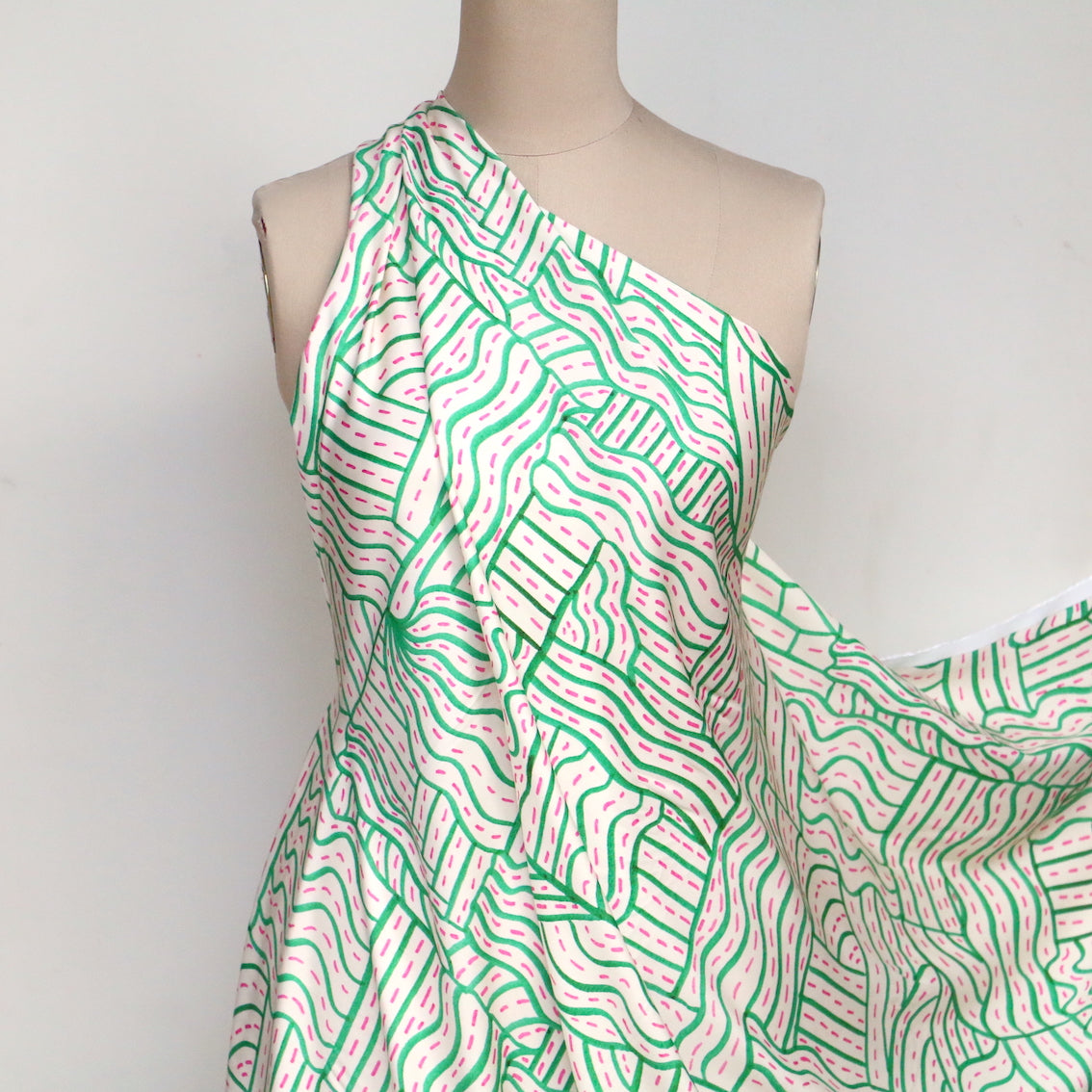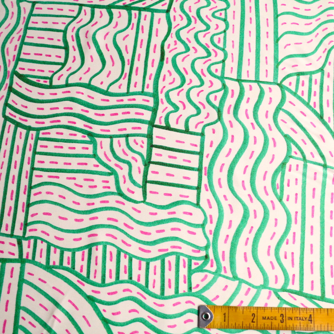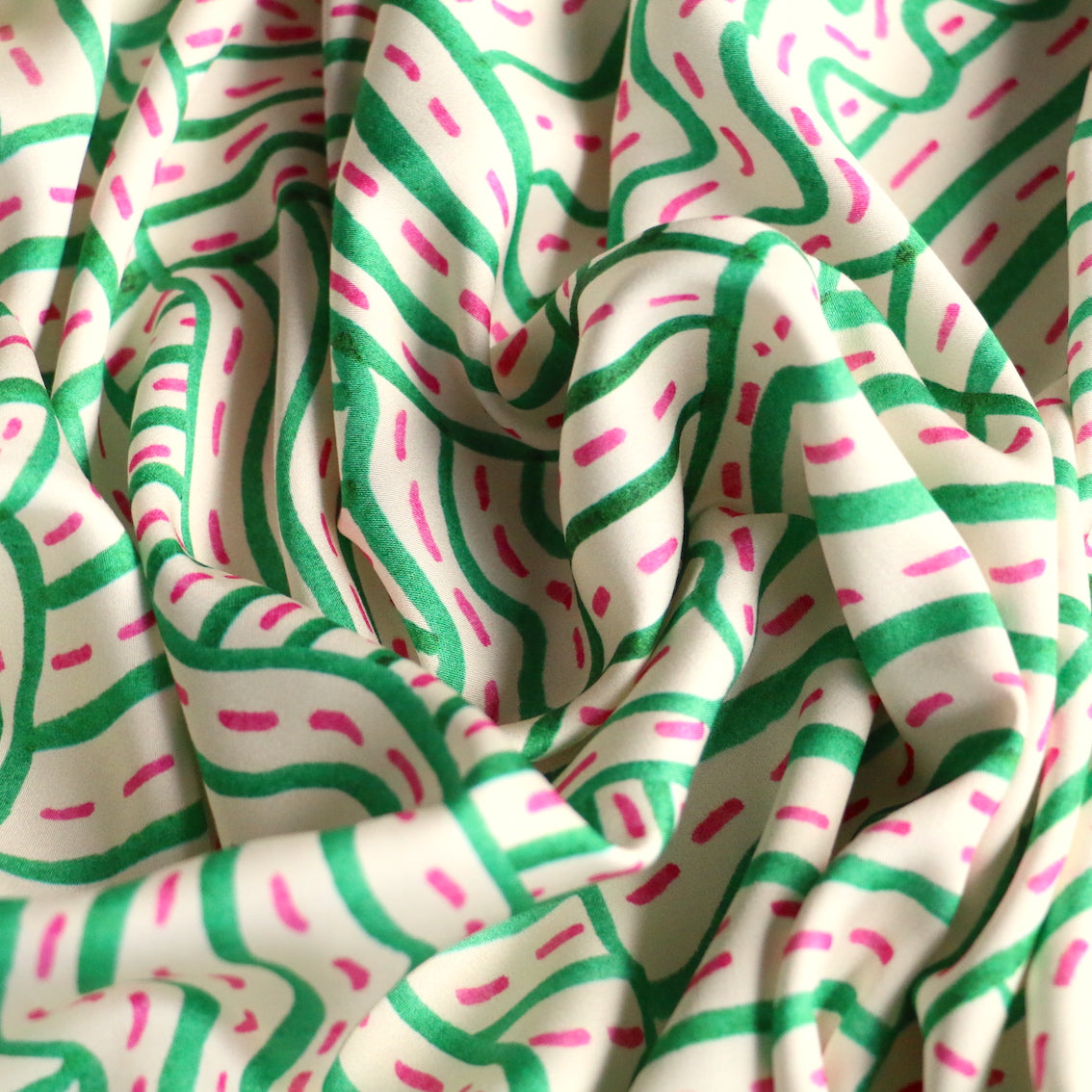 Italian designer green/pink strokes on butter cream printed 100% viscose twill sateen
