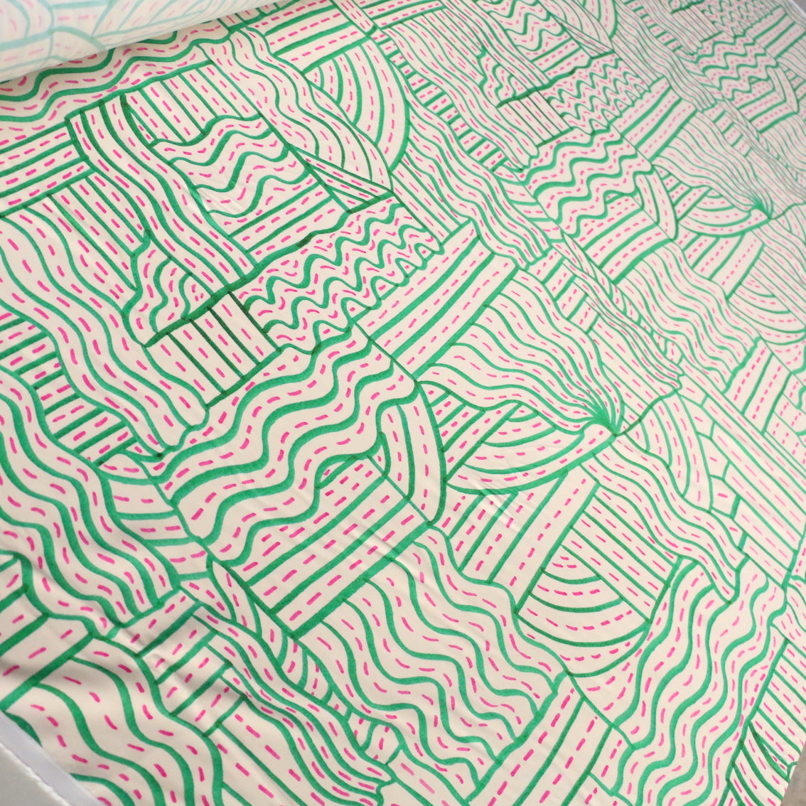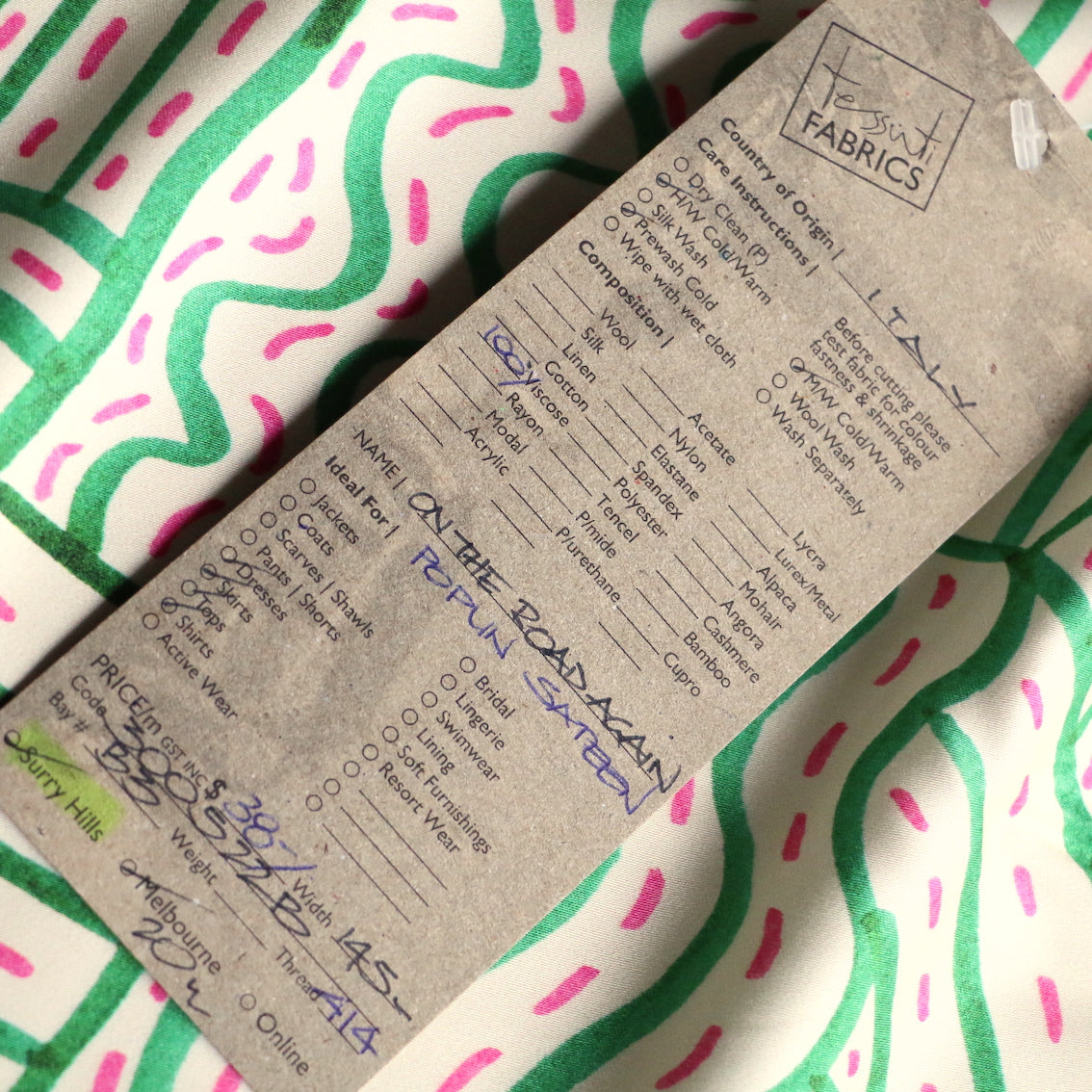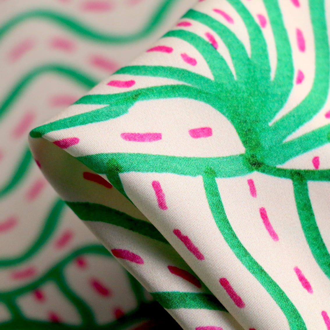 Italian designer green/pink strokes on butter cream printed 100% viscose twill sateen