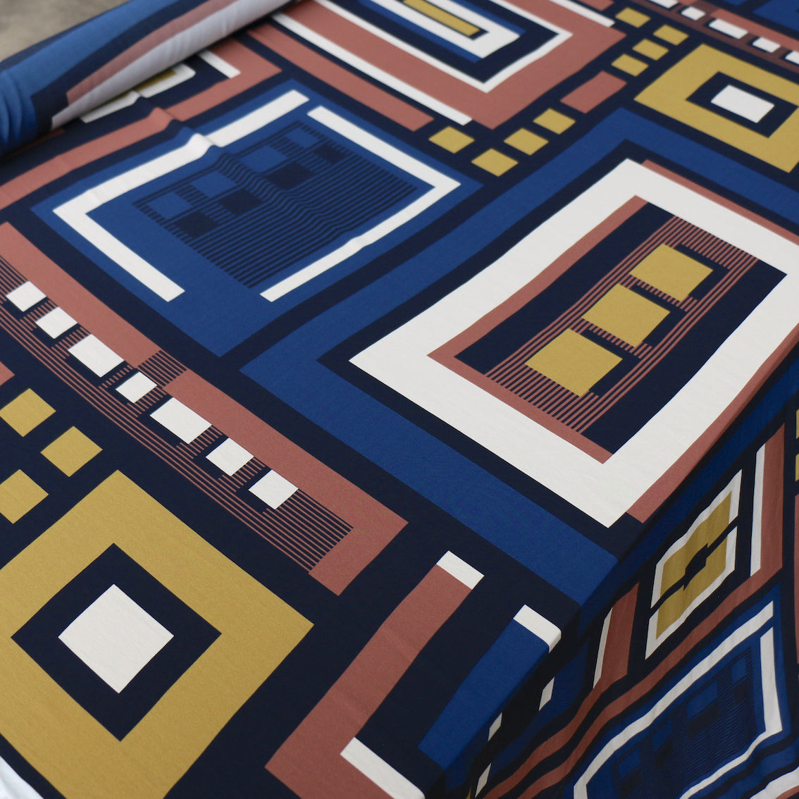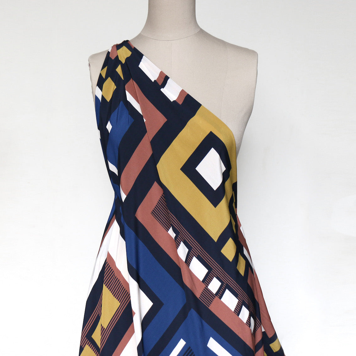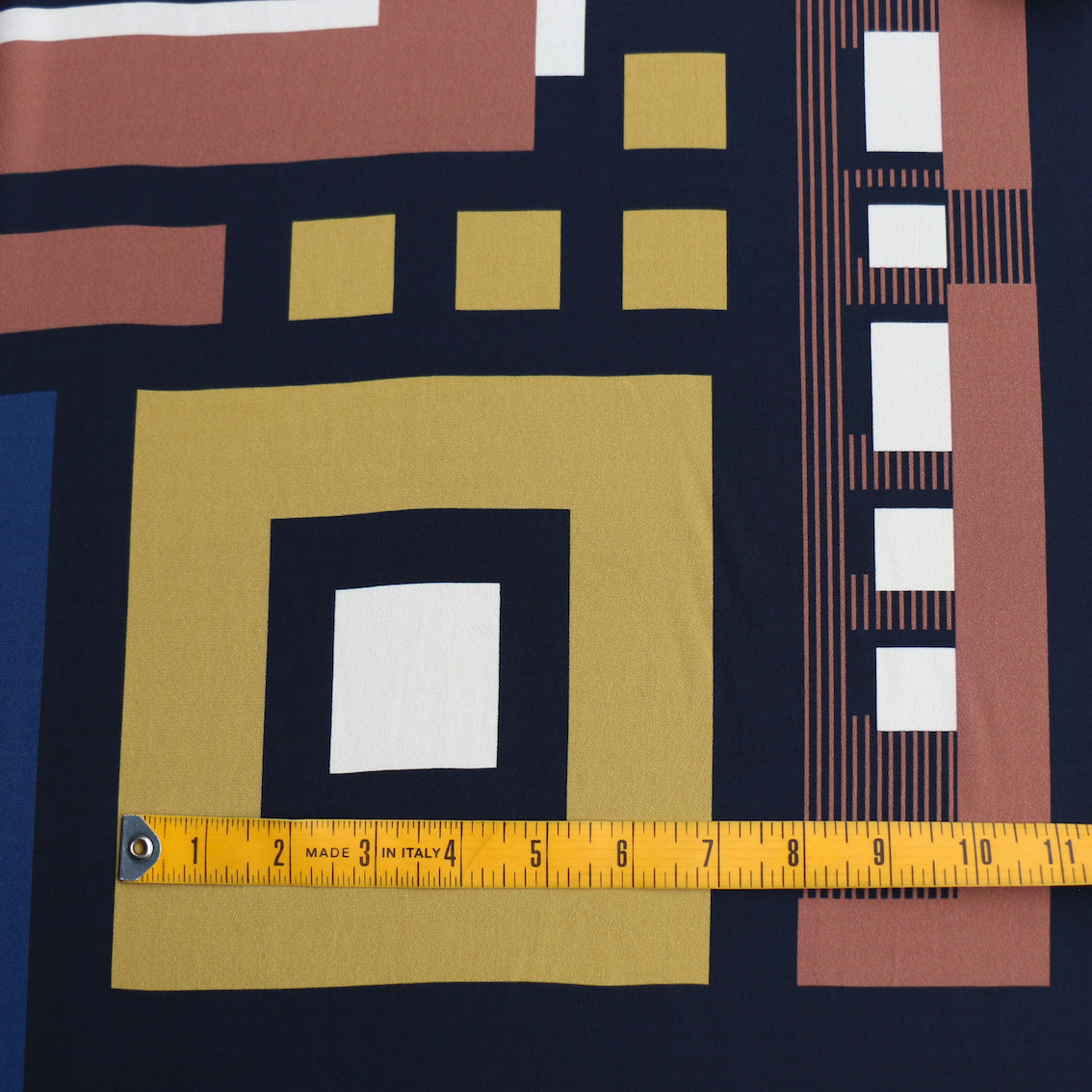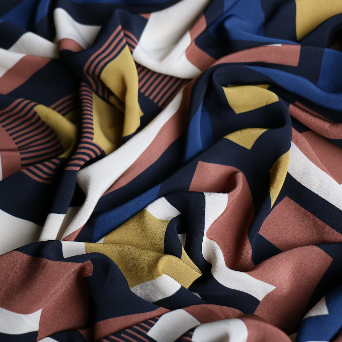Terracotta/gold/navy/black geometric printed 100% viscose crepe de chine