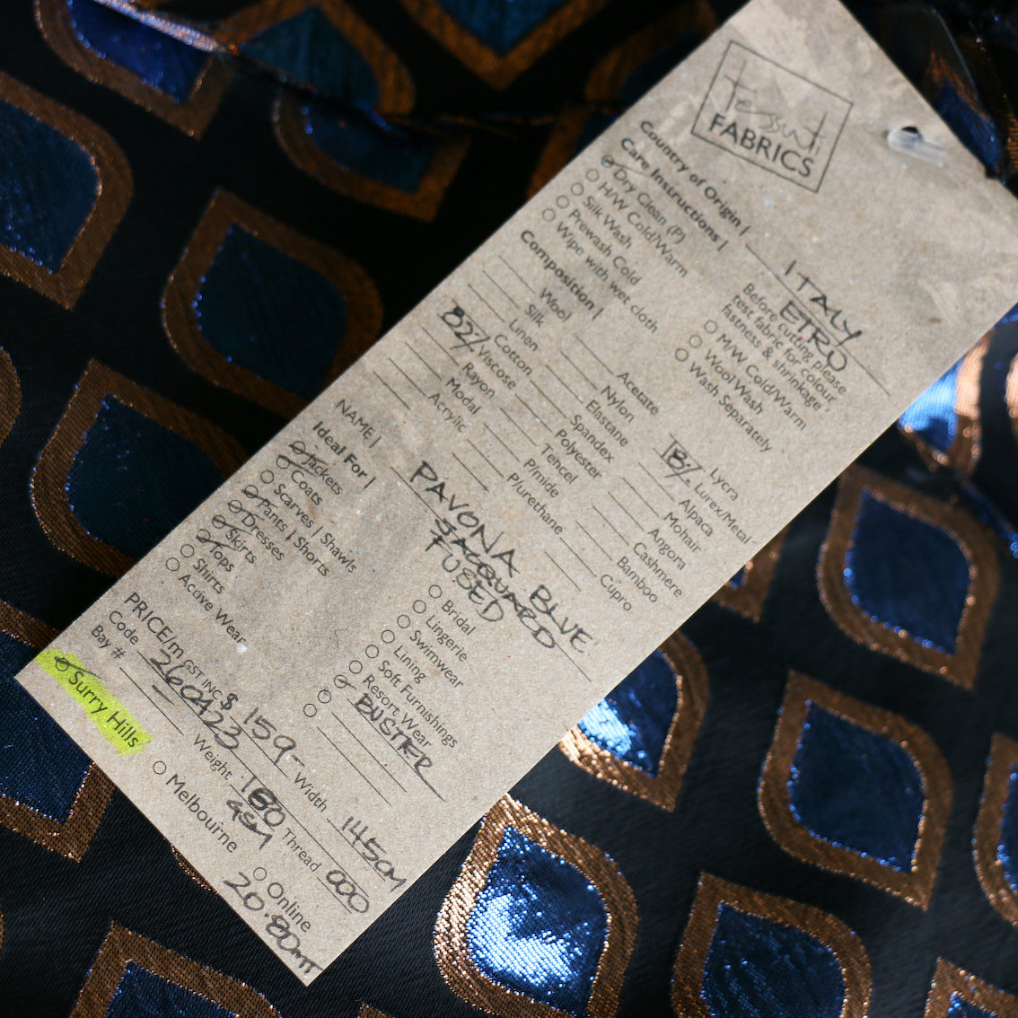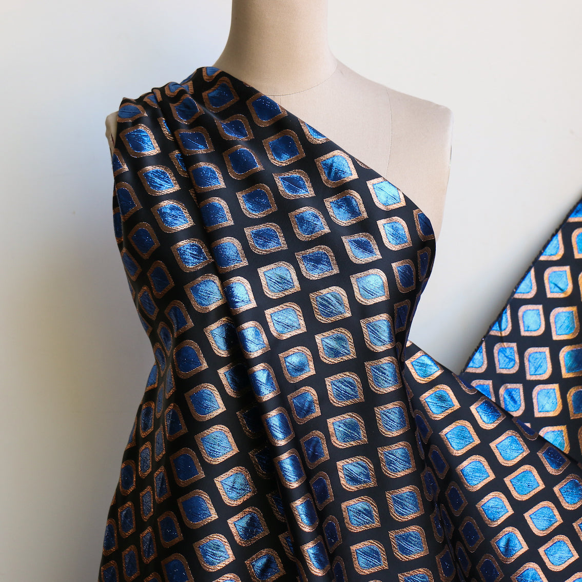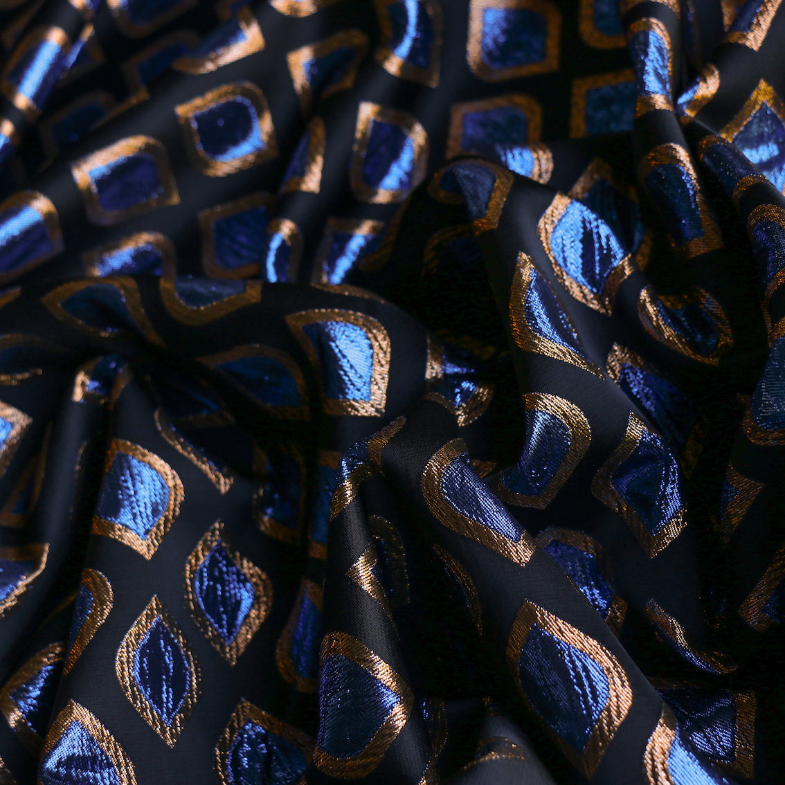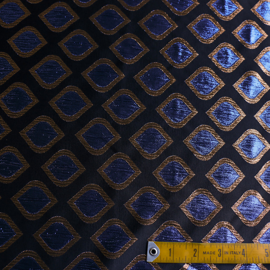 Italian designer black/metallic gold/metallic blue 82% viscose 18% lurex jacquard (with BVM60 fused backing)