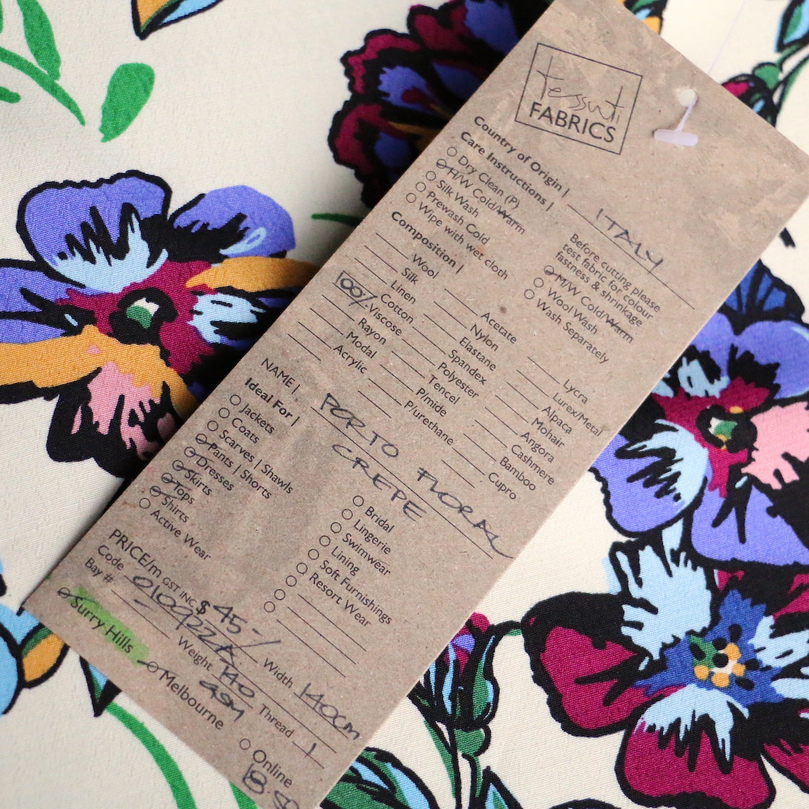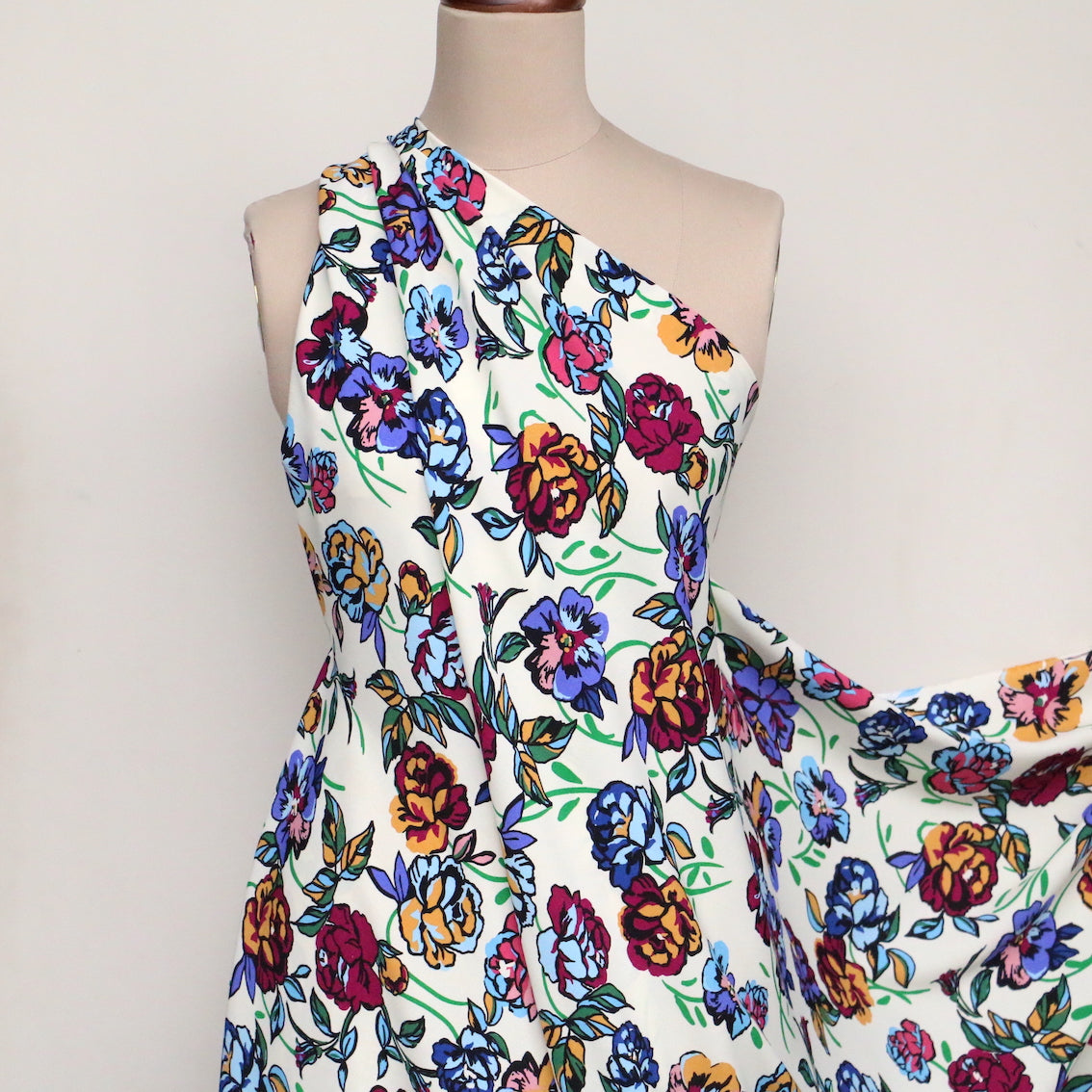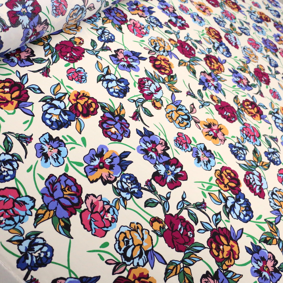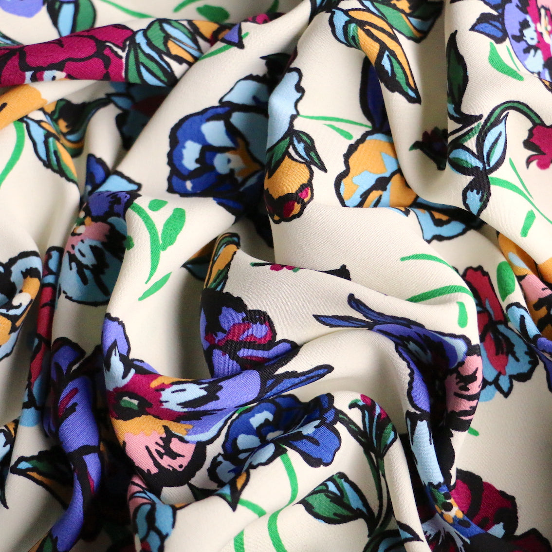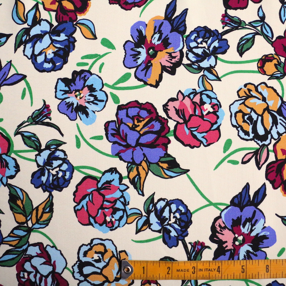 Italian designer cream/multi floral printed 100% viscose crepe