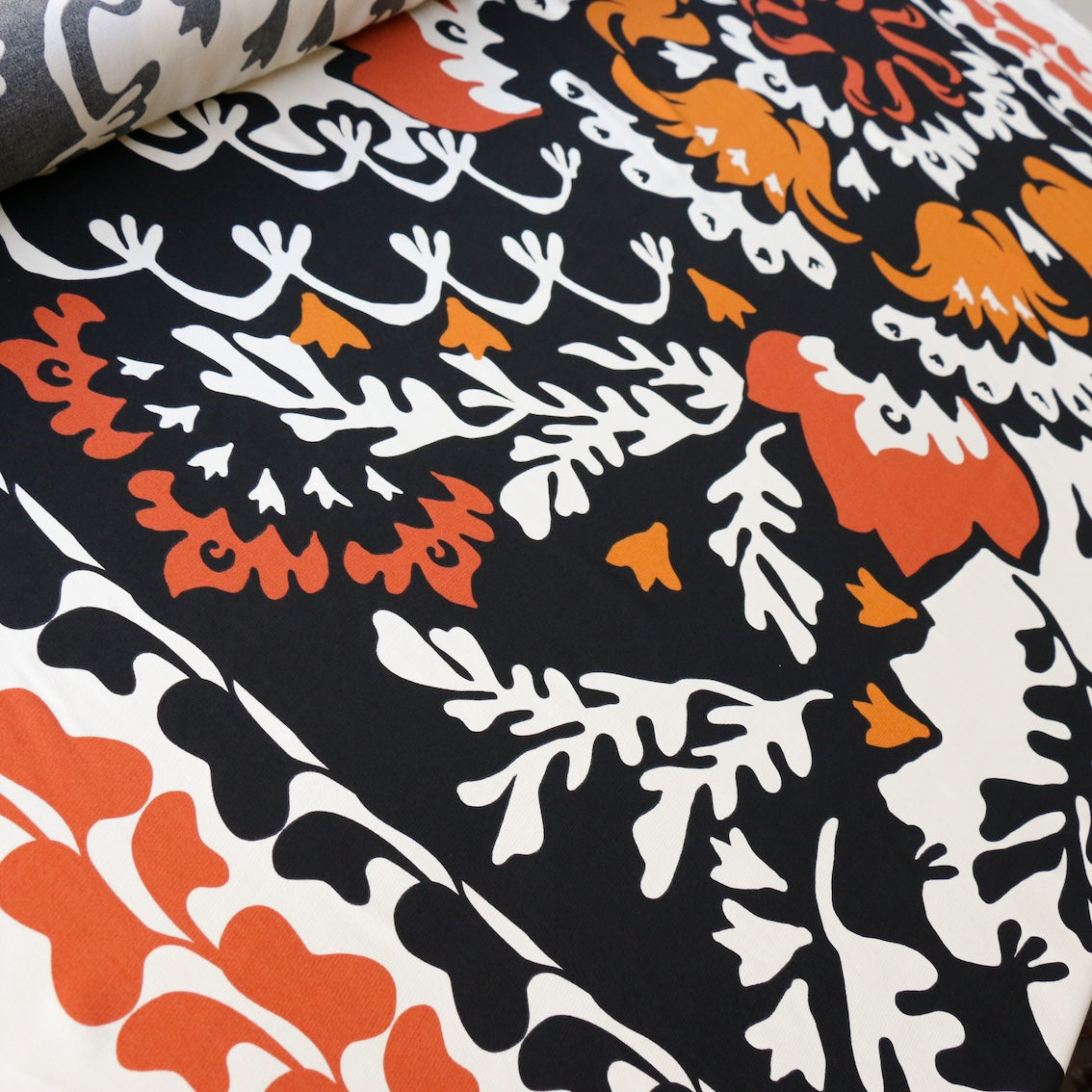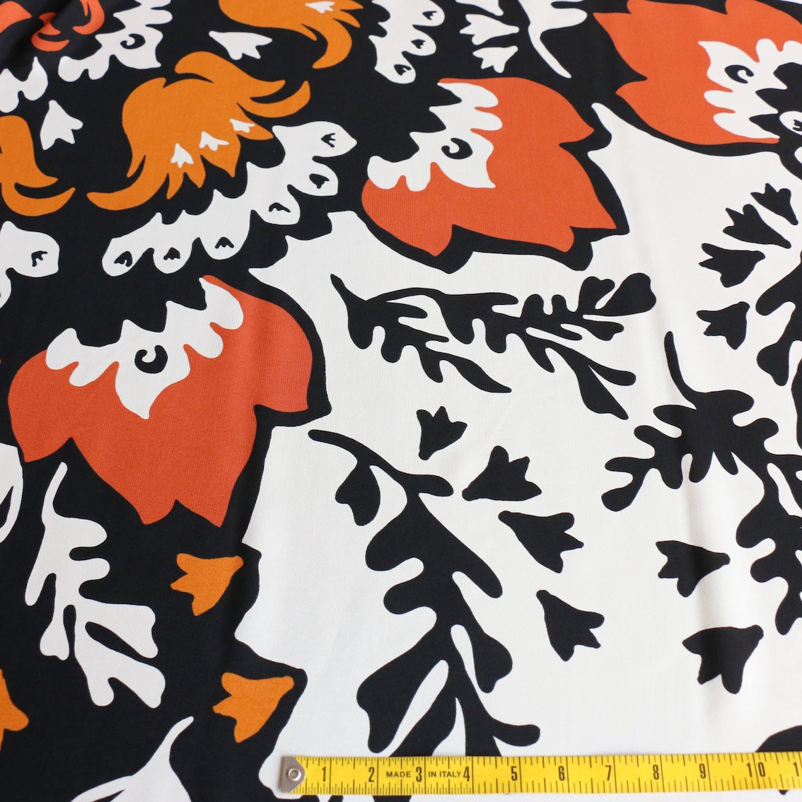 Italian tan/cream/black printed 100% viscose with border prints on both selvedge edges