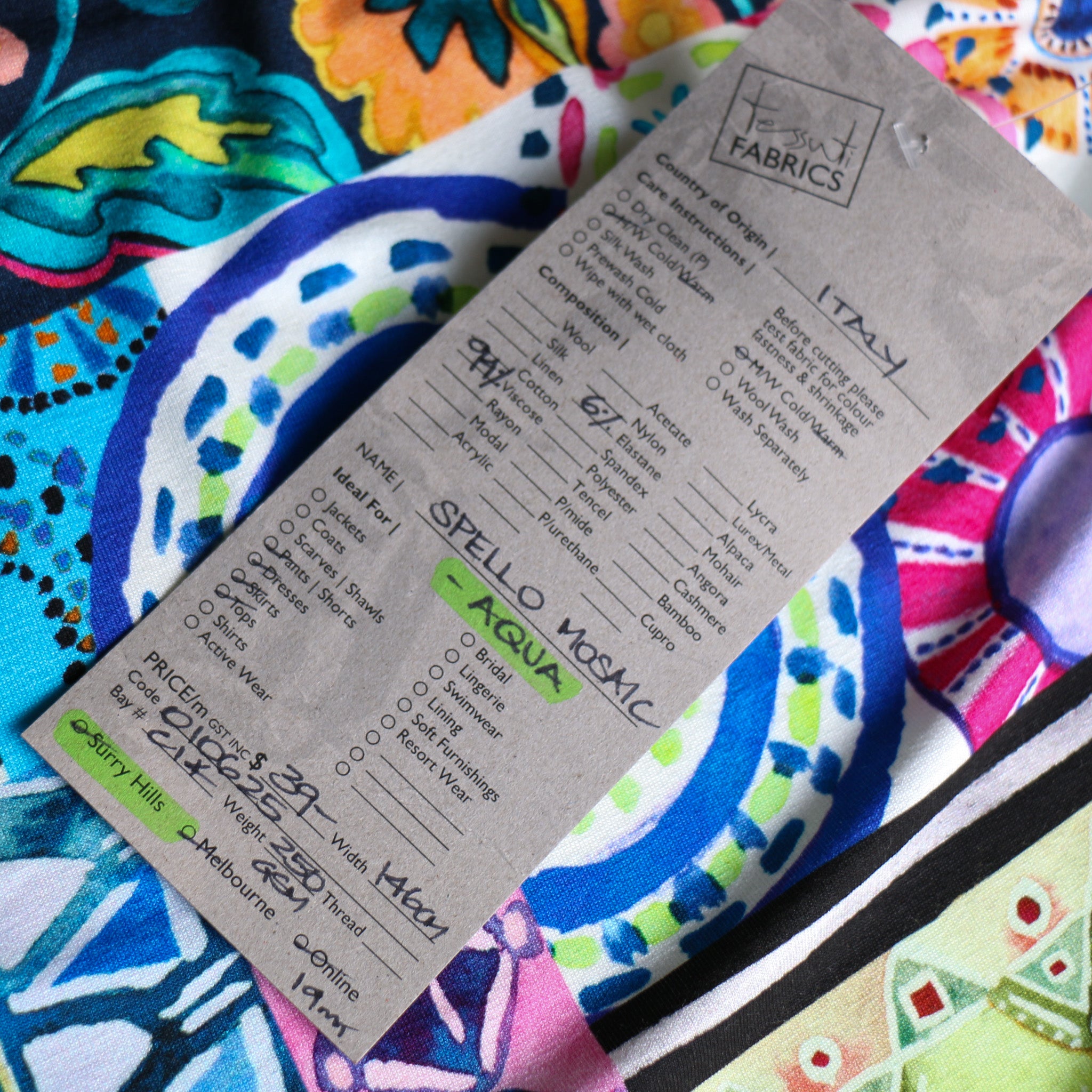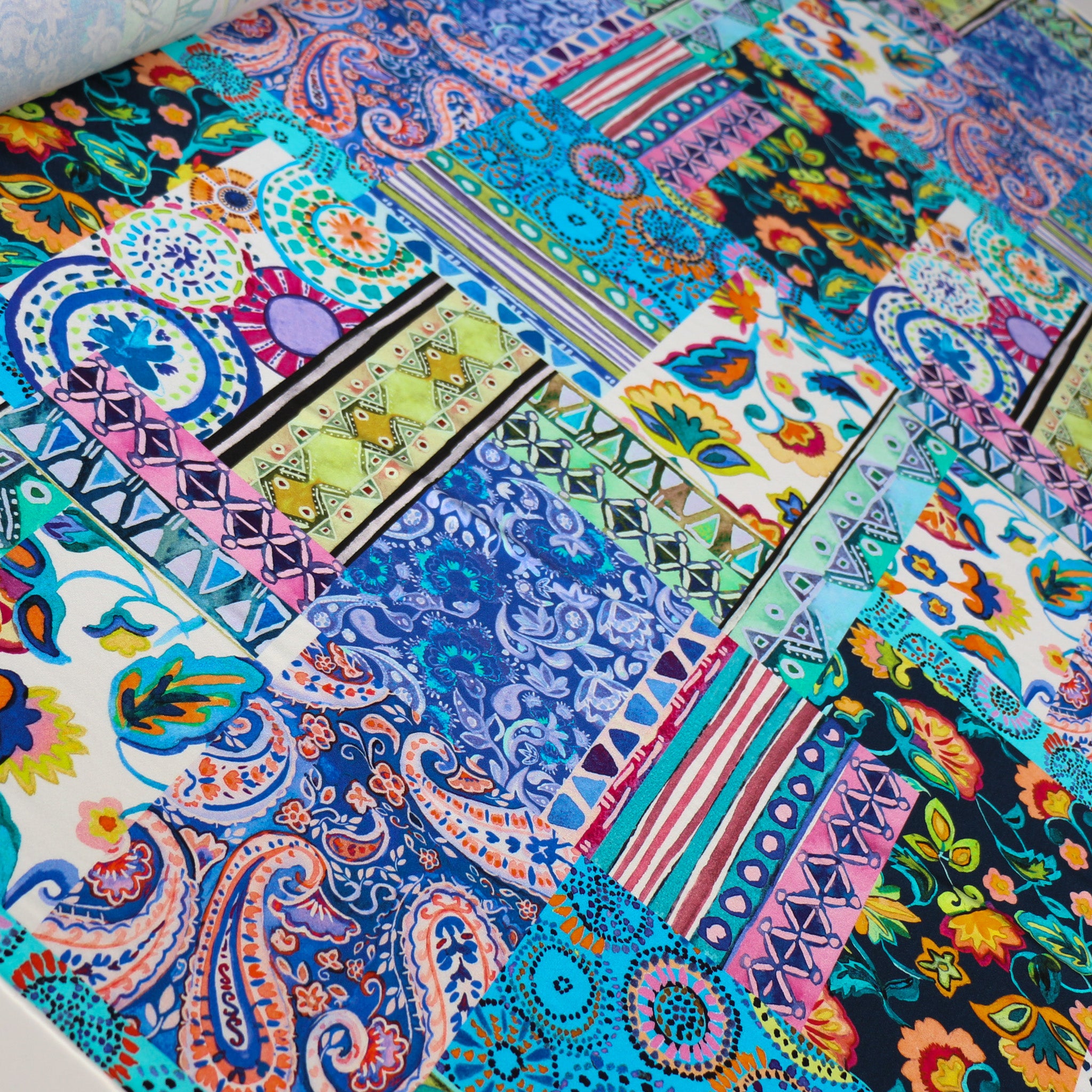 Italian blues/green multi patchwork printed 94% viscose 6% elastane jersey knit