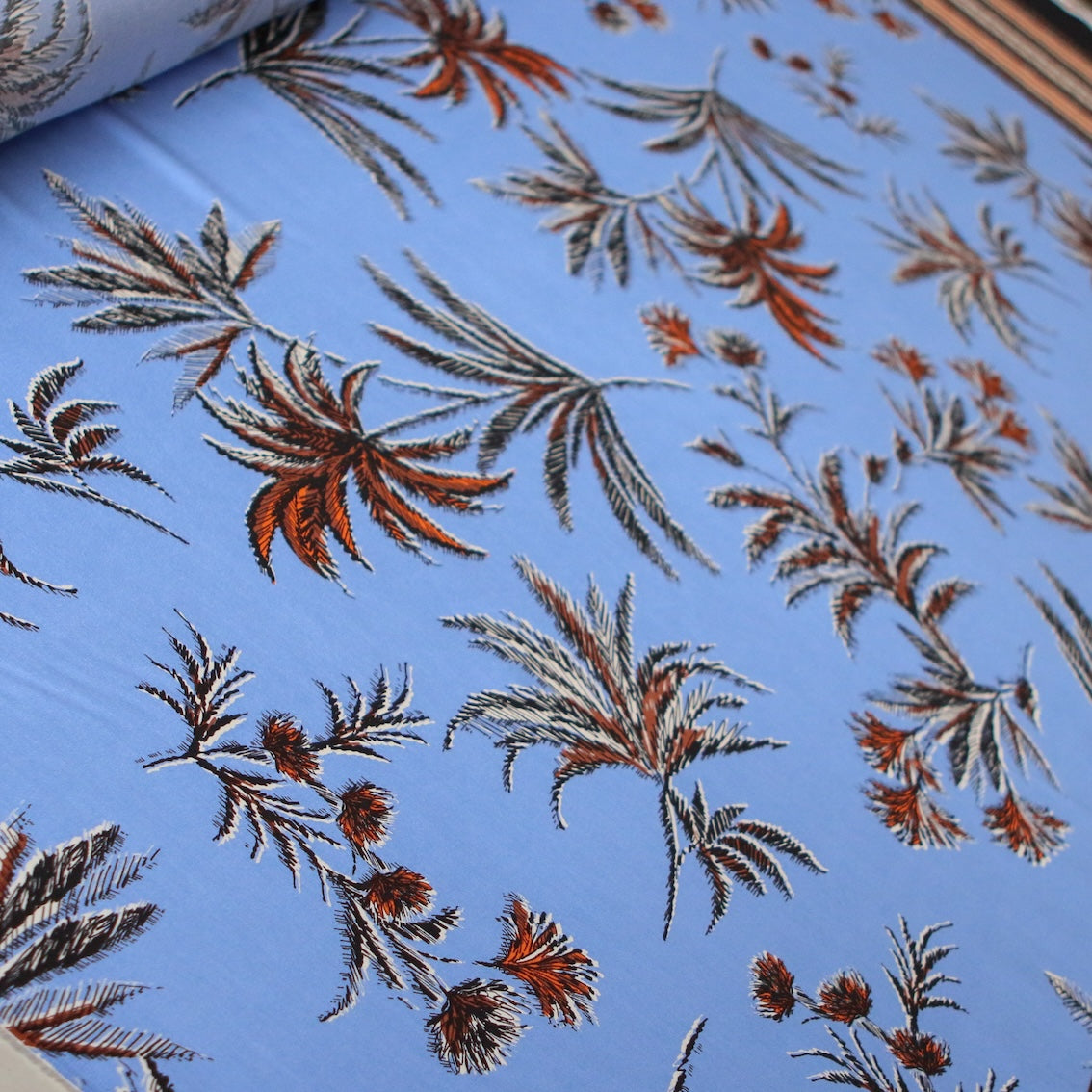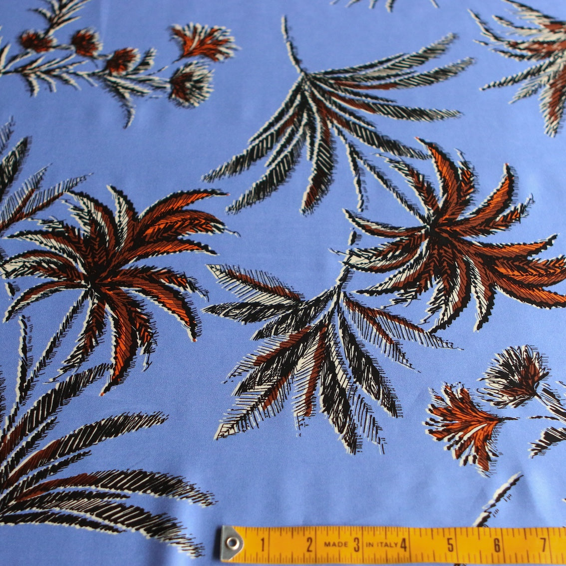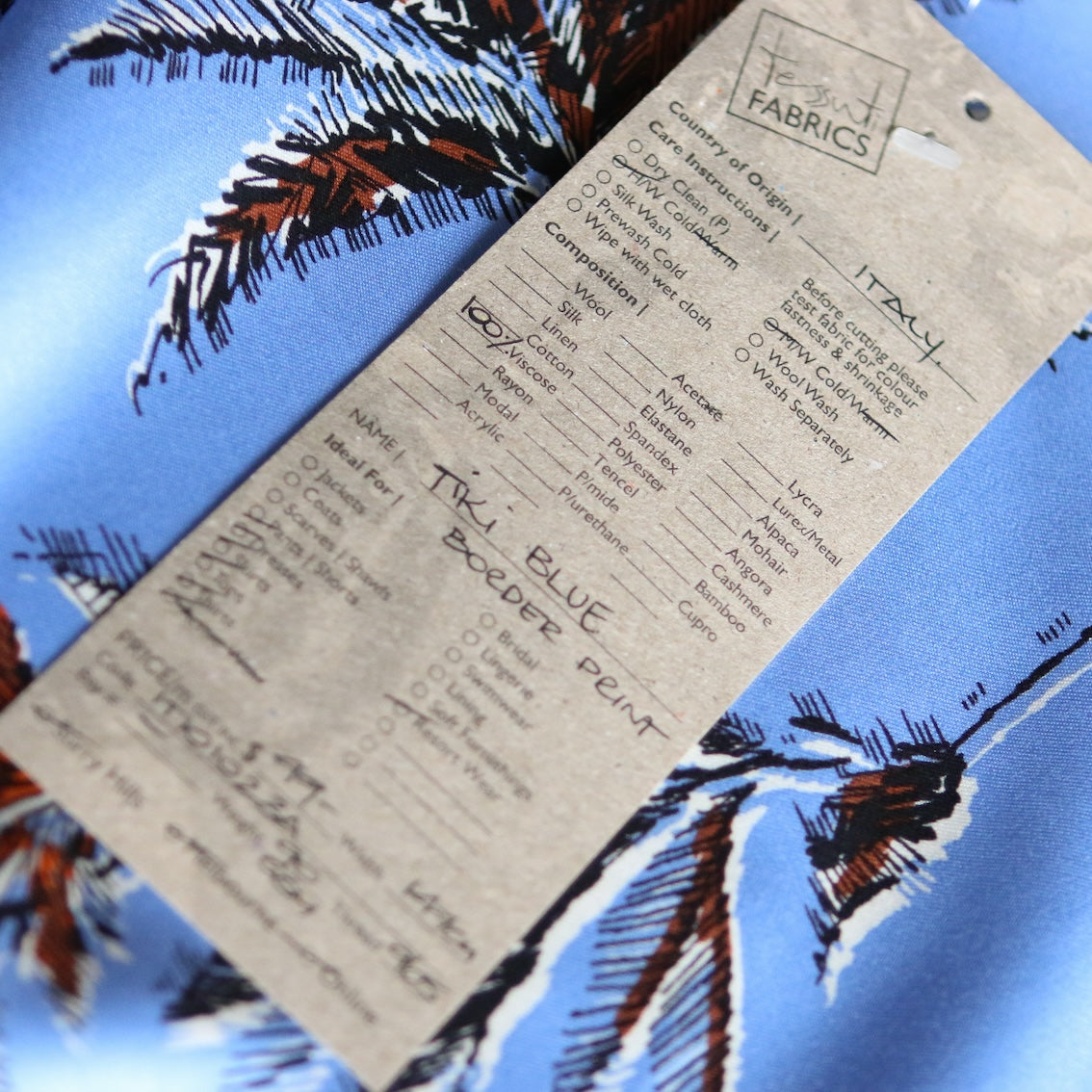 Italian blue/tropical printed 100% viscose poplin with border print on one selvedge