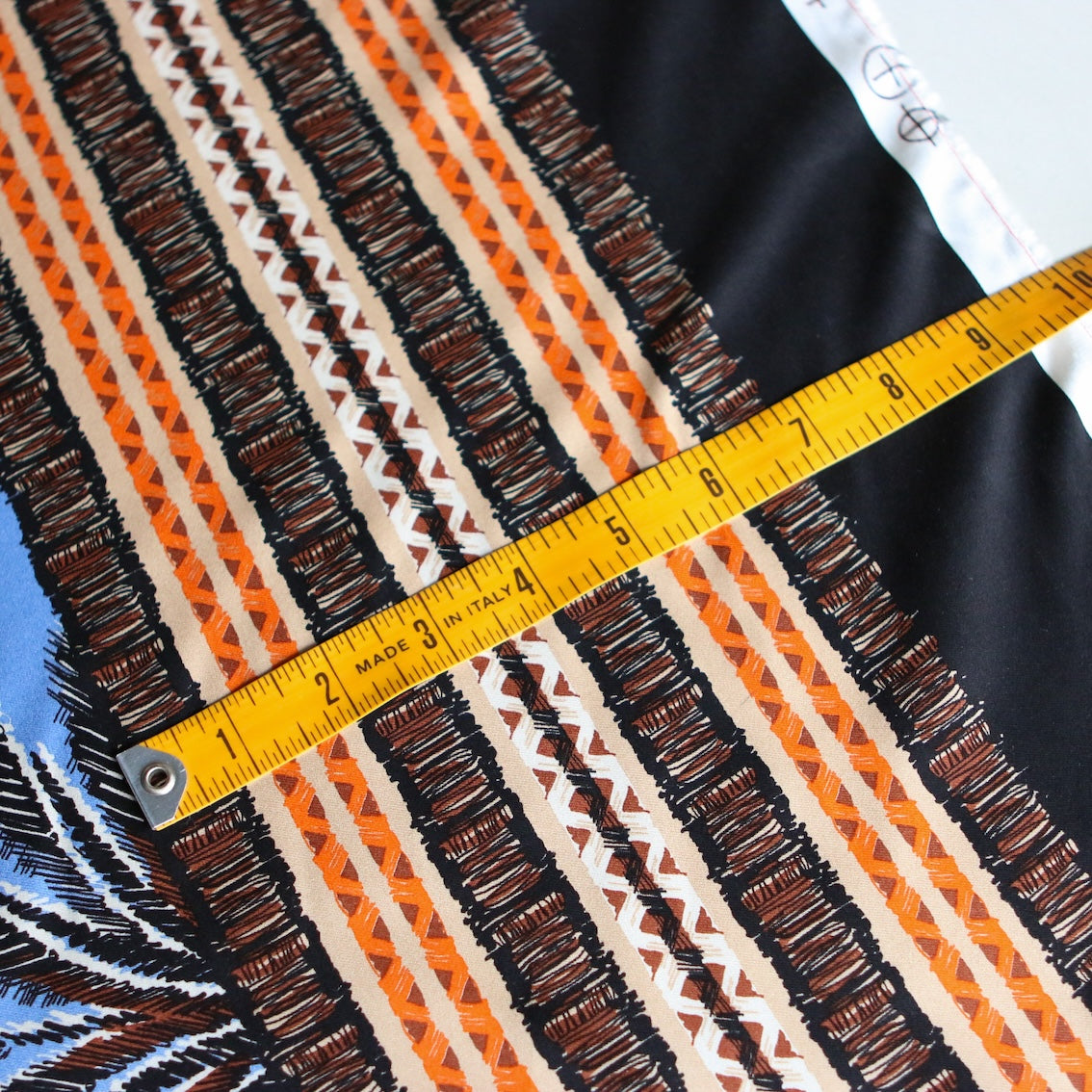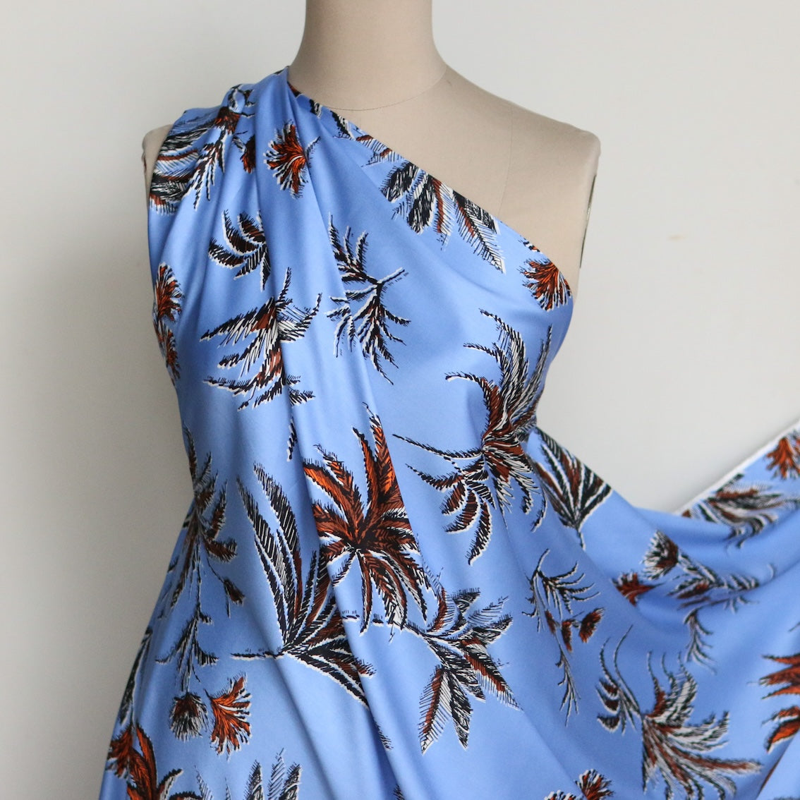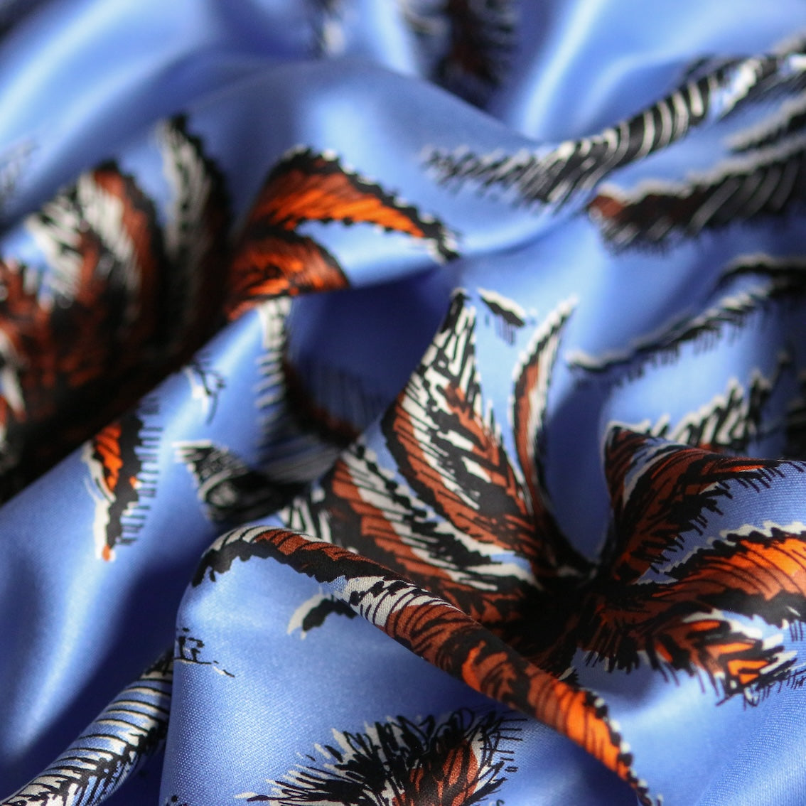 Italian blue/tropical printed 100% viscose poplin with border print on one selvedge