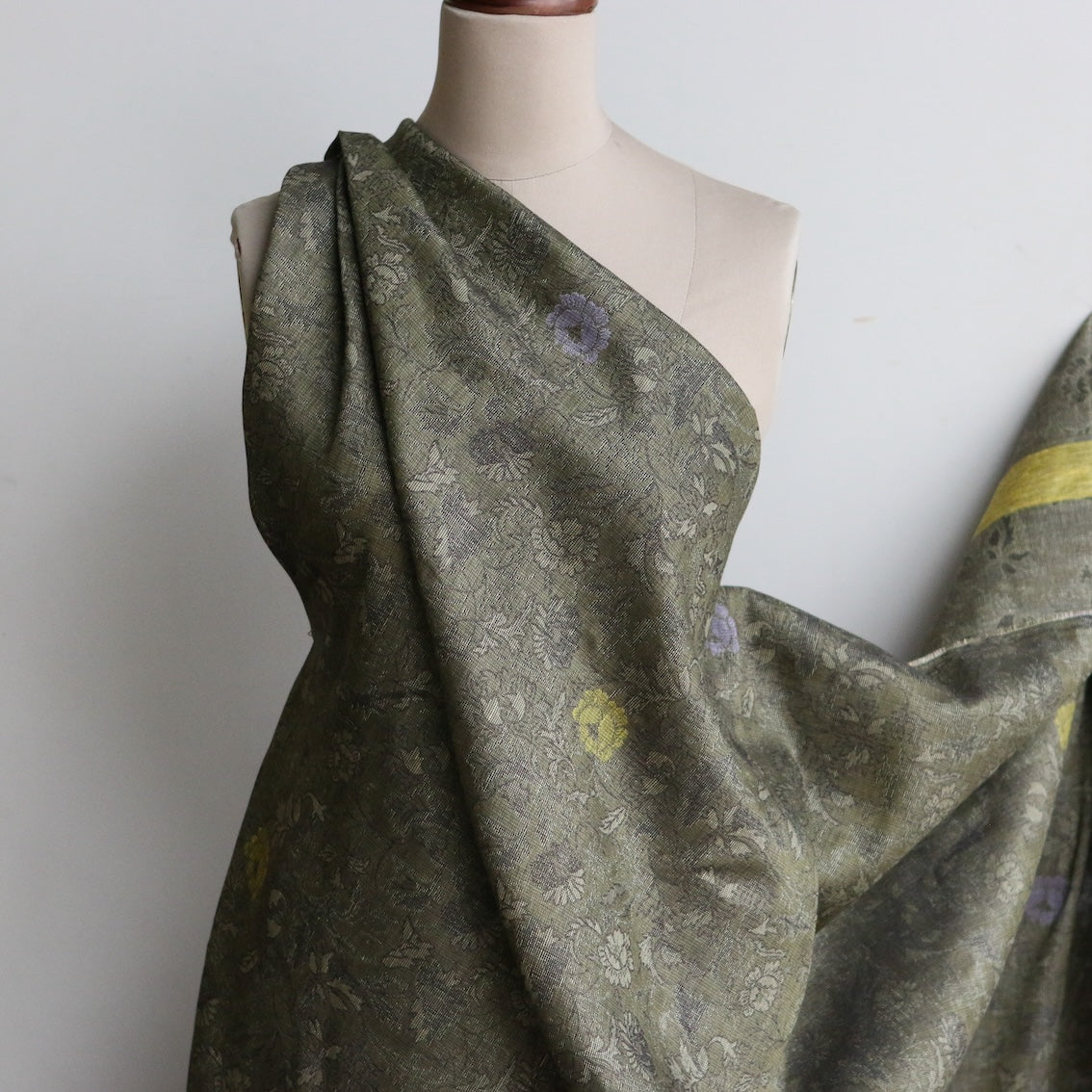 Italian yarn-dyed olive/chartreuse/lilac/black floral jacquard 100% linen