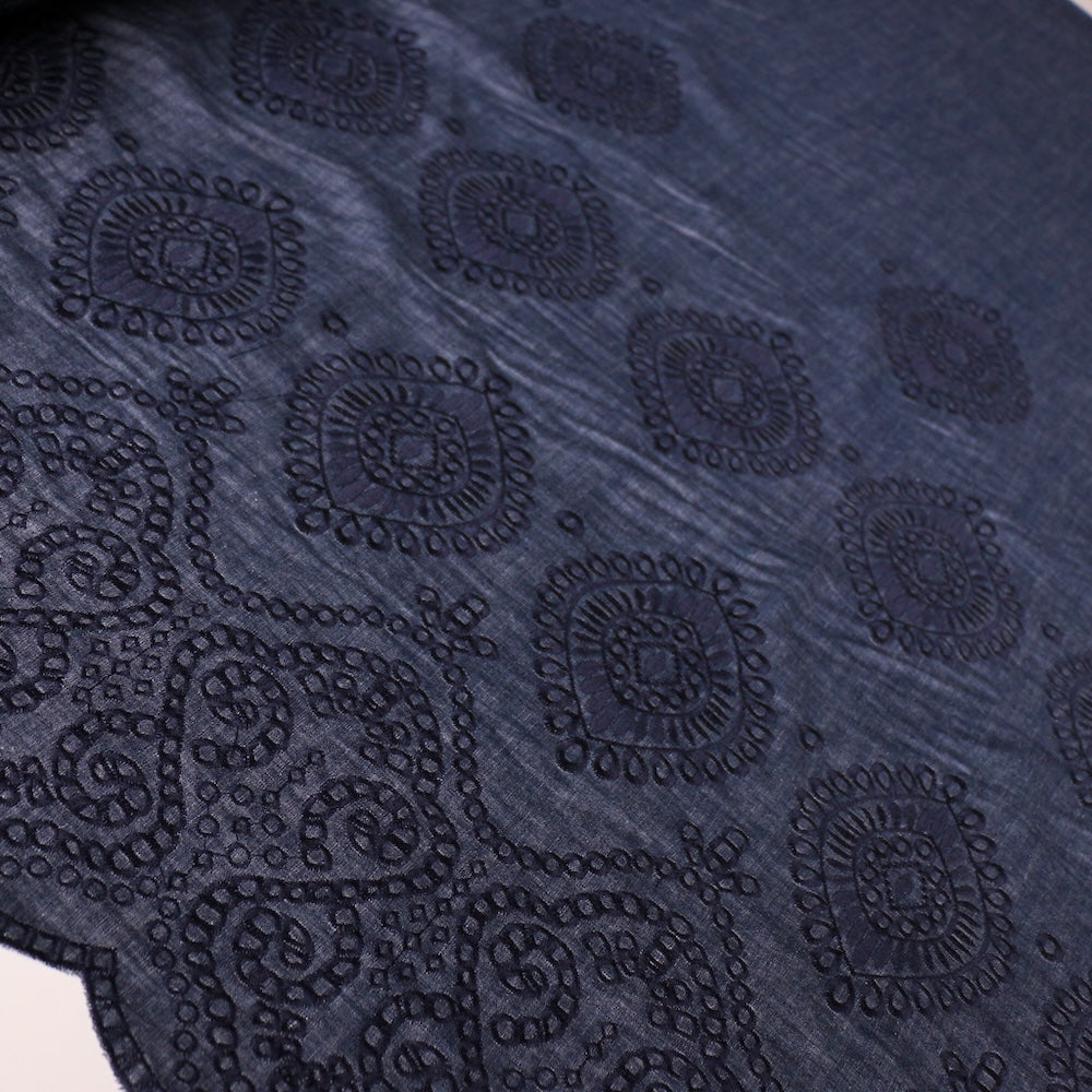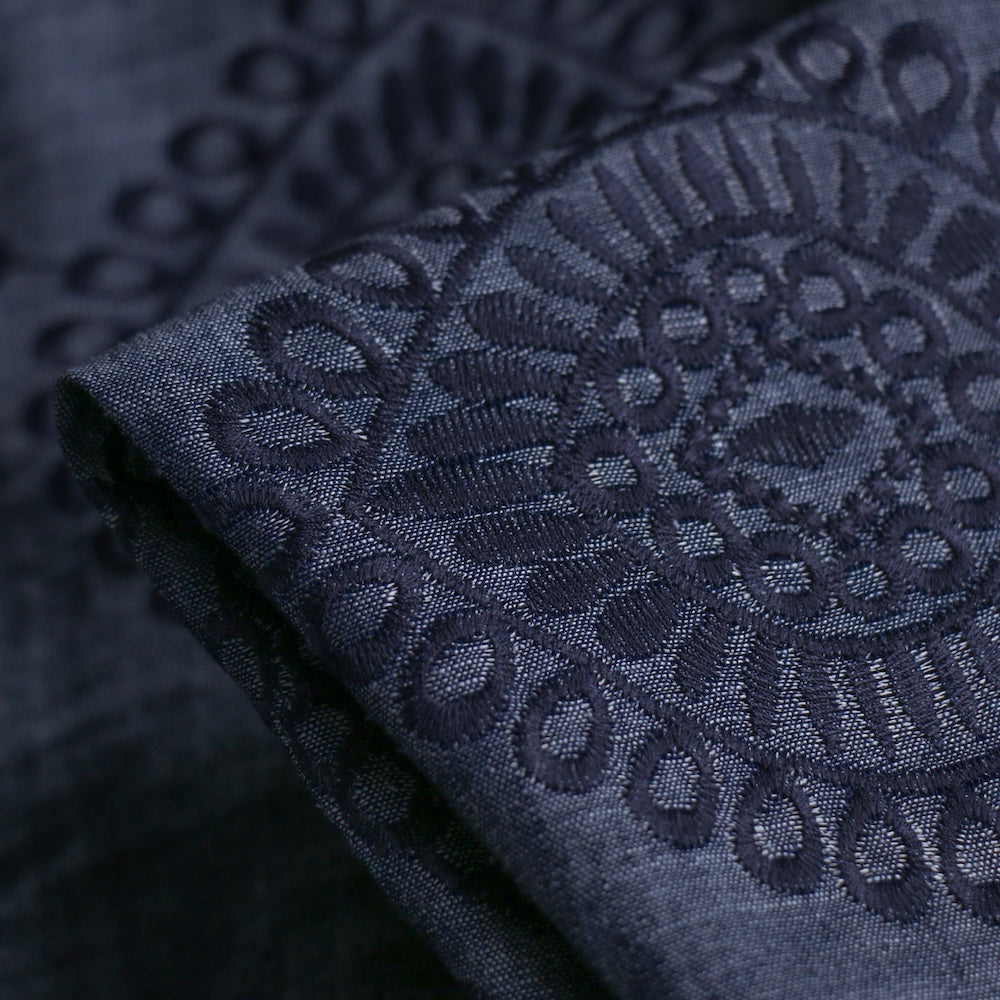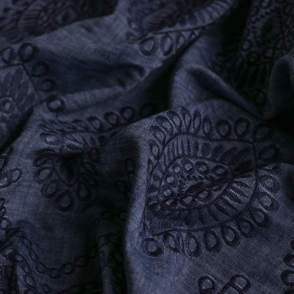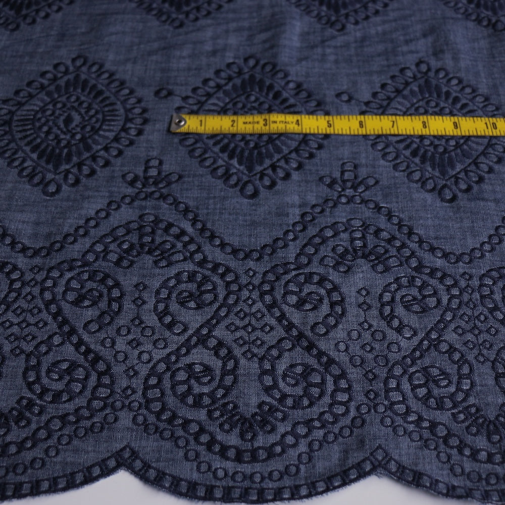 Italian 100% cotton denim with navy embroidered motif and scalloped border on one selvedge (Note: garments to be cut on the crossgrain)