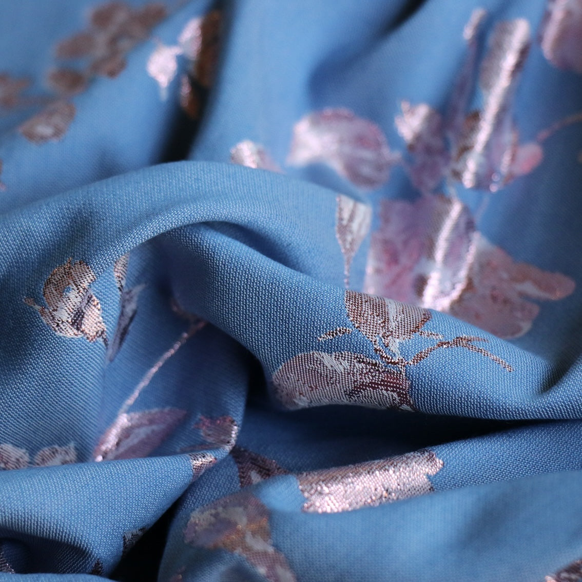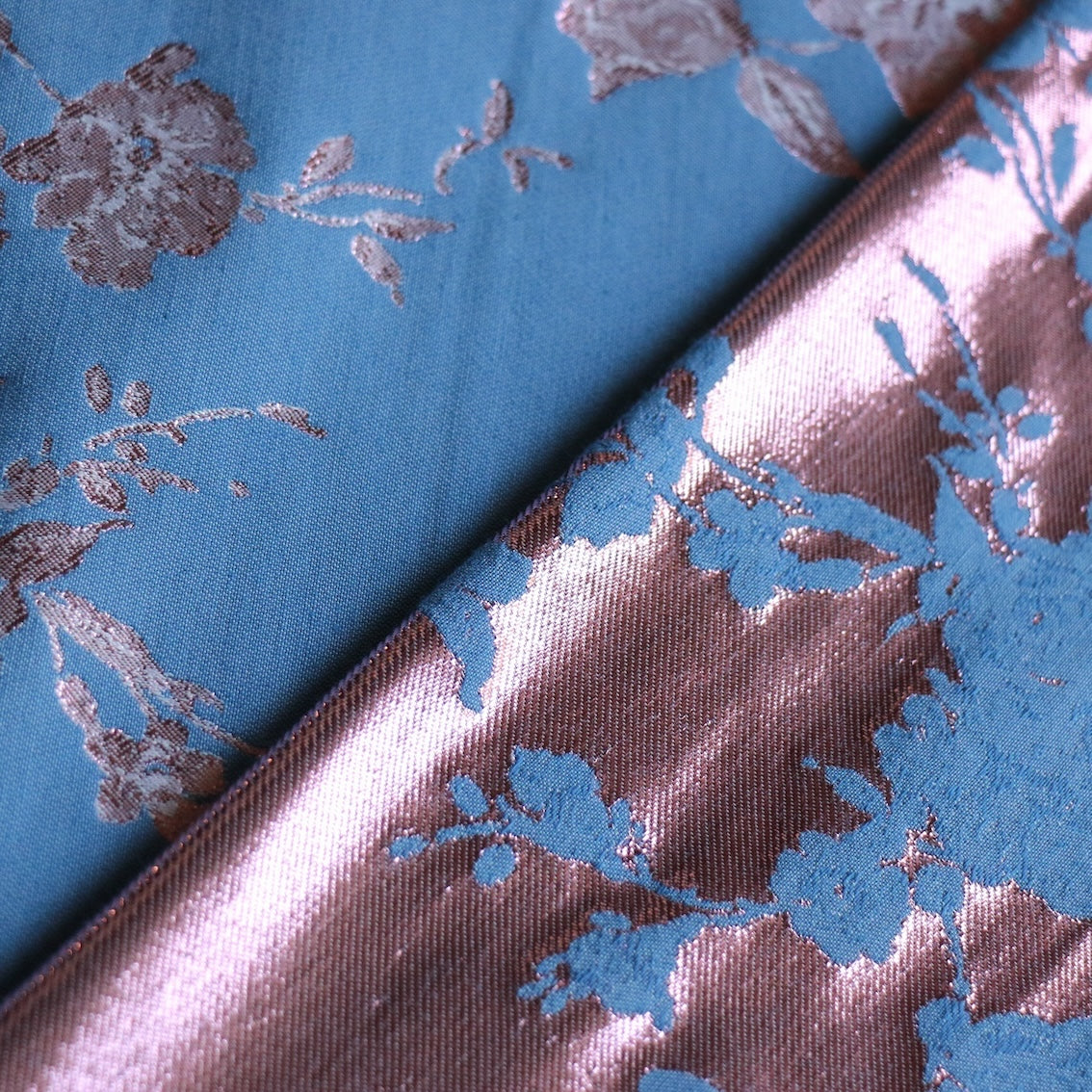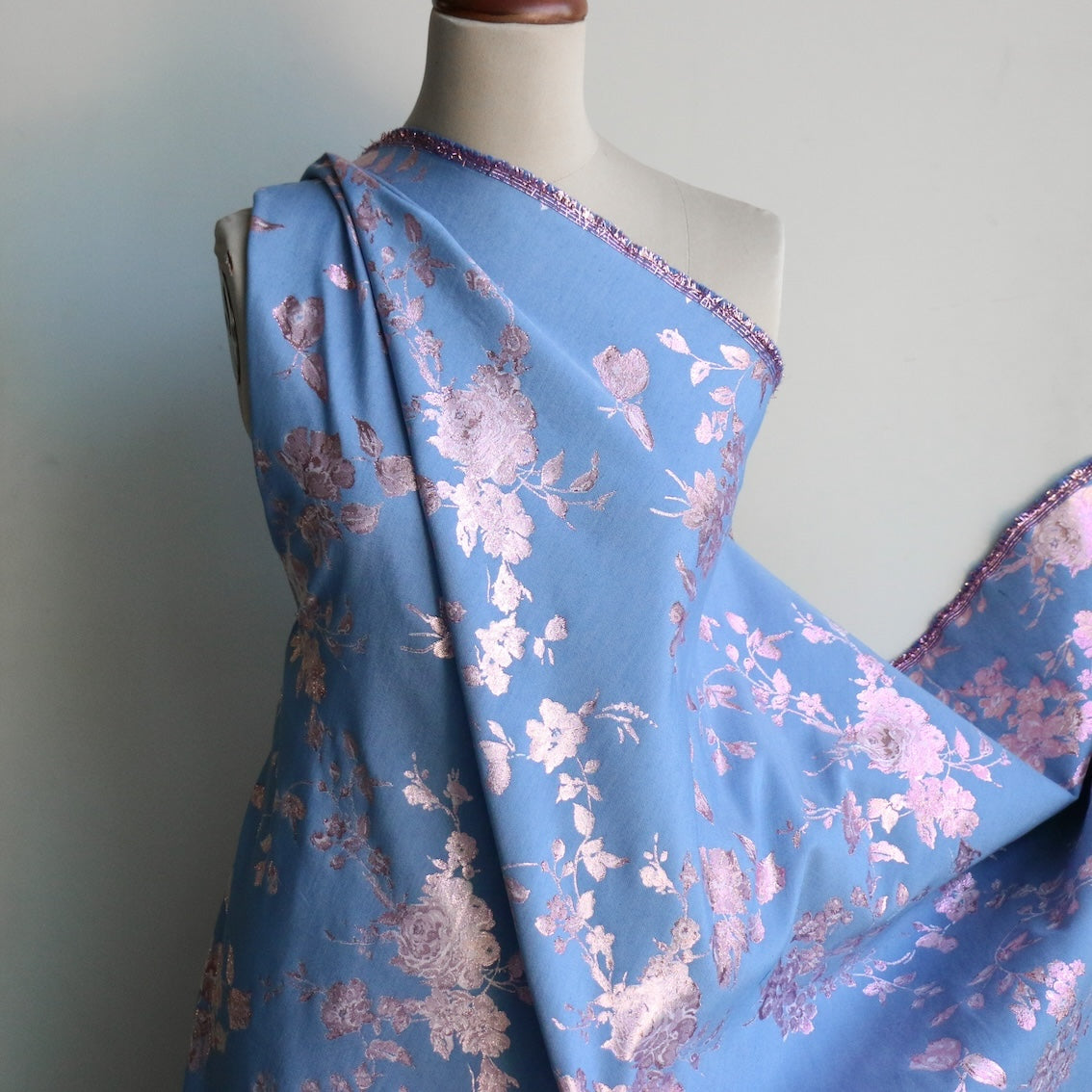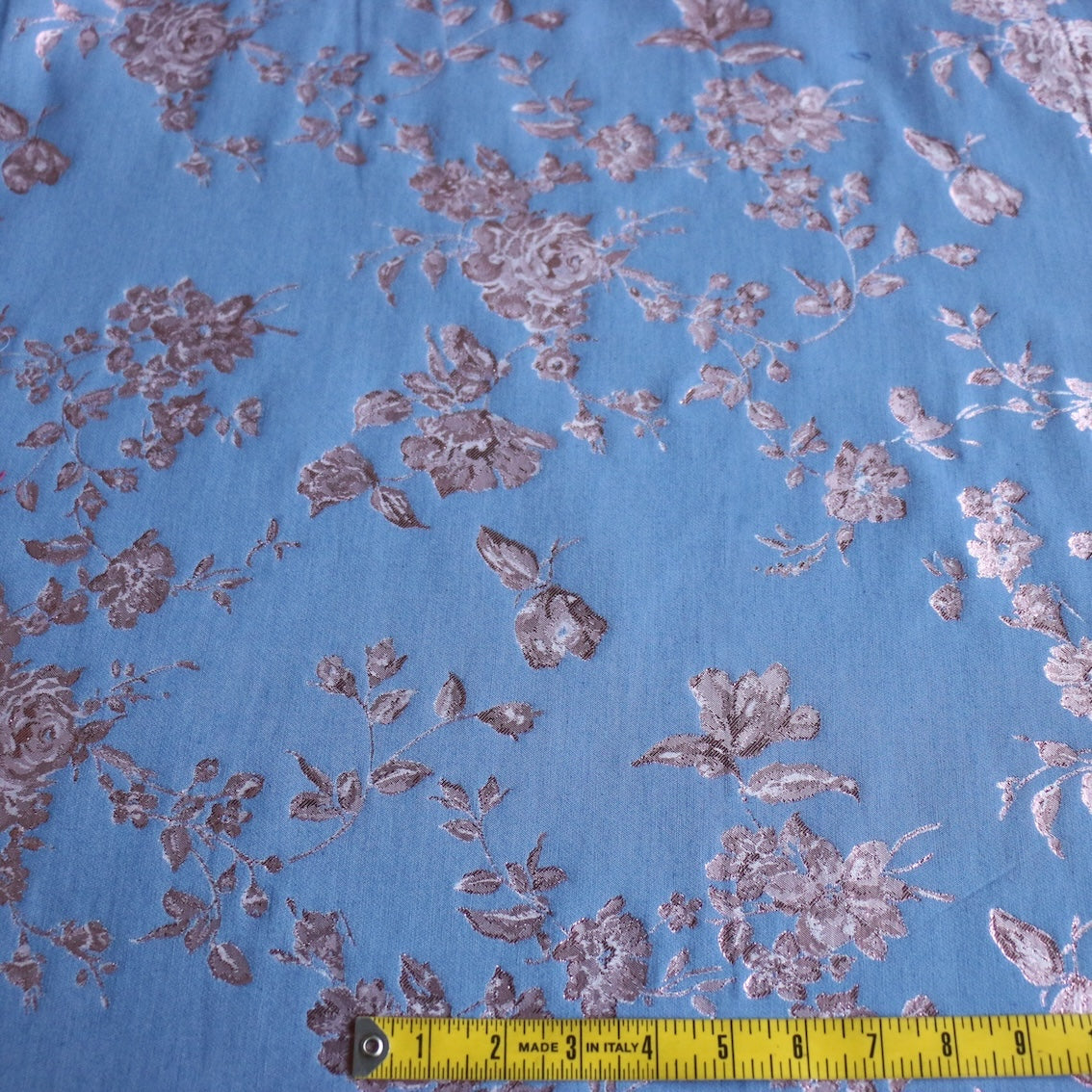 Italian designer chambray blue/pink lurex floral jacquard 50% cotton 34% polyamide 16% lurex