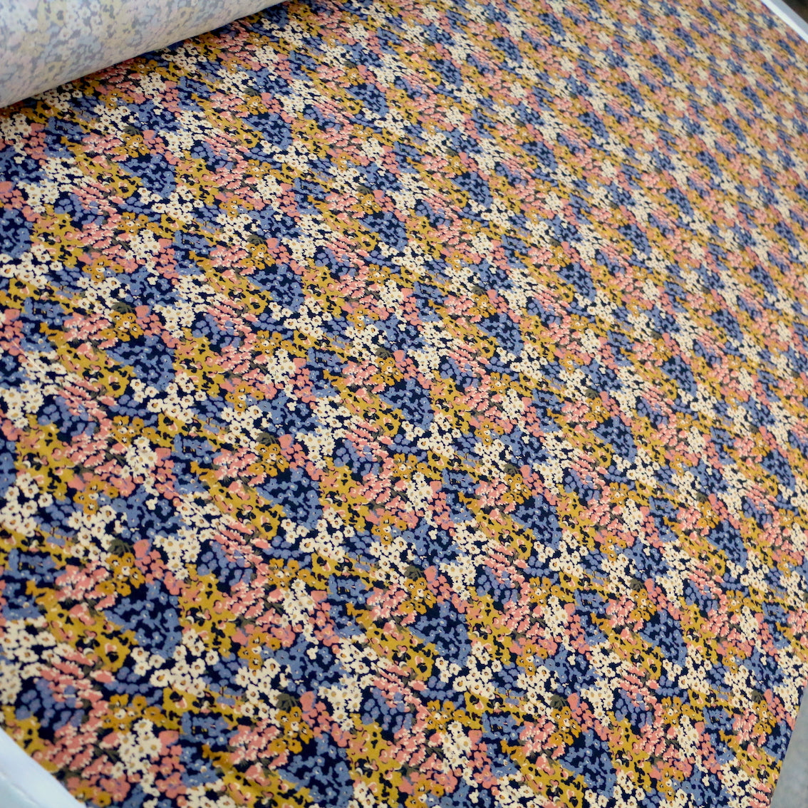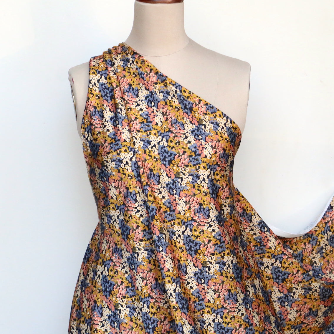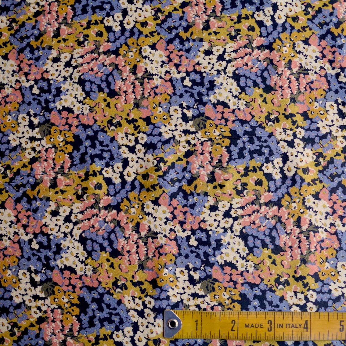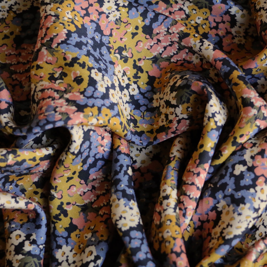 Italian designer mustard/blush/lavender on black floral printed 100% viscose twill sateen
