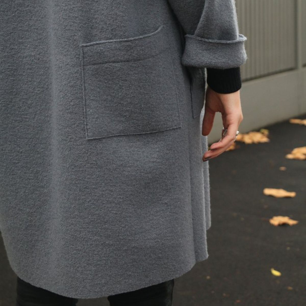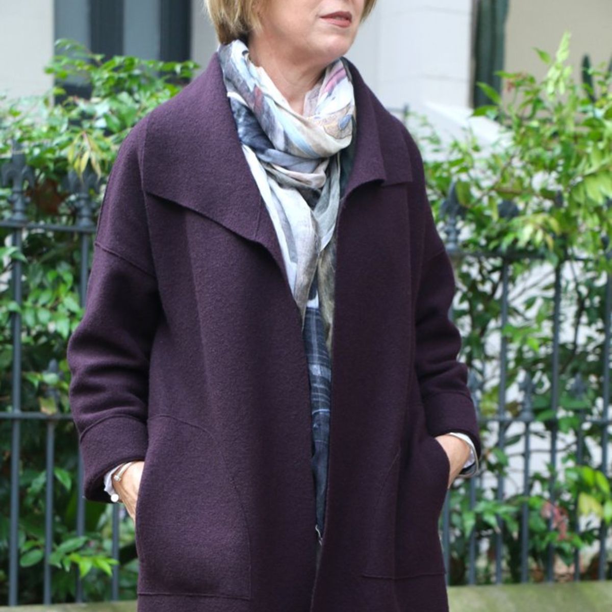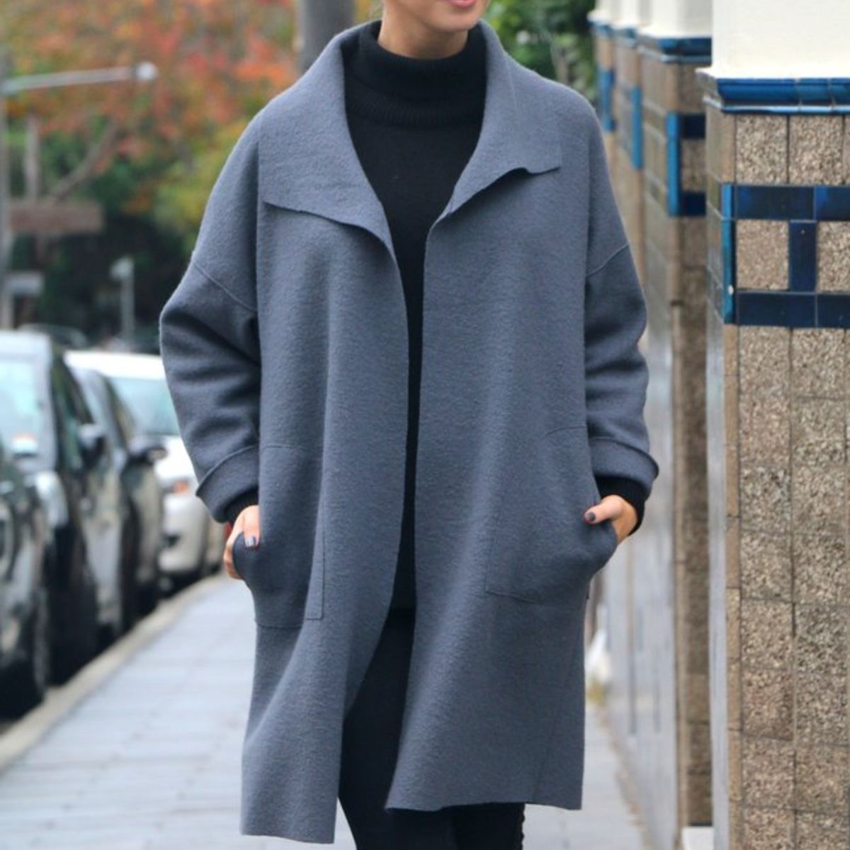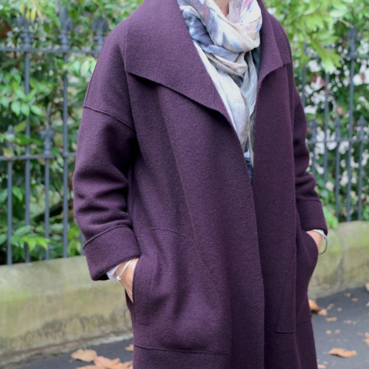 The Brooklyn Coat is an oversized, boxy style featuring dropped shoulders and a fold over collar with front and back patch pockets. The full-length sleeves are finished with a turned back cuff. The coat can either be worn loosely open or secured with a decorative pin. The perfect cover up for the autumn/winter months and ideal for layering too.