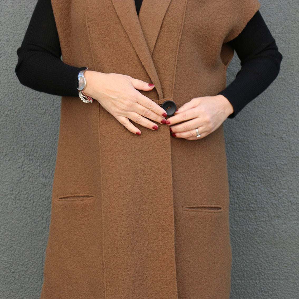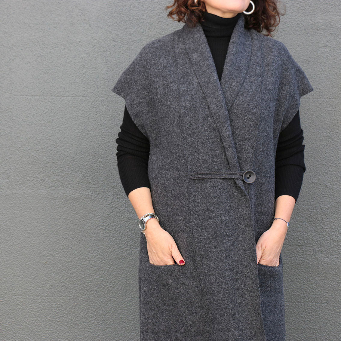 The Torino Vest is a long, sleeveless layering piece with a slightly A-line silhouette. This relaxed and stylish design features a cosy shawl collar, extended shoulders and concealed slit pockets that sit low on the hips. Overlapped and raw edges make for a quick and easy sewing project. Wear it open or closed – the wide collar extends to the knee-length hem and can be folded back to form a lapel or wrapped and secured with the unique loop and a feature button.