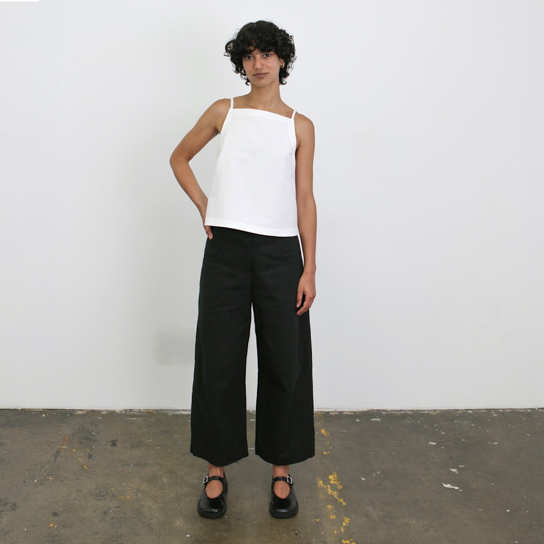 The Alba Pants are a stylish design featuring wide, cropped legs with a subtly curved silhouette. The comfortable mid-rise waist has a unique faced, flat front with an elasticated back. The single button, fly front closure and back yokes give a neat, fitted hip and minimal waist gathers. Curved inset front pockets, single rear patch pocket, back yoke, side seams and hems are all topstitched and look great when highlighted in contrast thread.