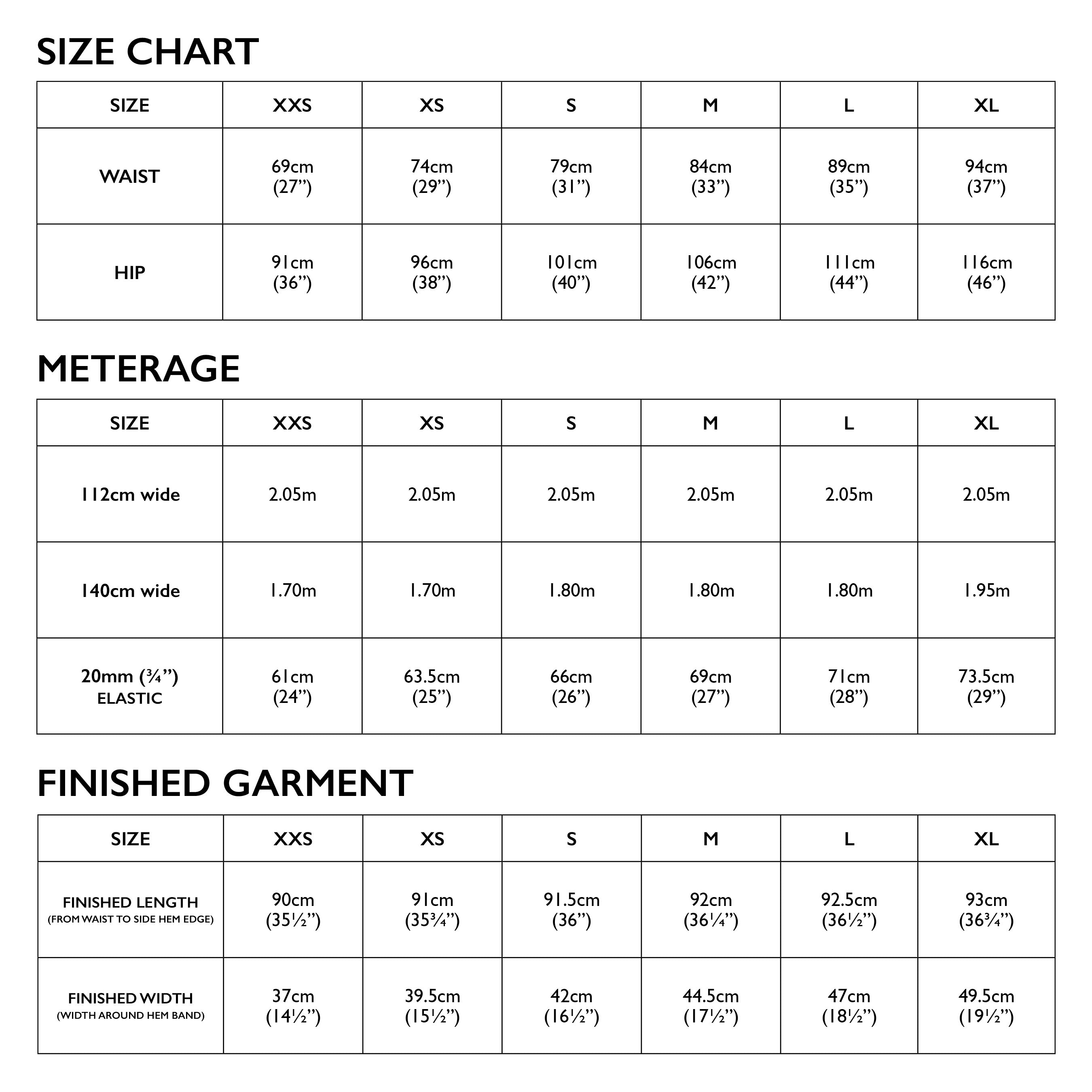 Sizes XXS- XL/6-16 - 32 pattern tiles in total. Page 1 includes the test square and page 2 features the layout guide. To check for scale accuracy, we strongly recommend printing page 1 first.