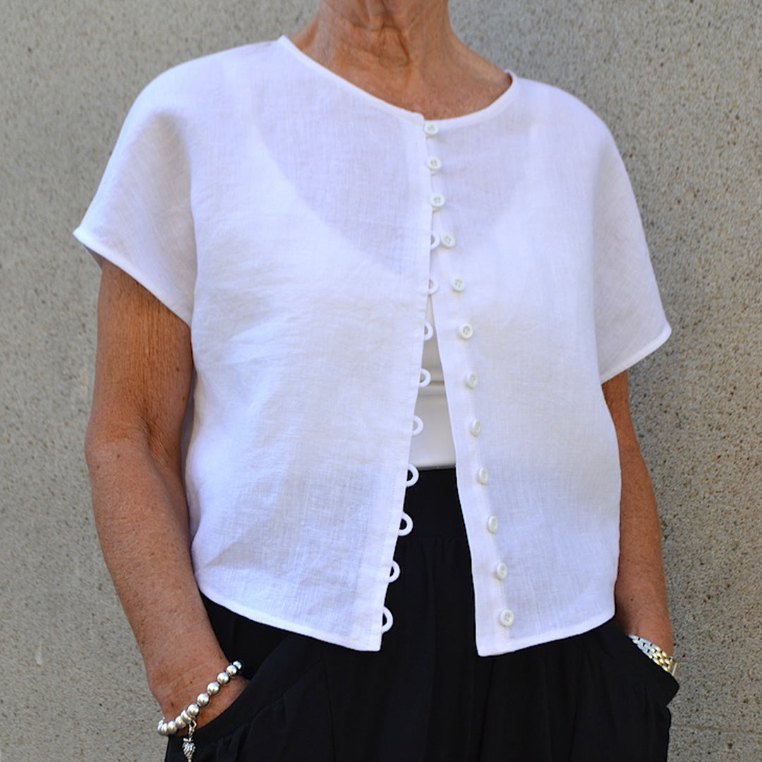 The Judy Top is a loose top with multi button rouleau detail, drop shoulders and a curved hemline that sits just past the waist. Judy can be worn over sleeveless dresses and tops and is a simple, stylish accompaniment with pants or long skirts.