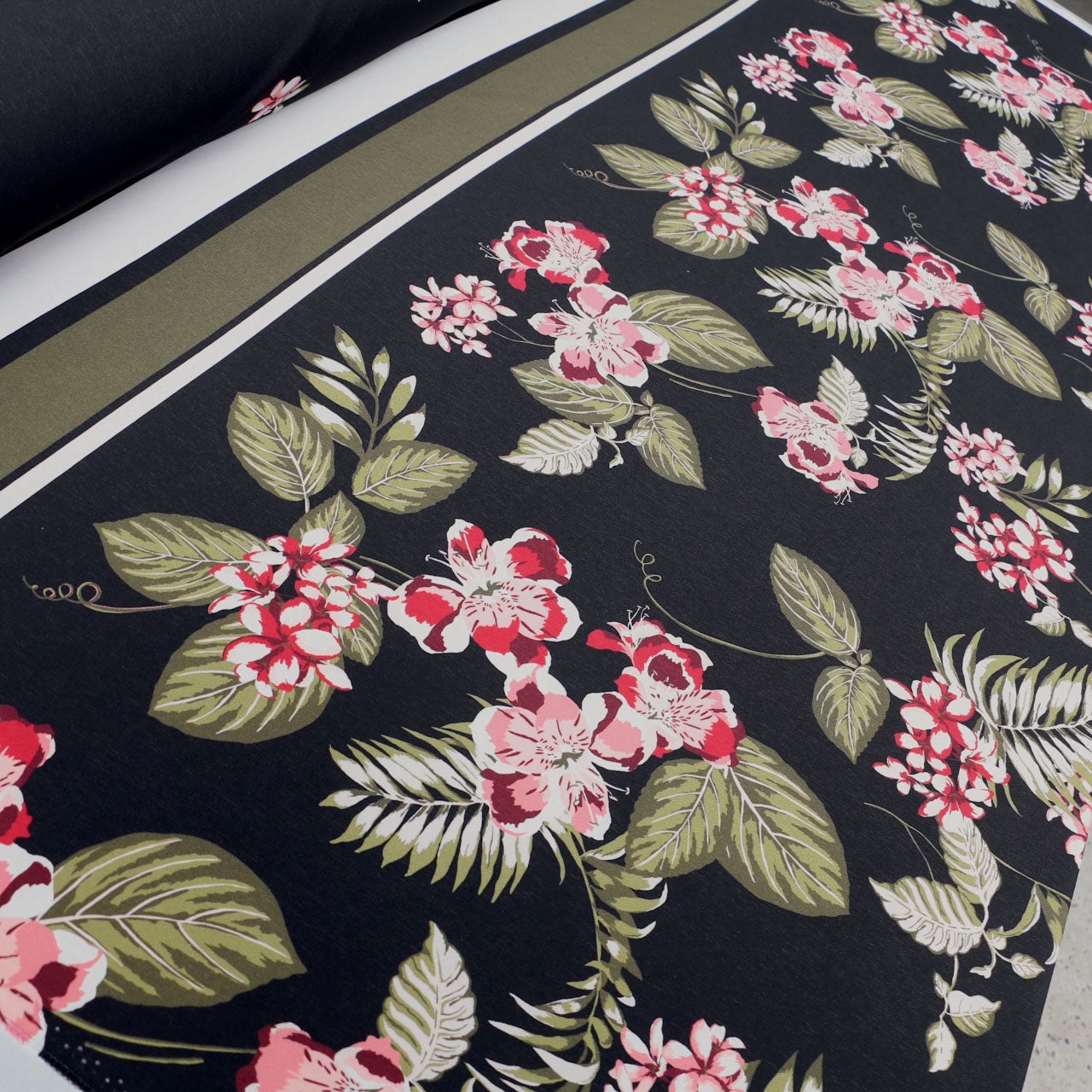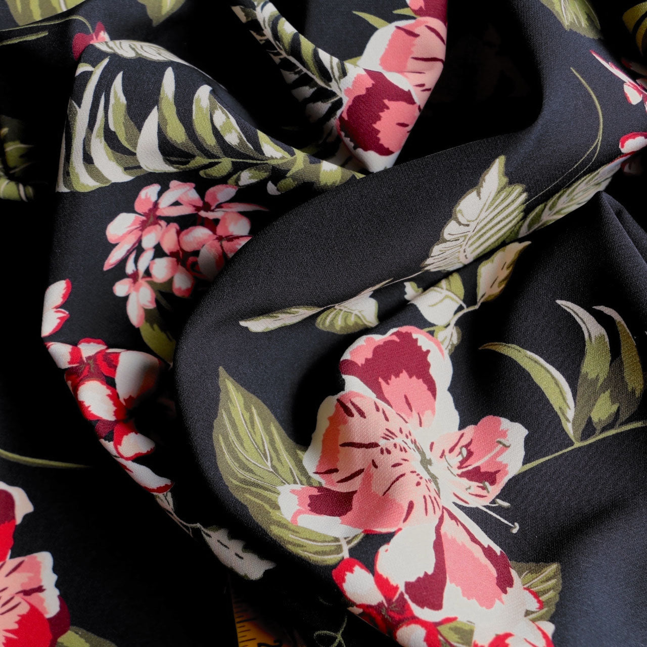 Designer black floral printed 87% polyester 13% elastane stretch crepe