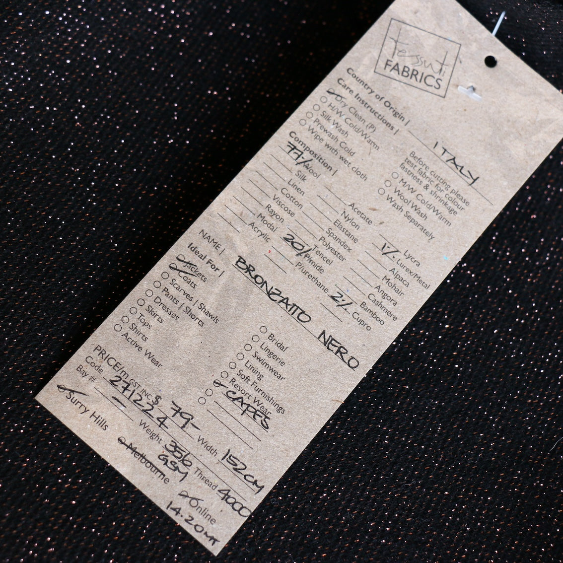 Italian black/bronze lurex 77% wool 20% polymide 2% cupro 1% lurex coating