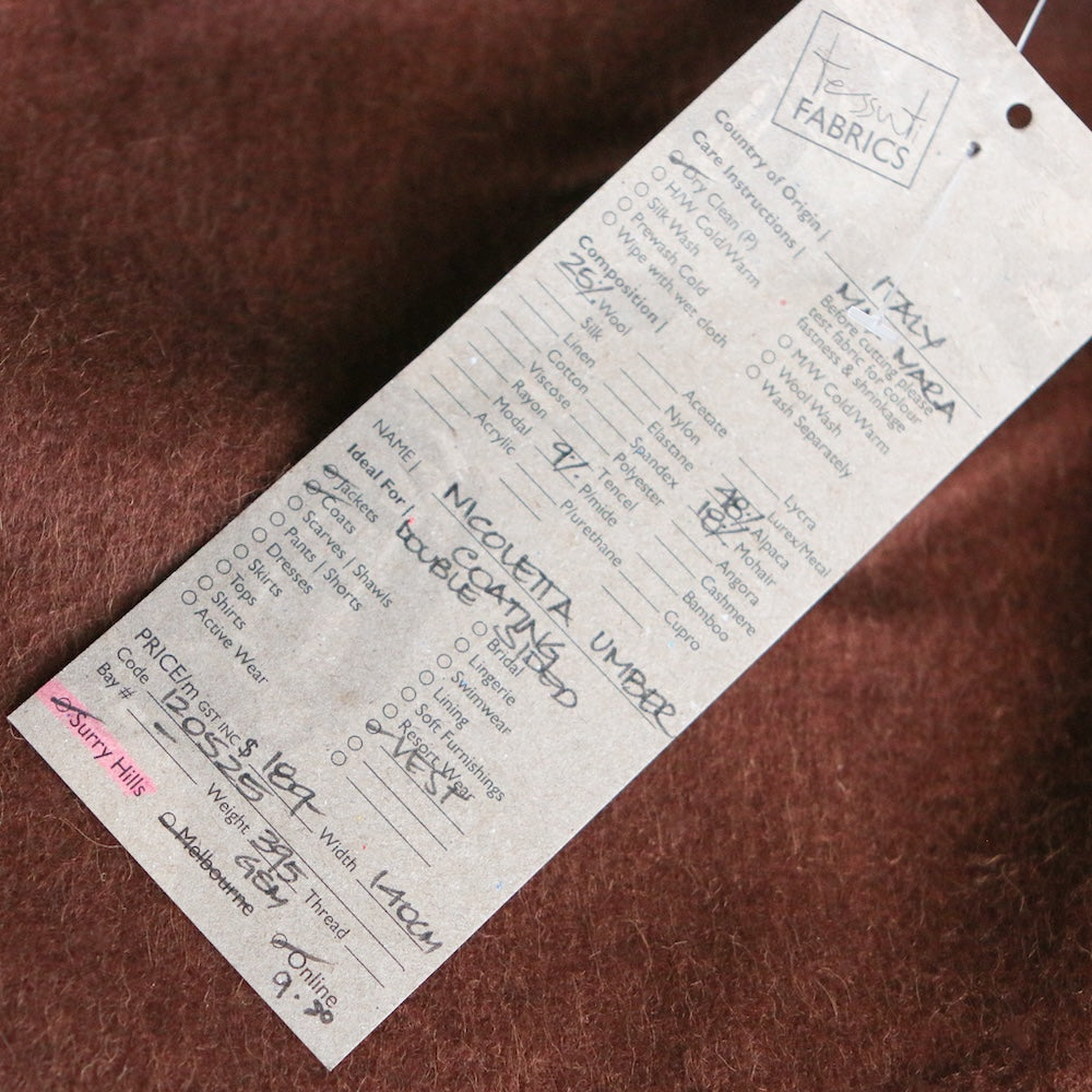 Italian amber/walnut 48% alpaca 25% wool 18% mohair 9% polyamide plush coating