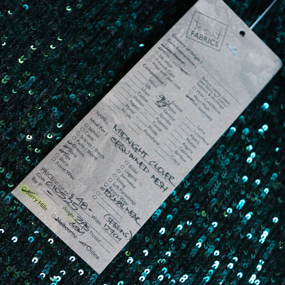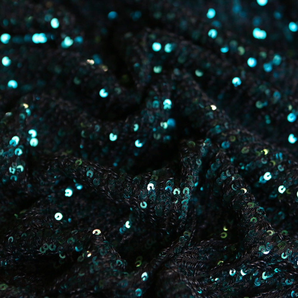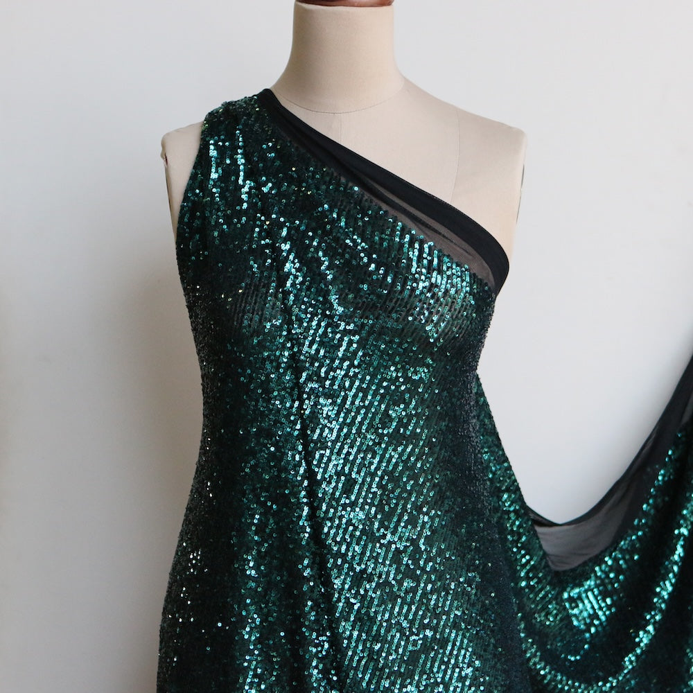 Clover/emerald green small PET sequins on stretch mesh 95% nylon 5% elastane.