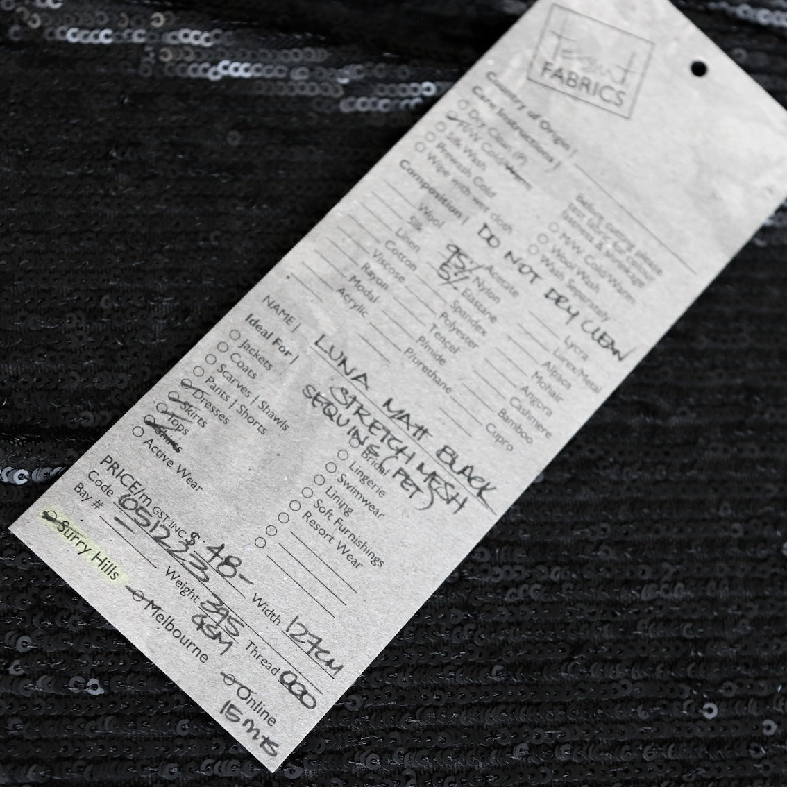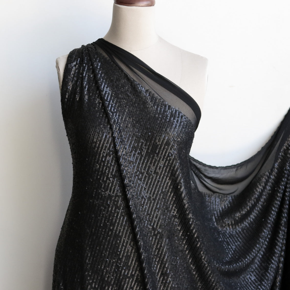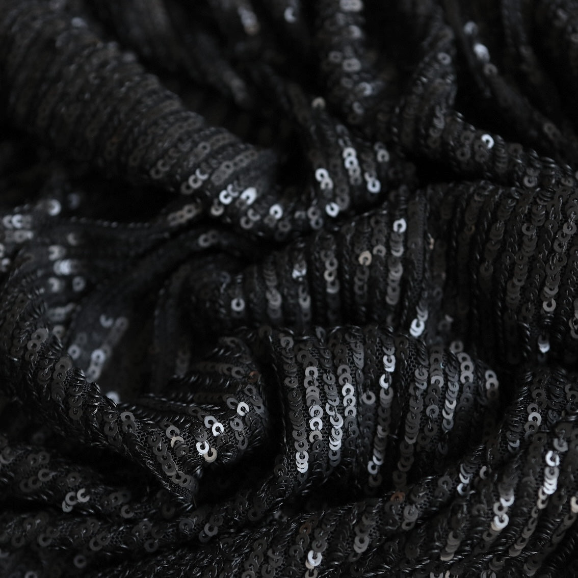 Matte black small PET sequins on stretch mesh 95% nylon 5% elastane.