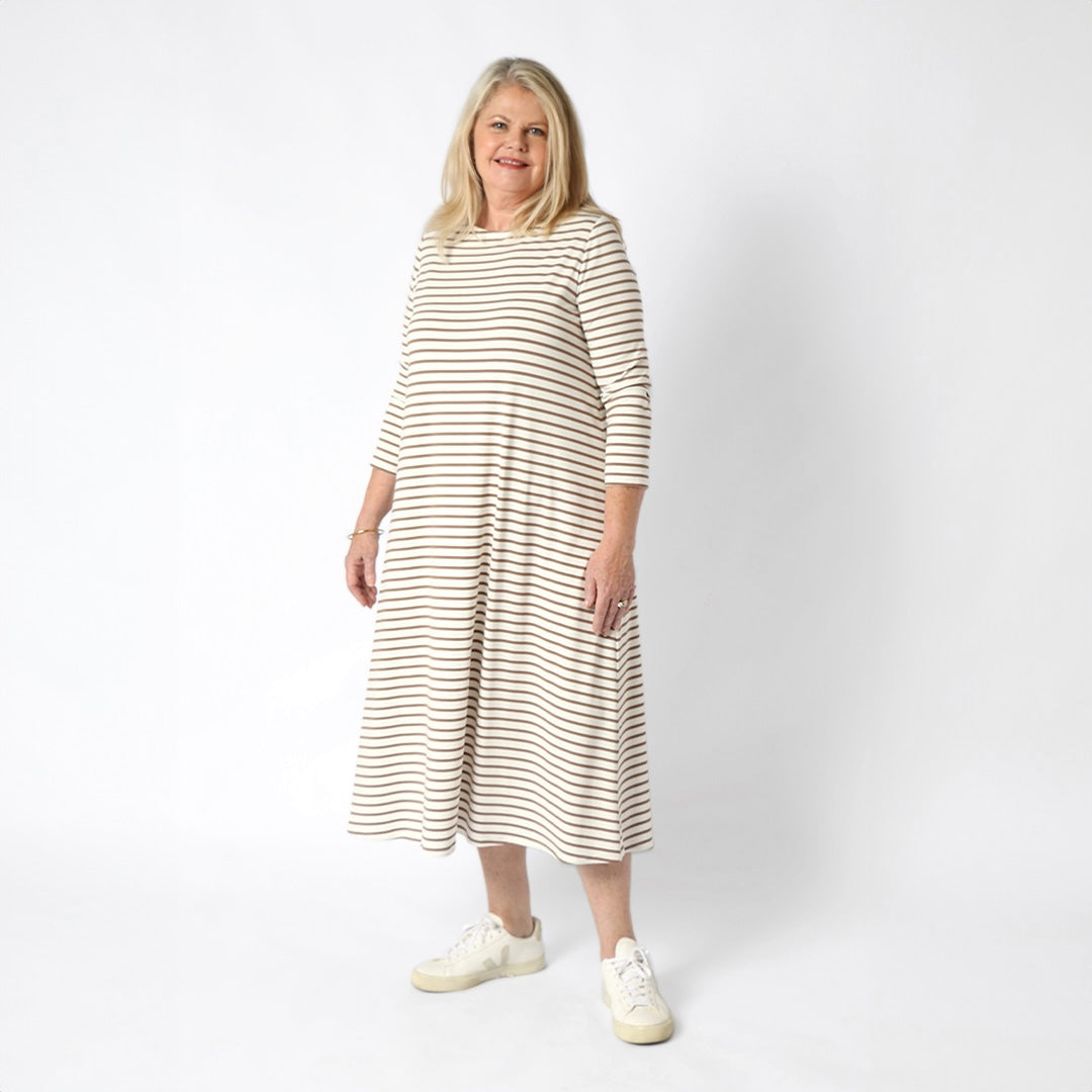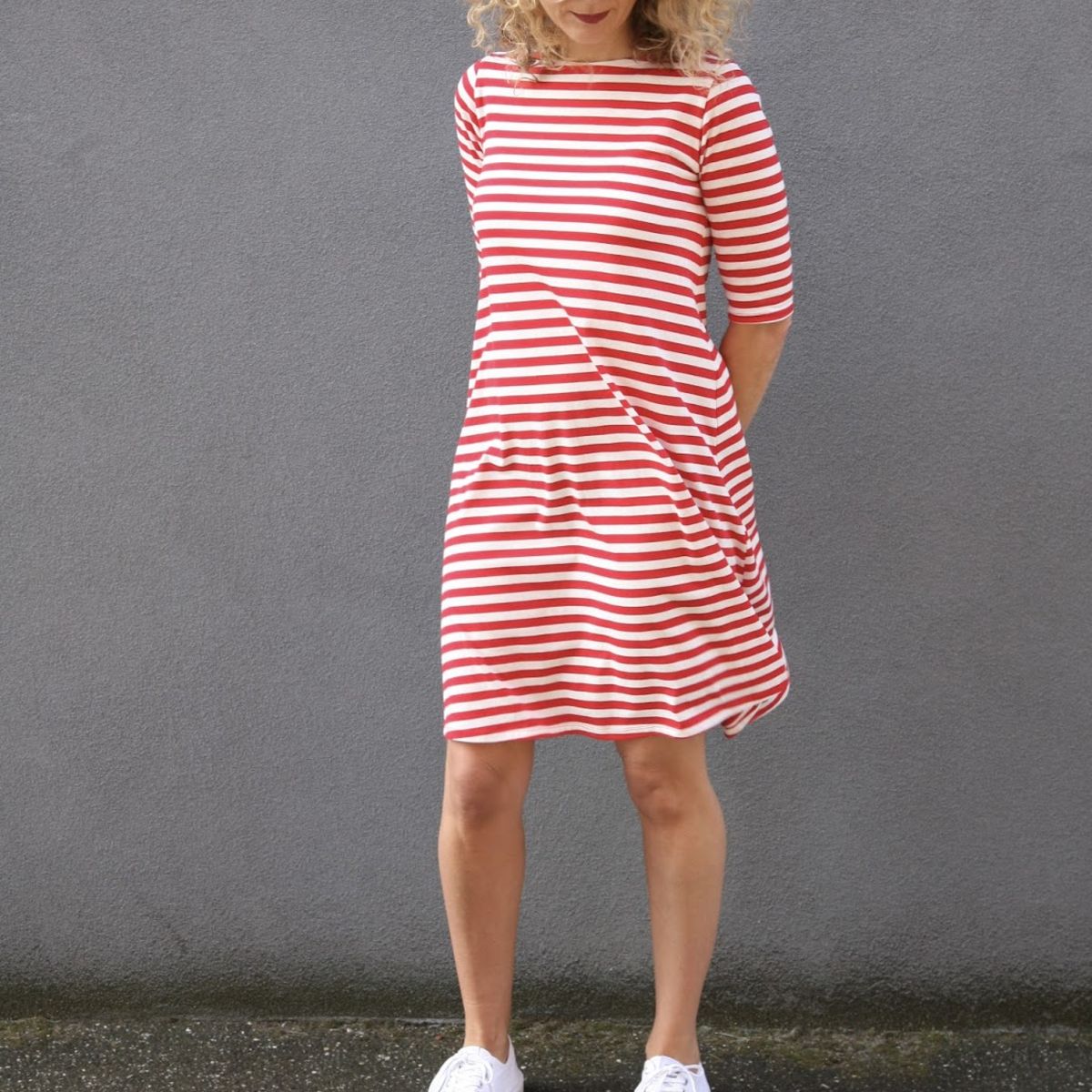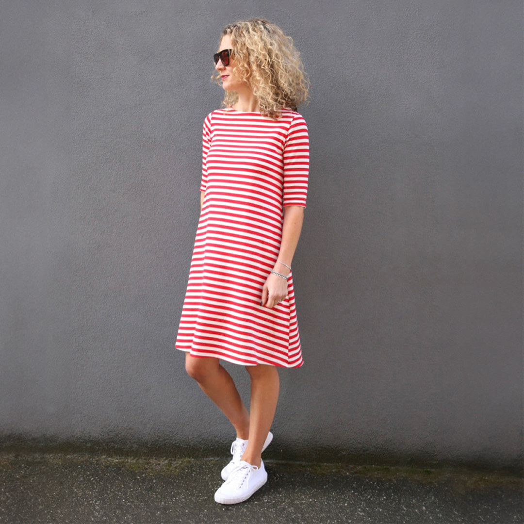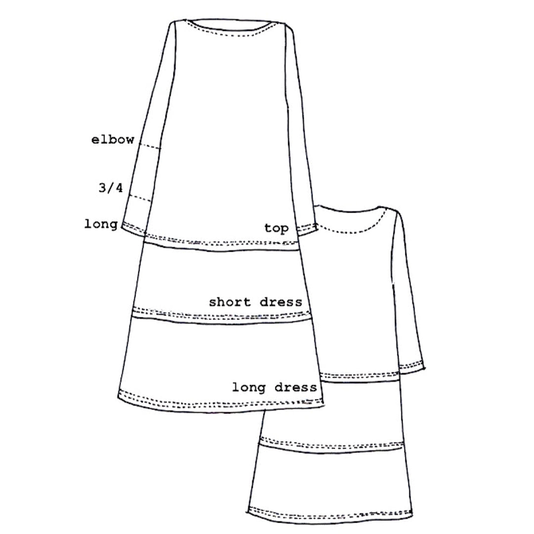 The Frankie Top/Dress is the perfect jersey knit style and a fabulous wardrobe winner across all the seasons.The pattern features a boat neckline, flared hemline, set in sleeves and comes with numerous style options - two dress lengths, a top and three sleeve lengths (elbow, three quarter and full). The stitched down, back facing creates a neat and secure neckline.
