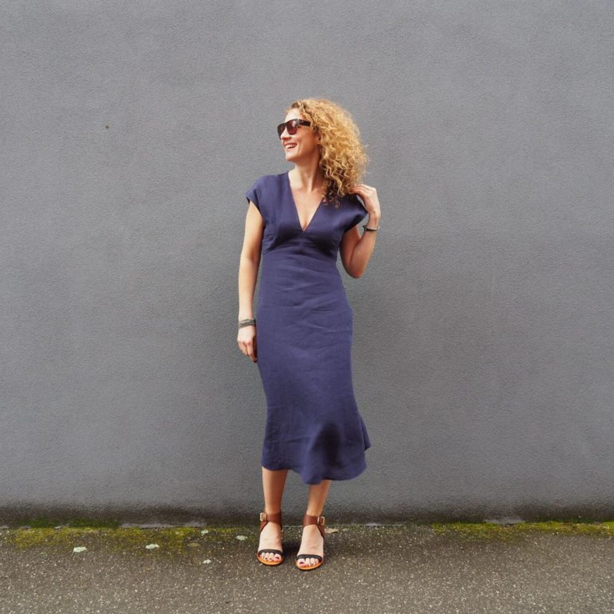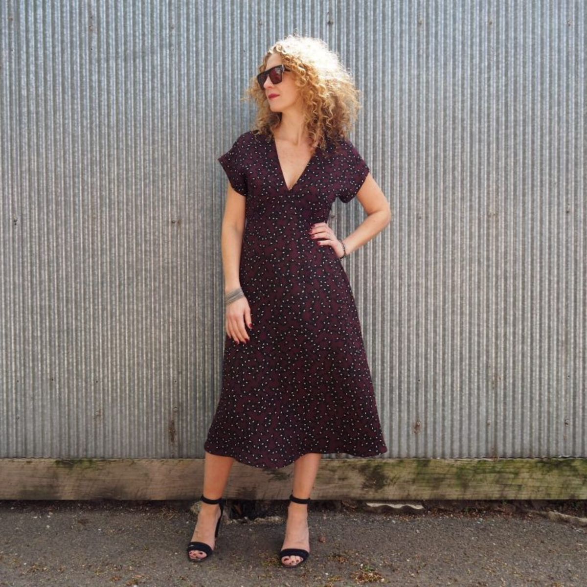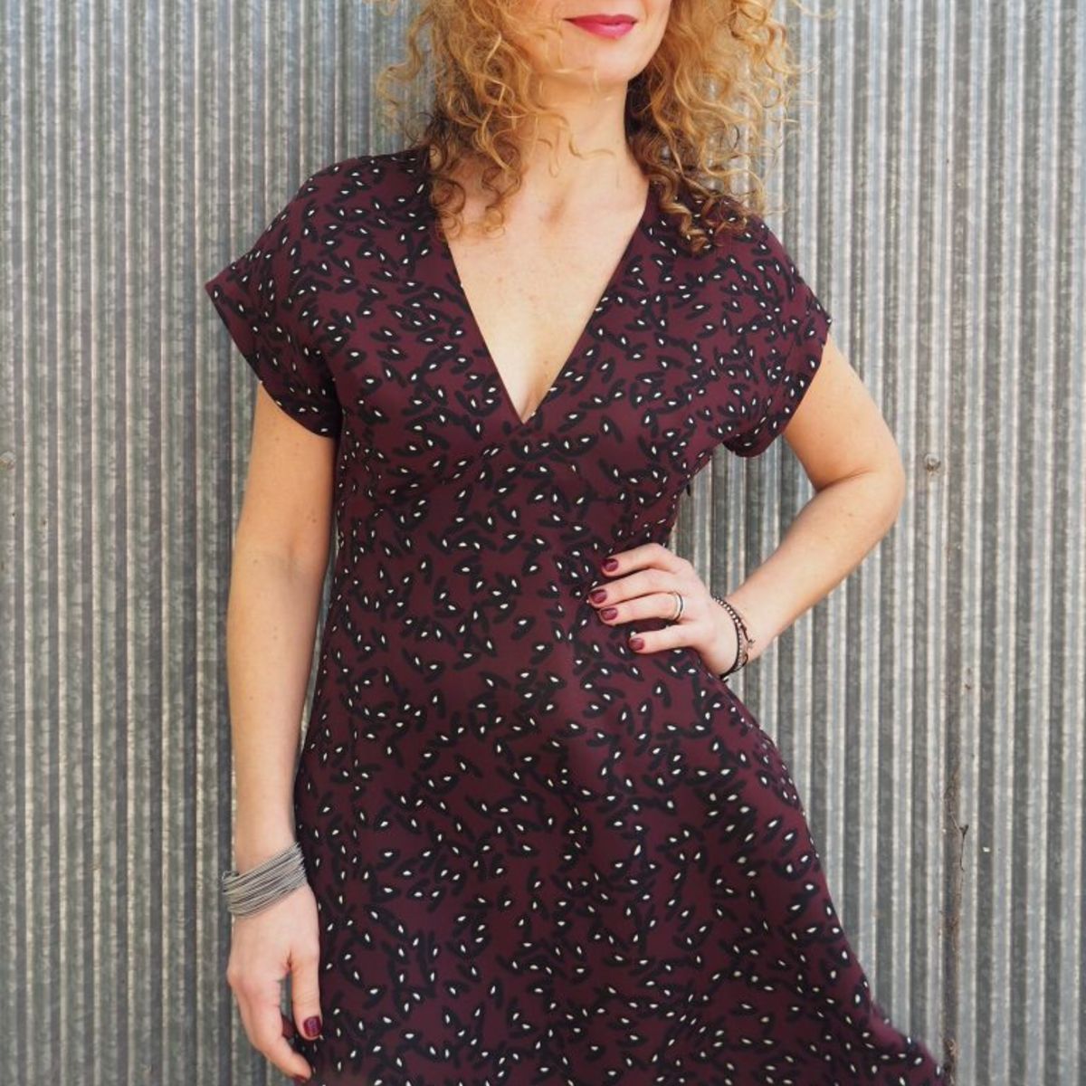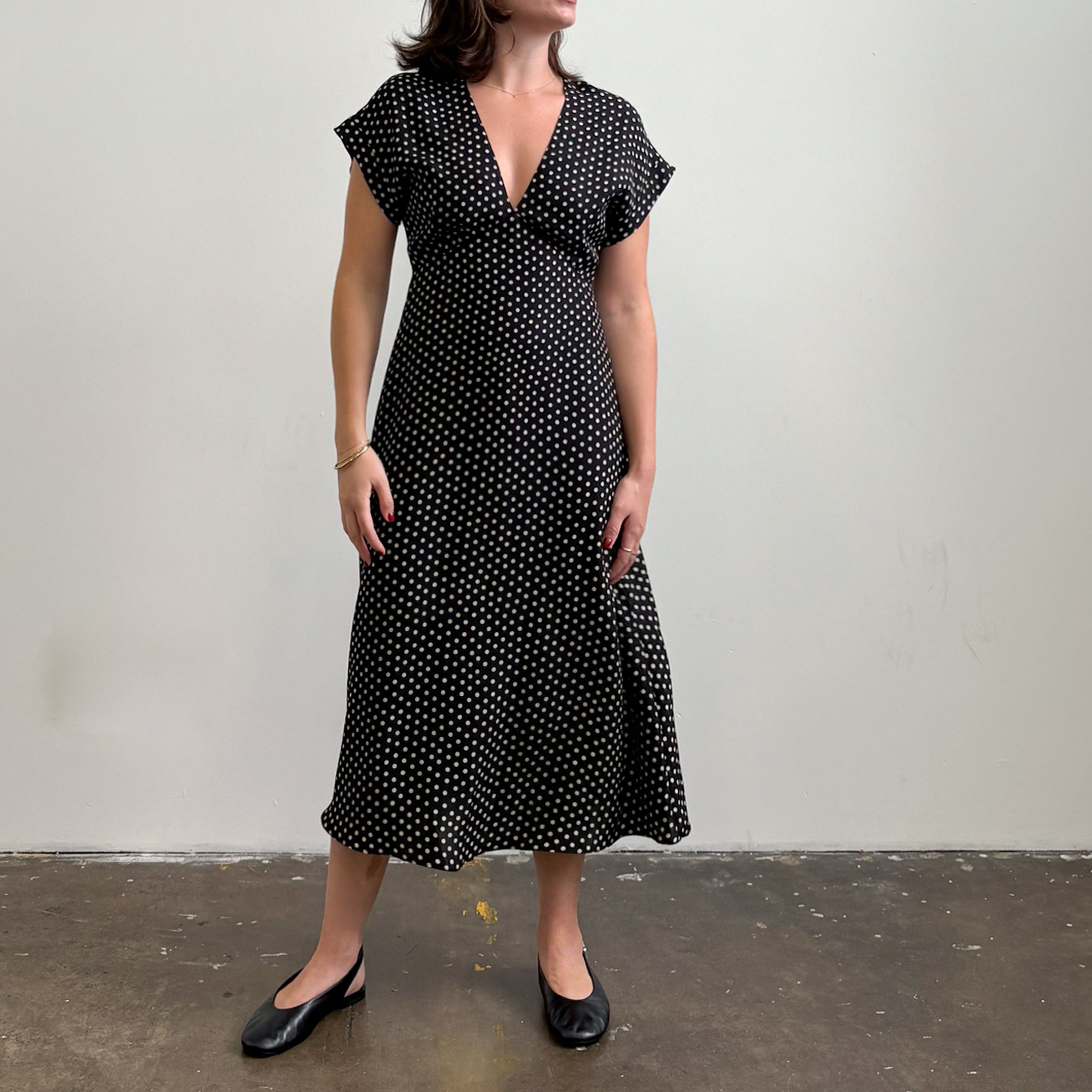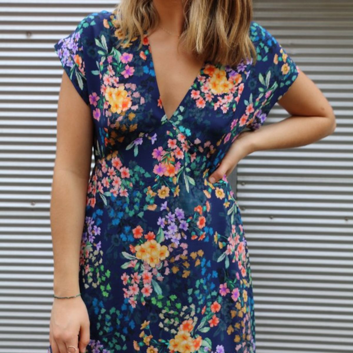 Vintage inspired, the Lois Dress features a V-neck bodice and a floaty, A-line skirt that falls to a timeless midi length. Finishing features include cuffed arm bands, a top-stitch detail around the neckline and waist, and an invisible side zipper that is placed within a dart.