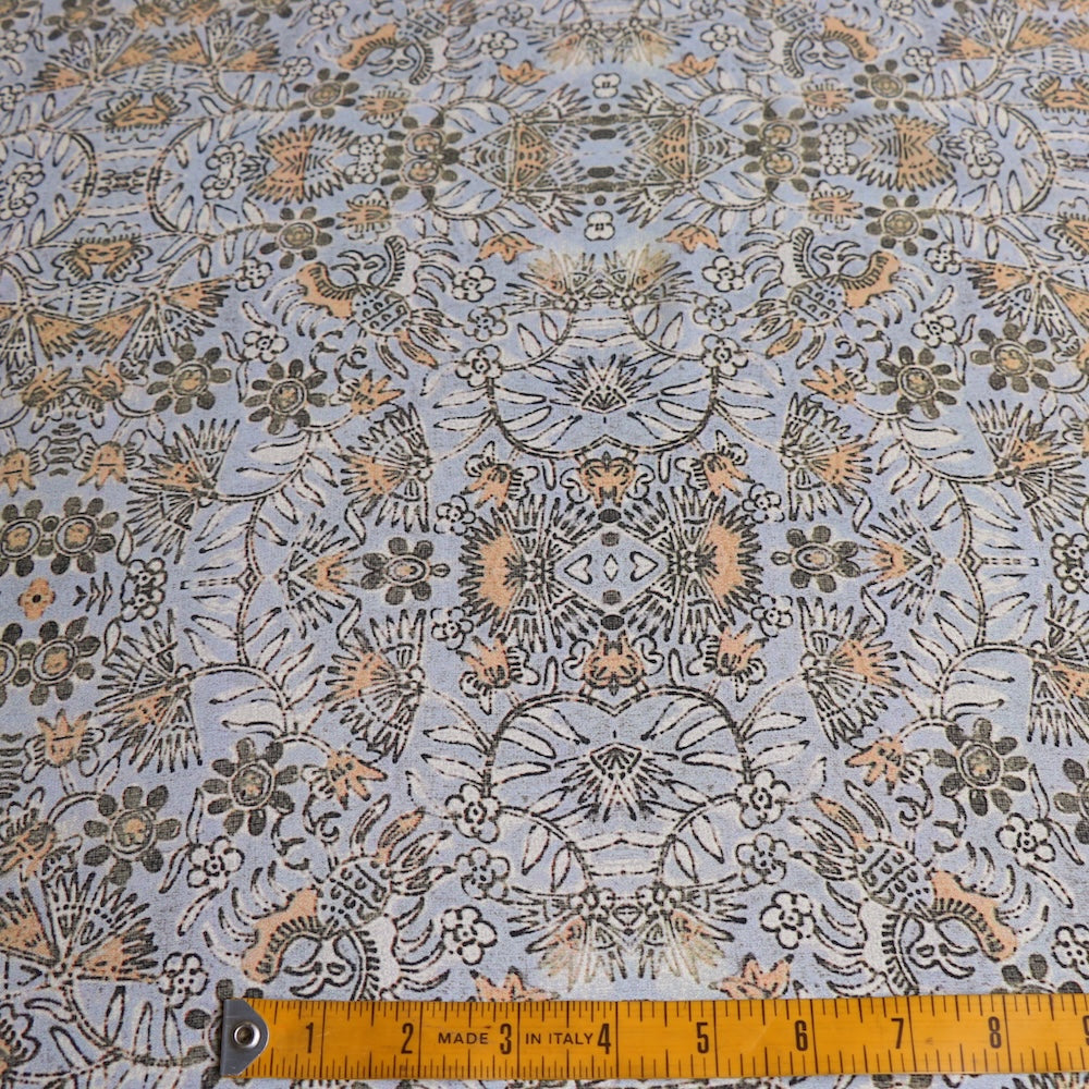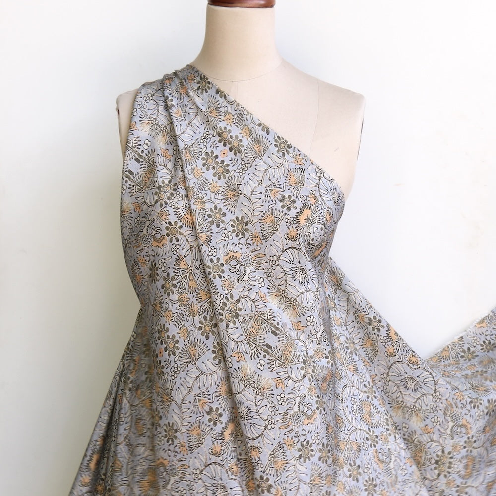 Designer end misty blue/olive block floral printed 100% silk crepe de chine