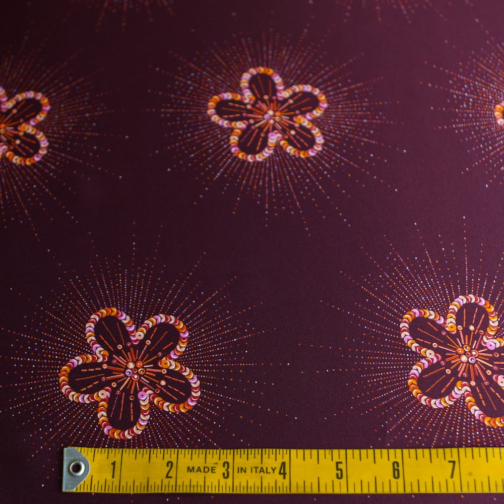 Liberty SS26 Floral Rebellion collection plum red/pink/orange sequinned floral printed 100% silk satin