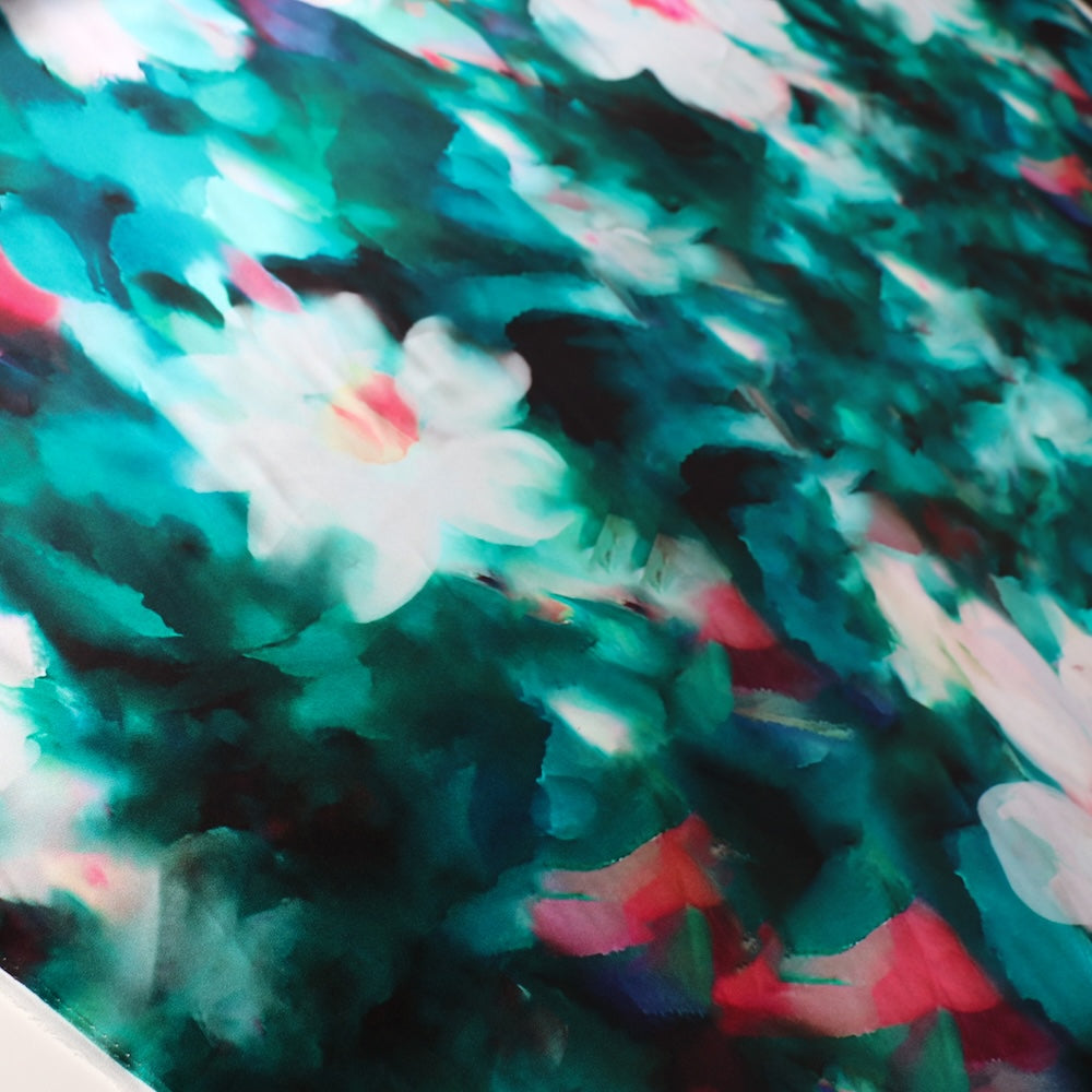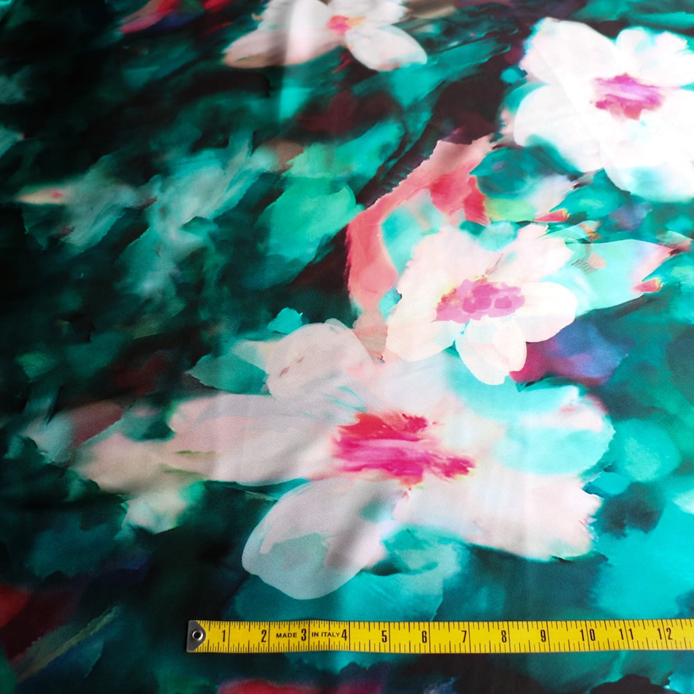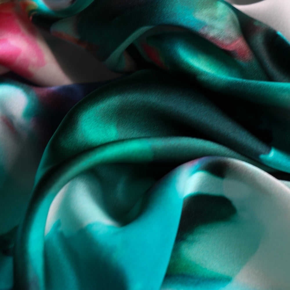Teal/hot pink floral digital printed 100% silk satin