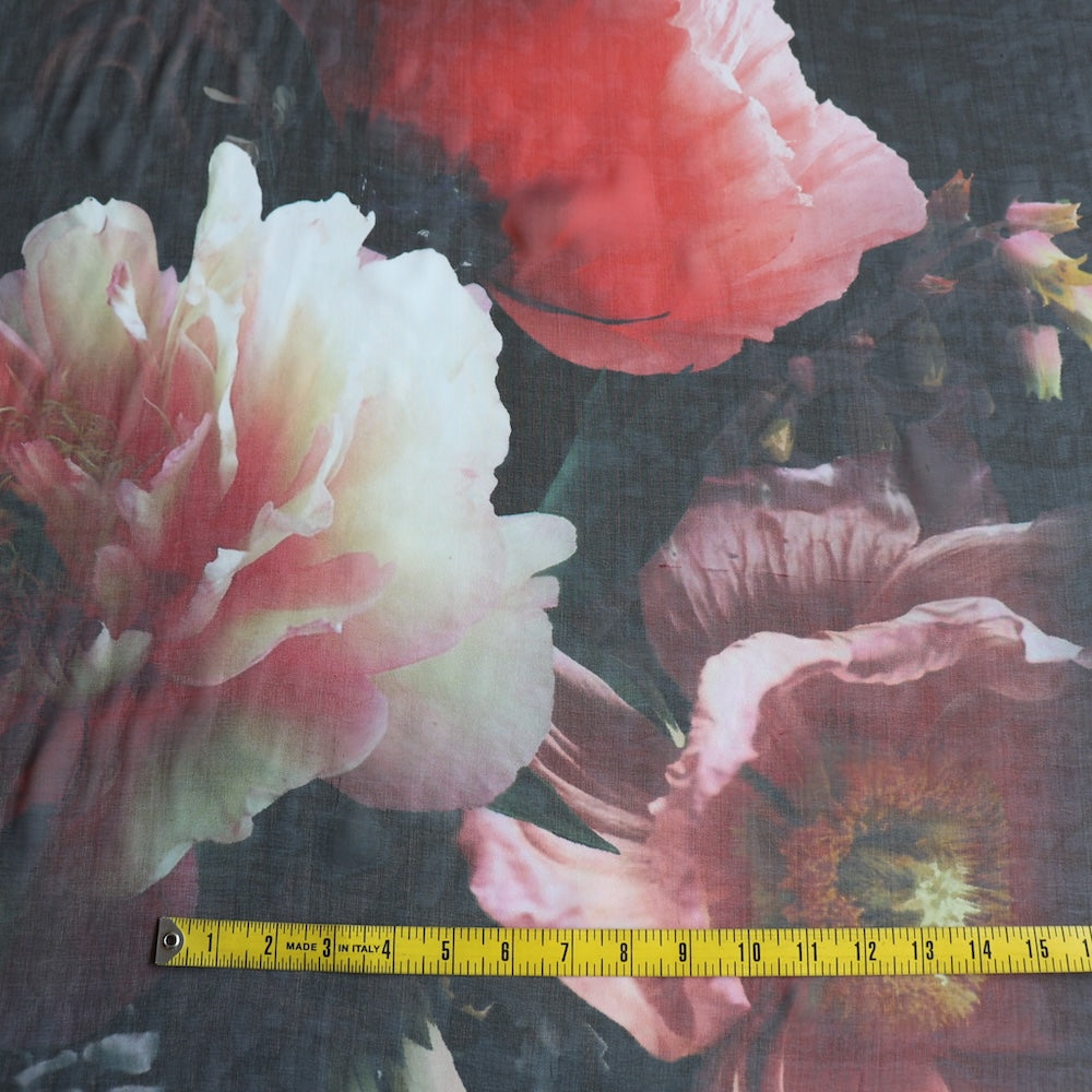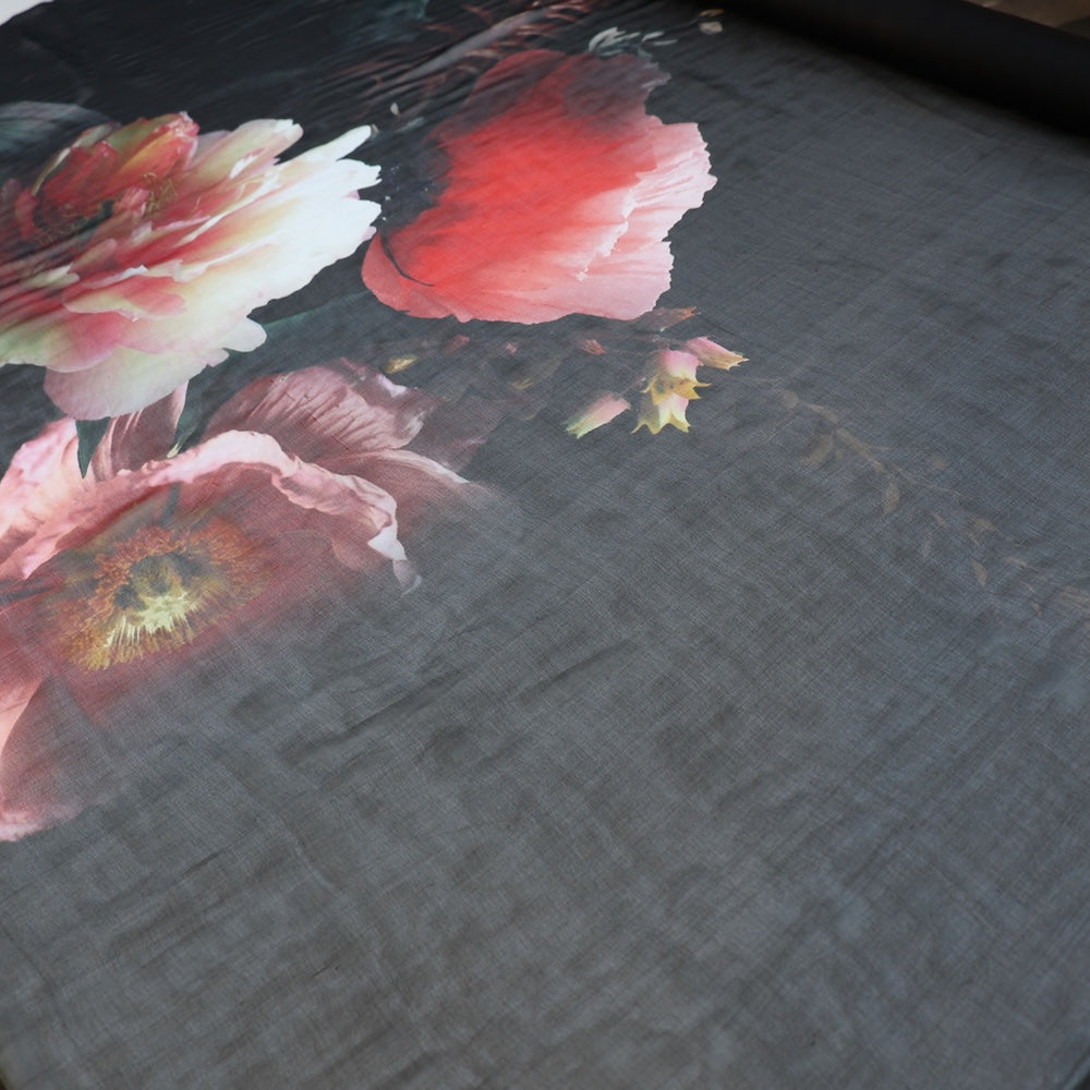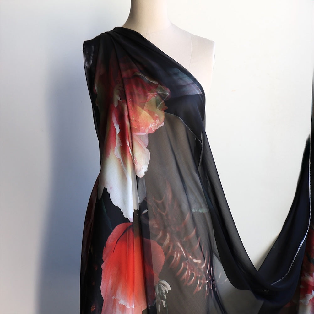 Black with large scale poppie/peonie digitally printed 100% silk chiffon