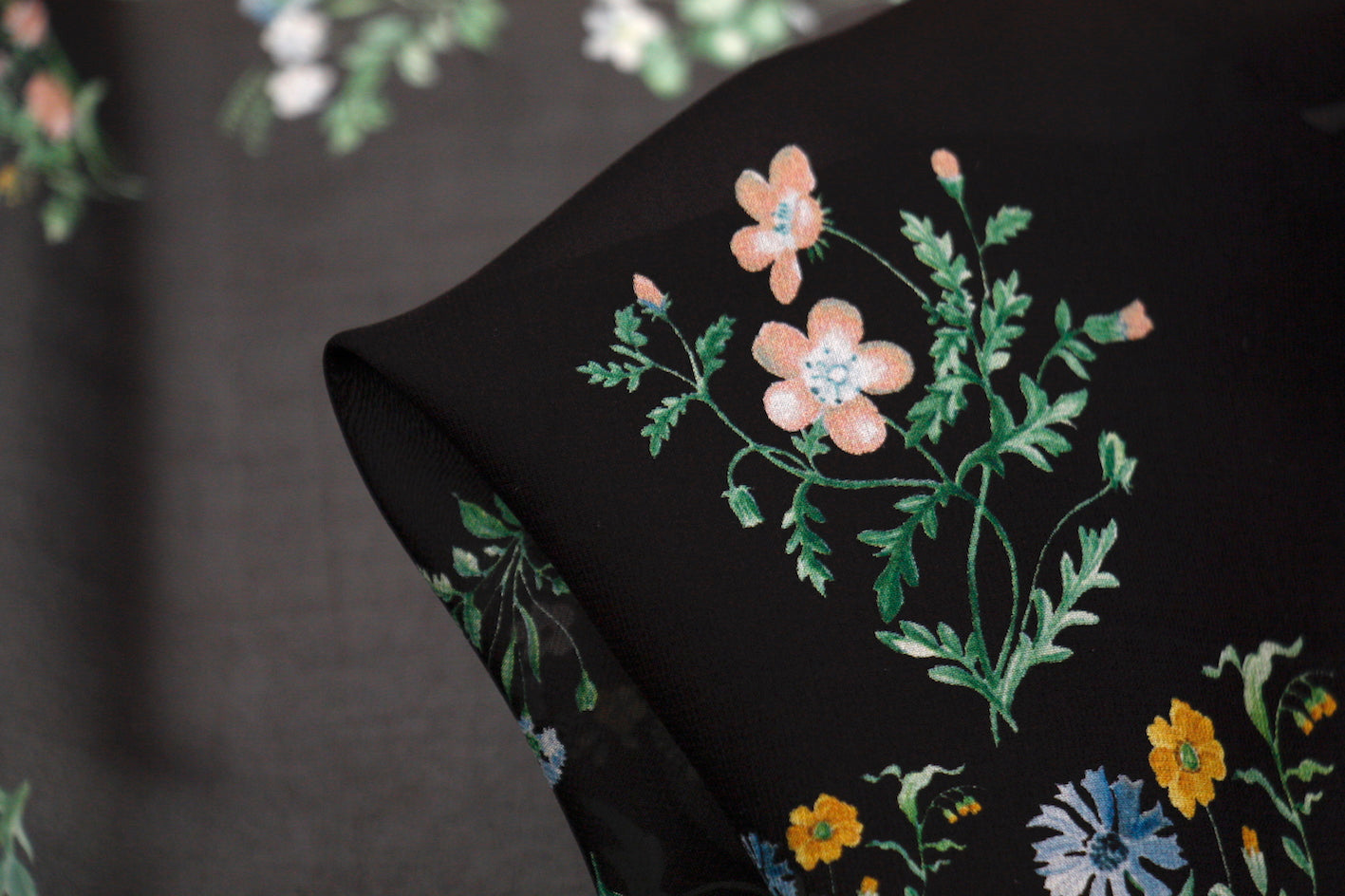 This black/multi floral printed silk georgette is ideal for flowy dresses, skirts, shirts and tops.