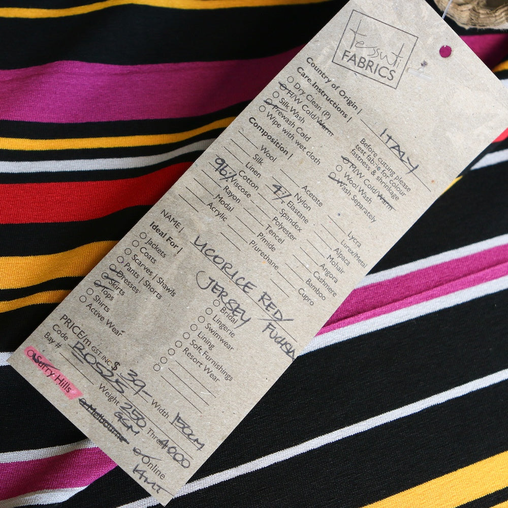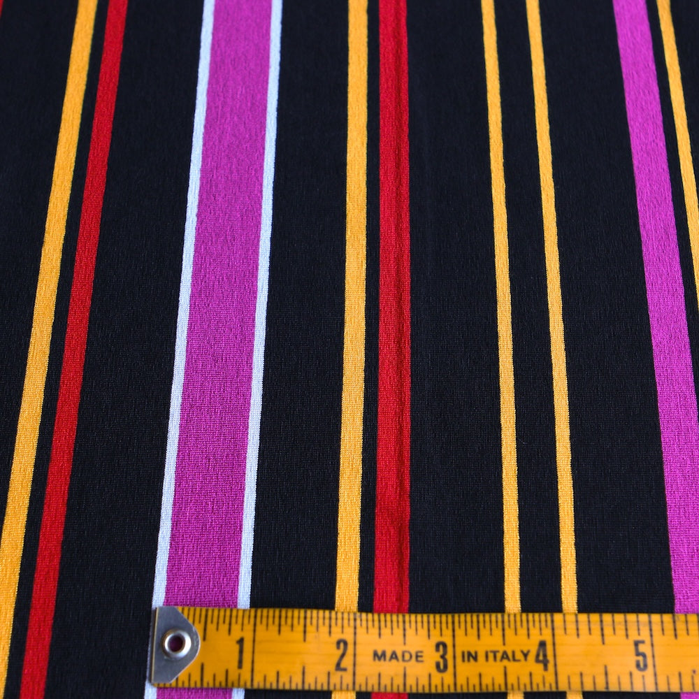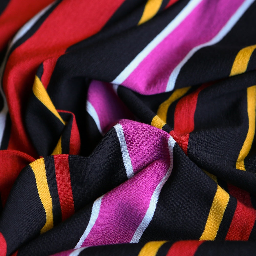 Italian red/black/magenta pink/yellow striped 96% viscose 4% elastane jersey knit