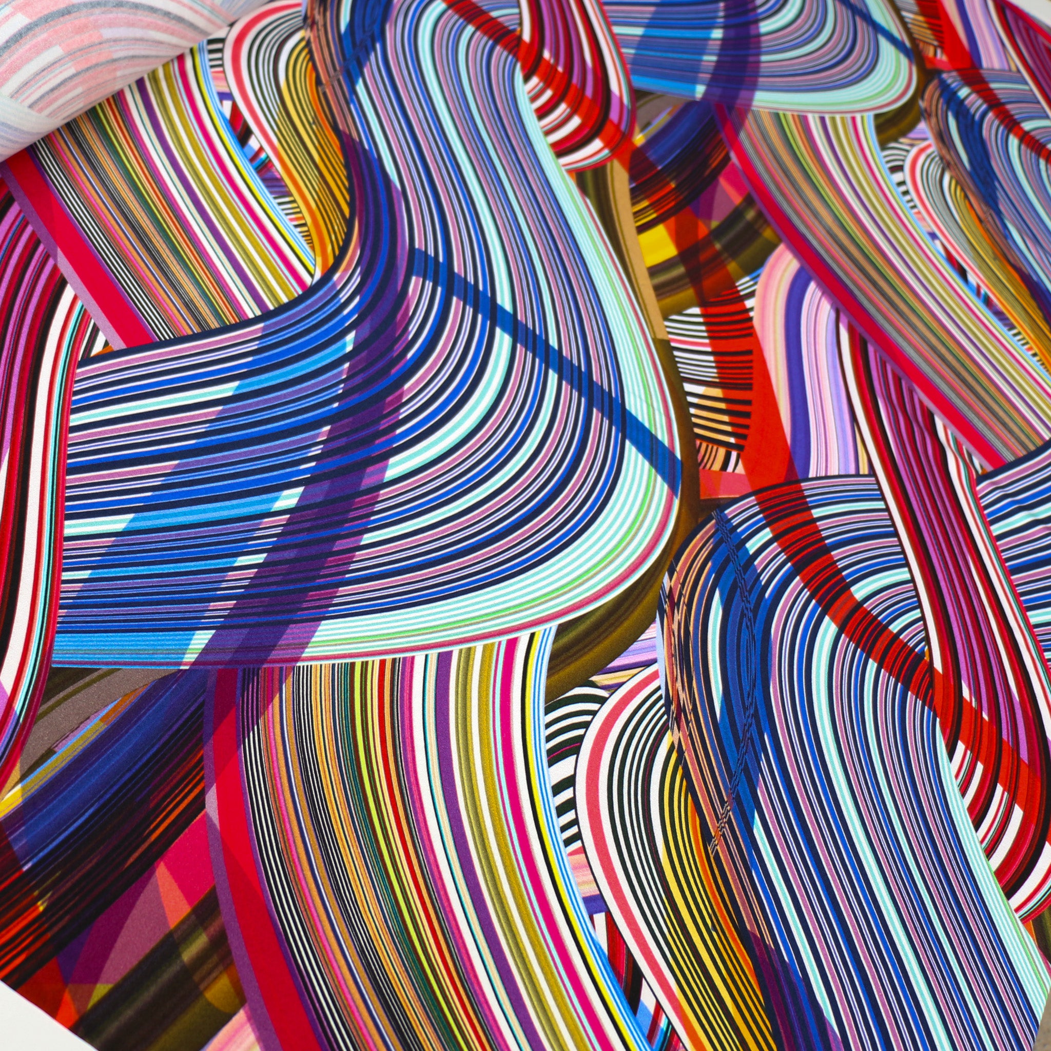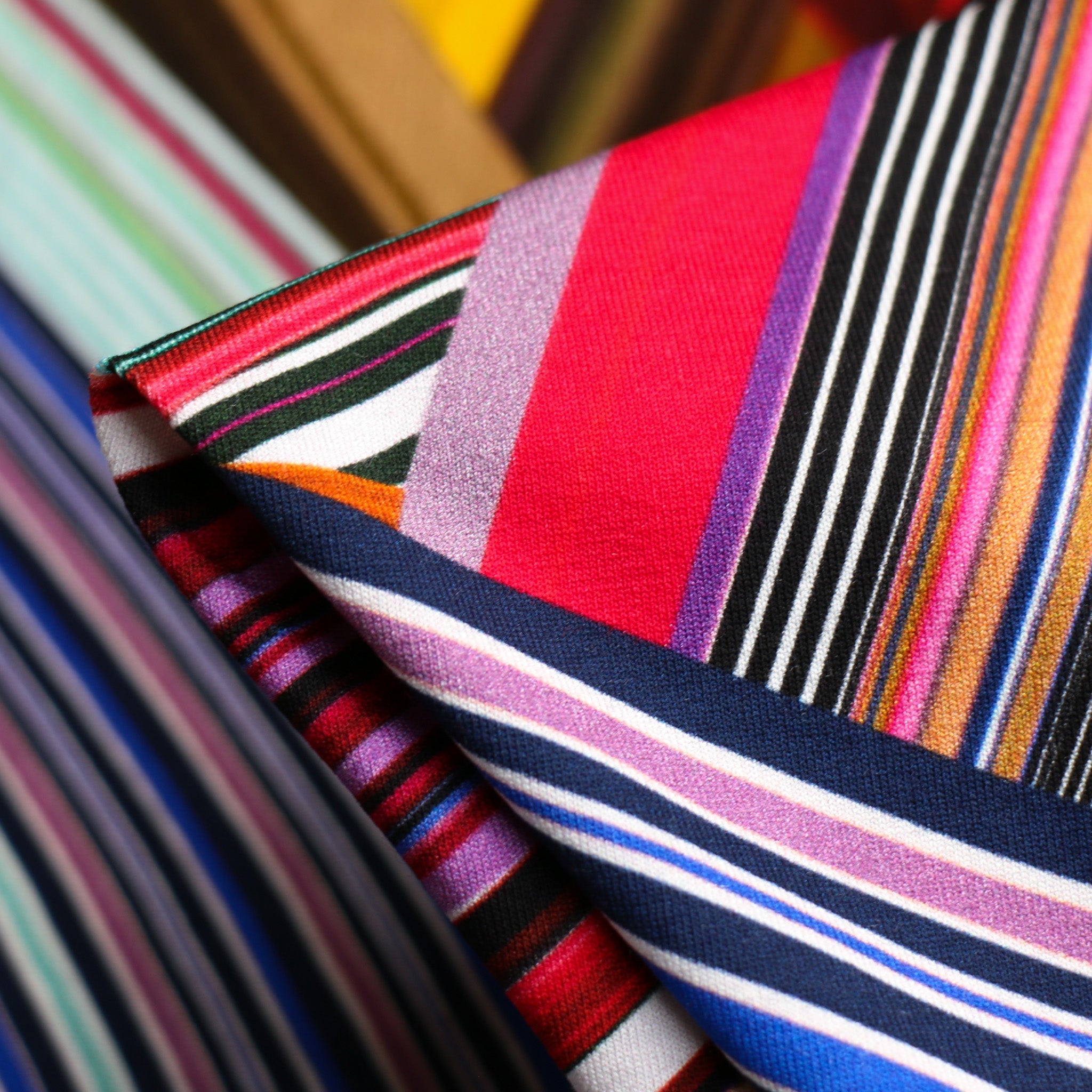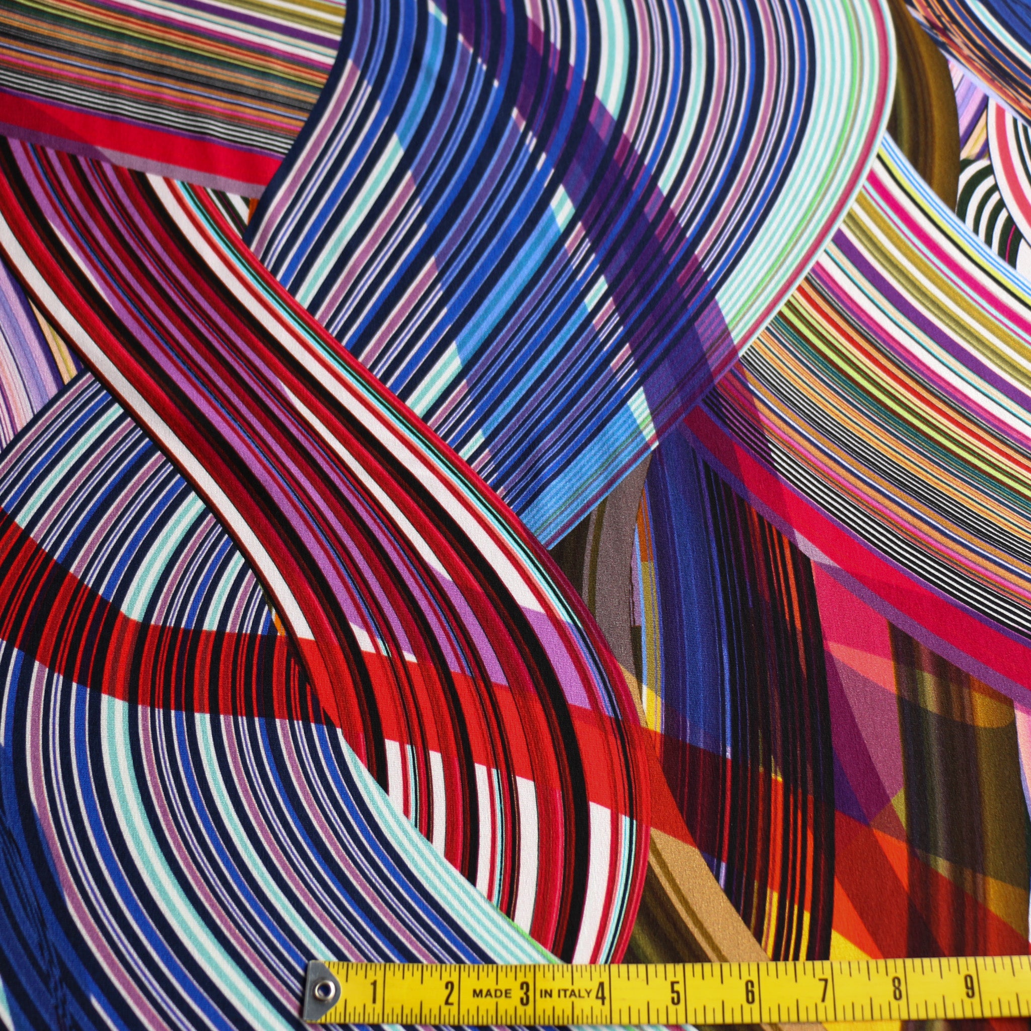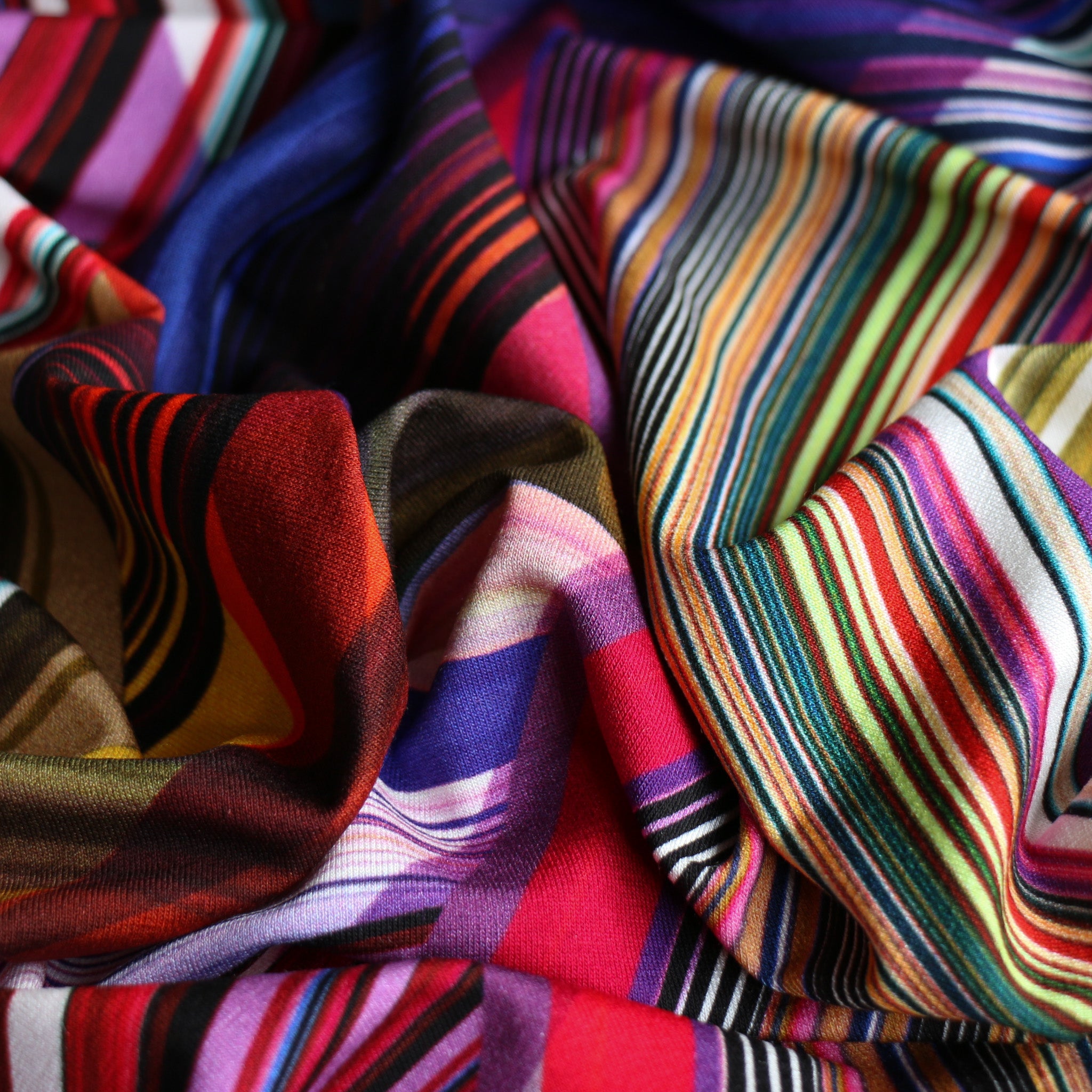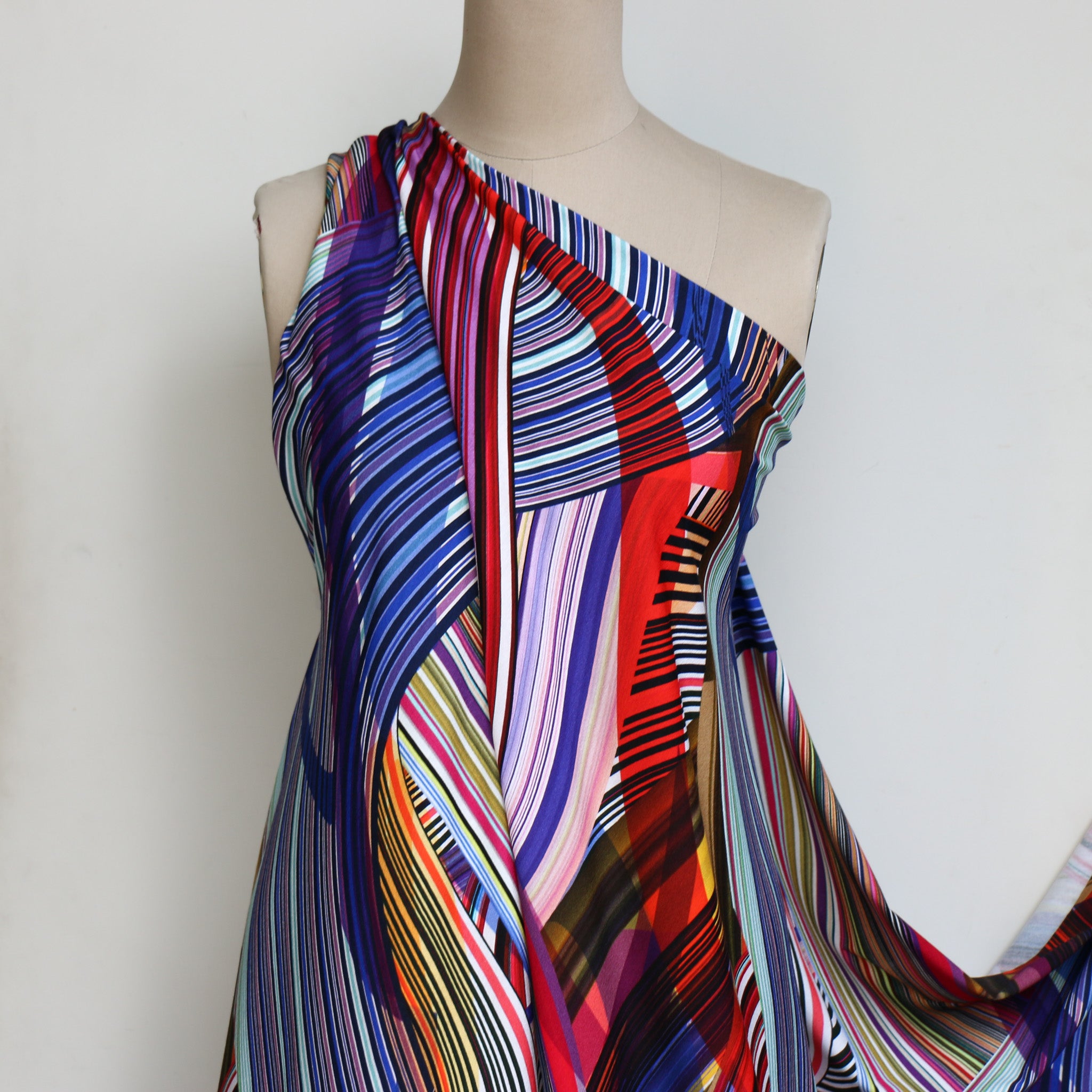 Italian multi coloured ribbon stripe printed 94% viscose 6% elastane jersey knit