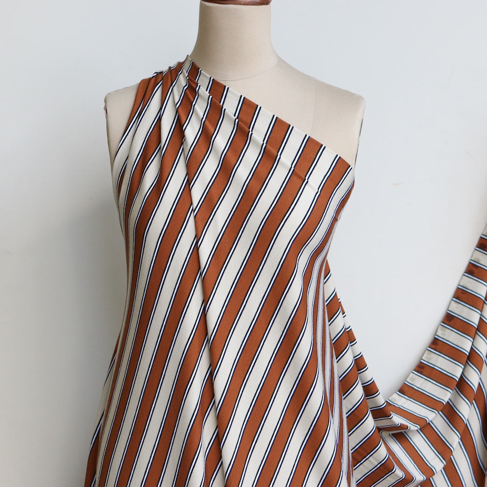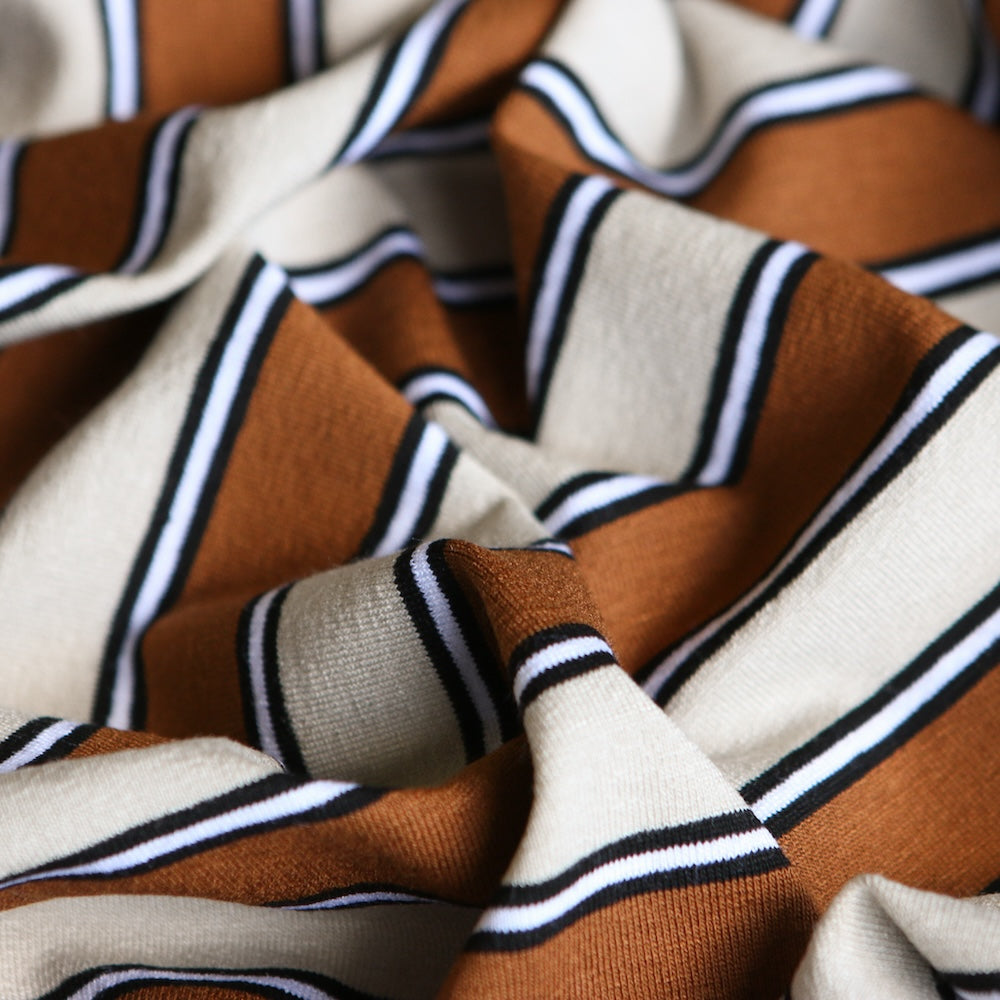 Italian tan/creme/black/white striped 96% viscose 4% elastane jersey knit