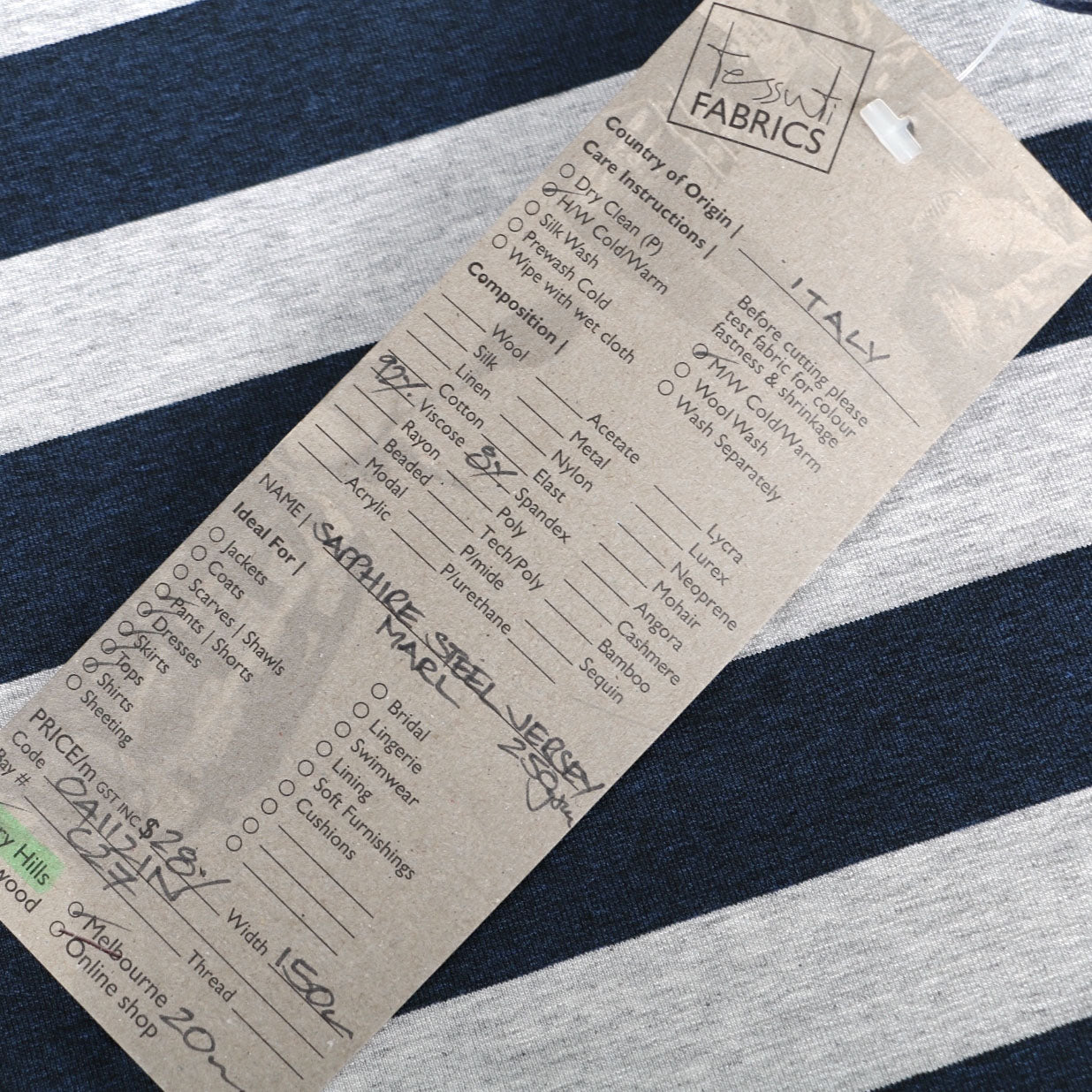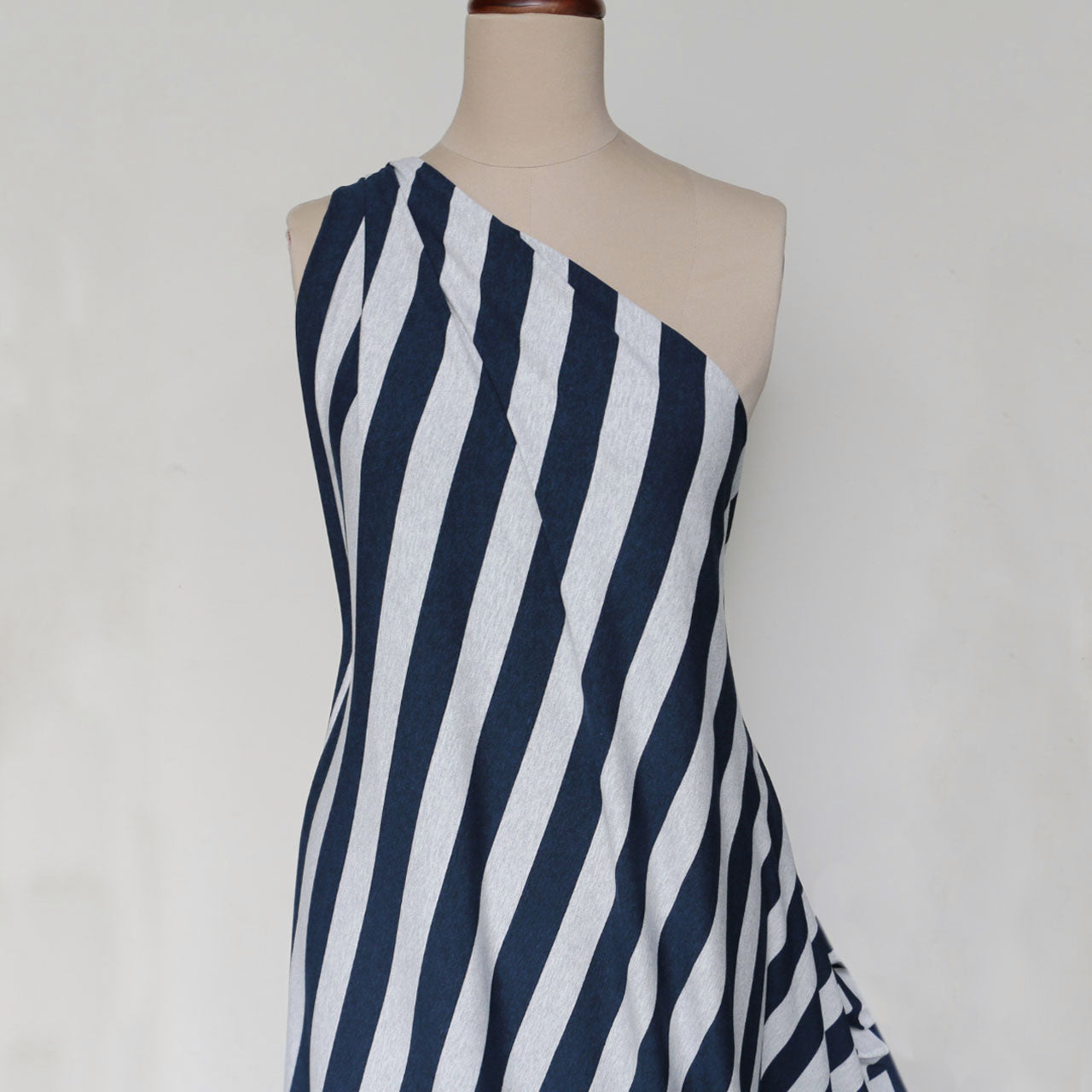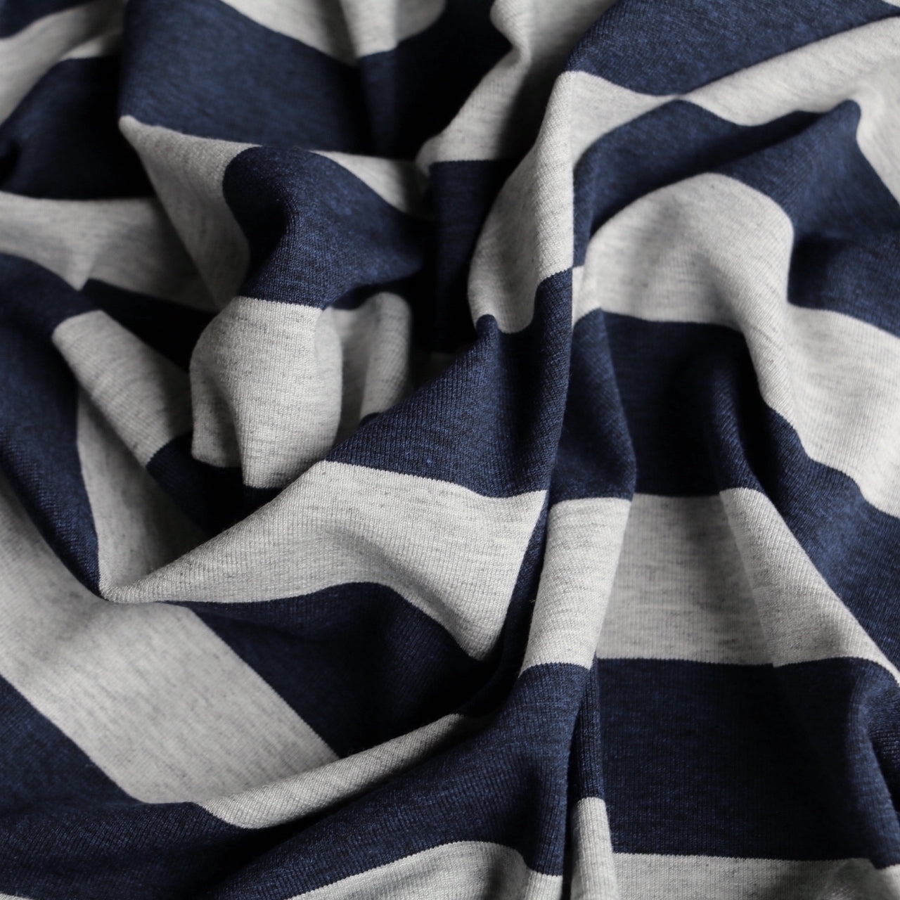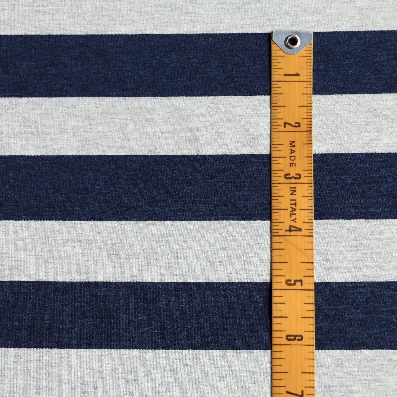 Designer end Italian grey marl/French Navy striped 92% viscose 8% spandex jersey knit