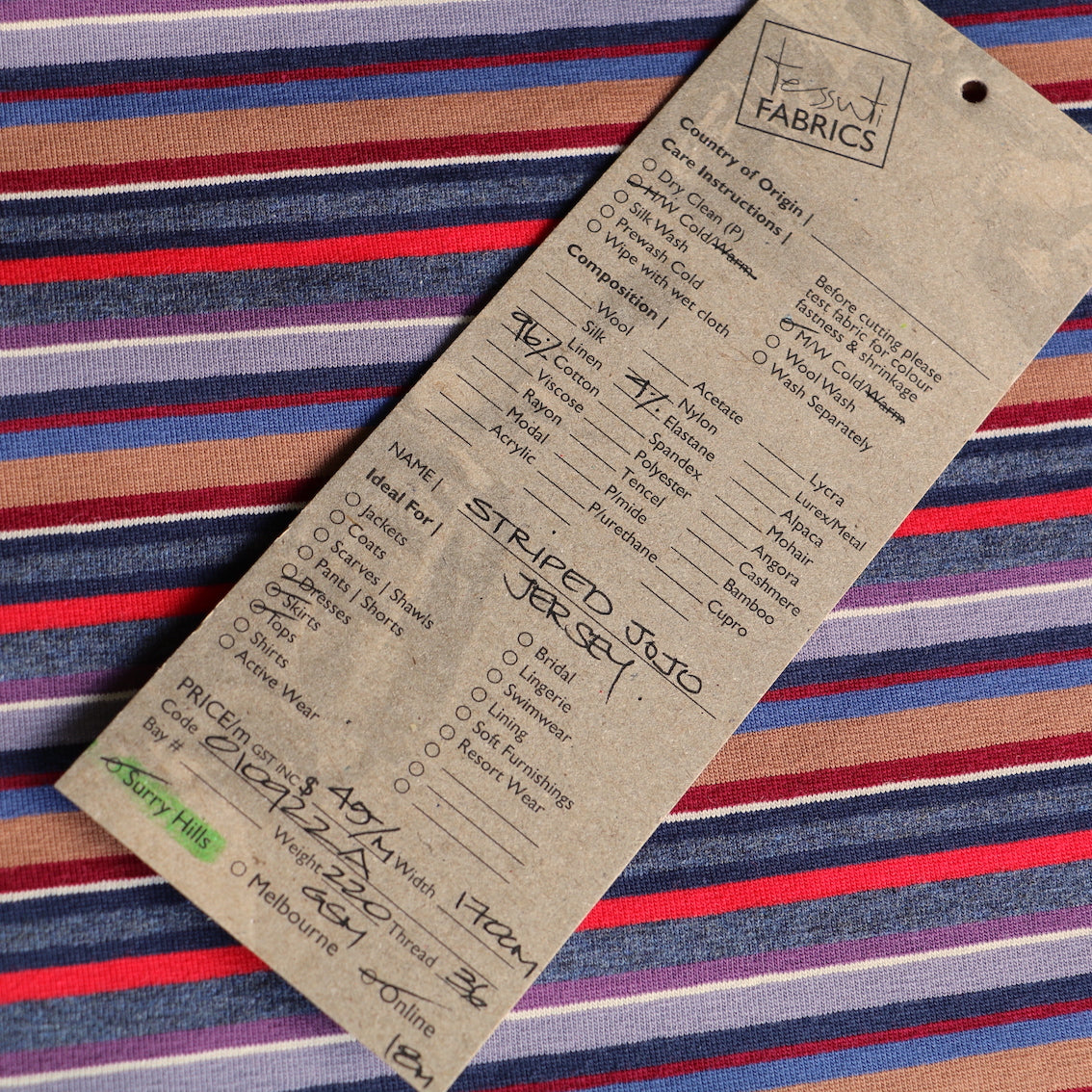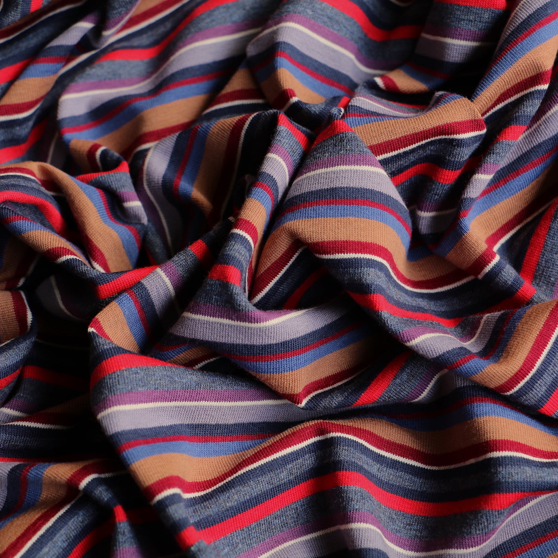 Italian multi grey marle/tan/red/purple/blue/white striped 96% cotton 4% elastane jersey knit