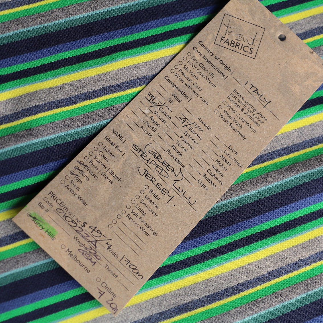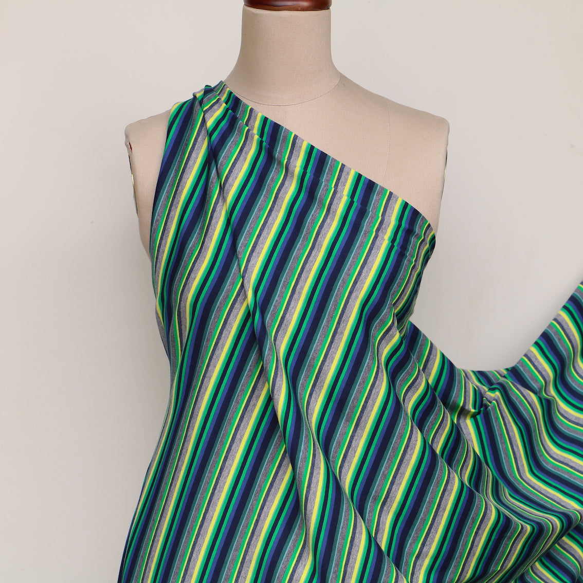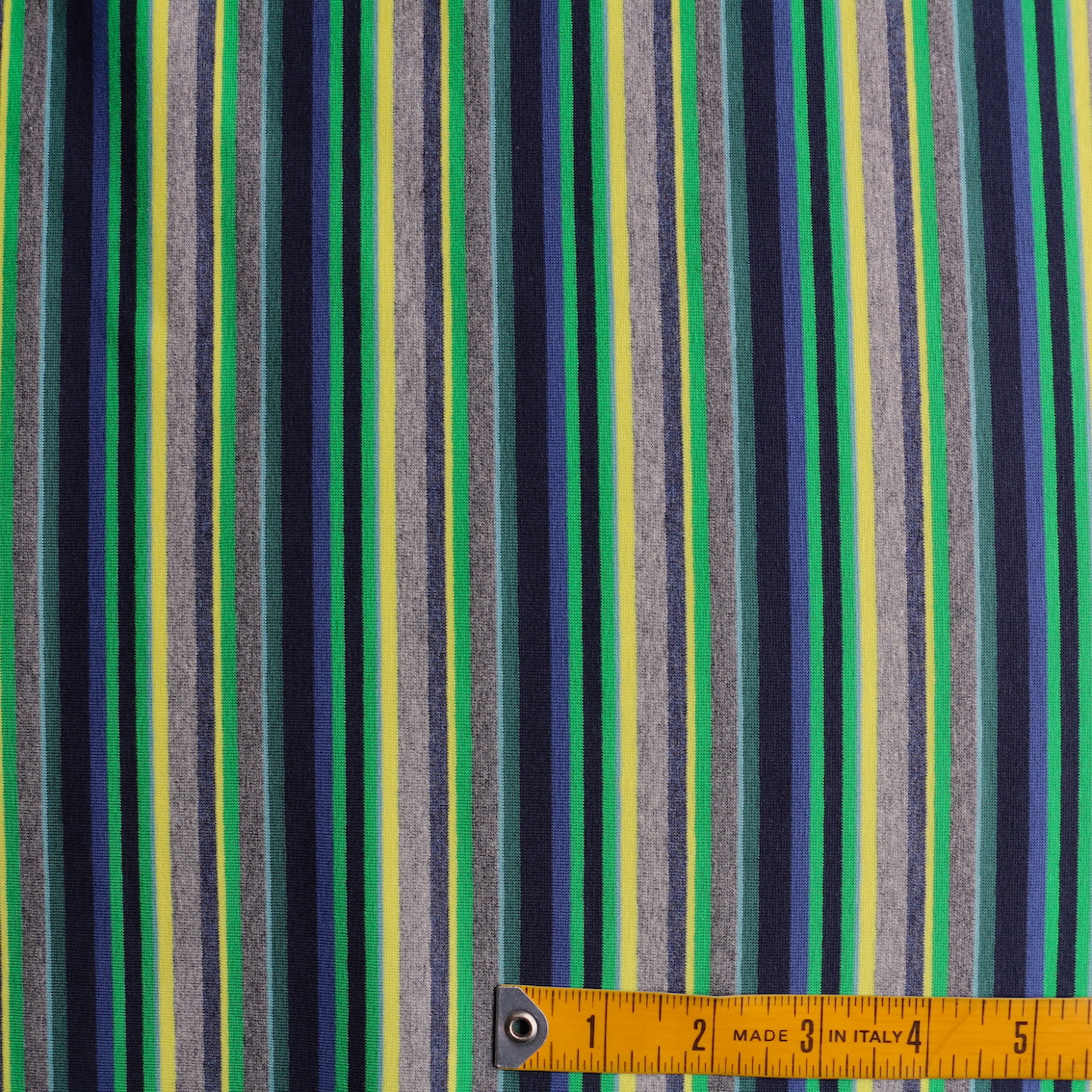 Italian multi grey marle/green/navy/bluette/lime striped 96% cotton 4% elastane jersey knit