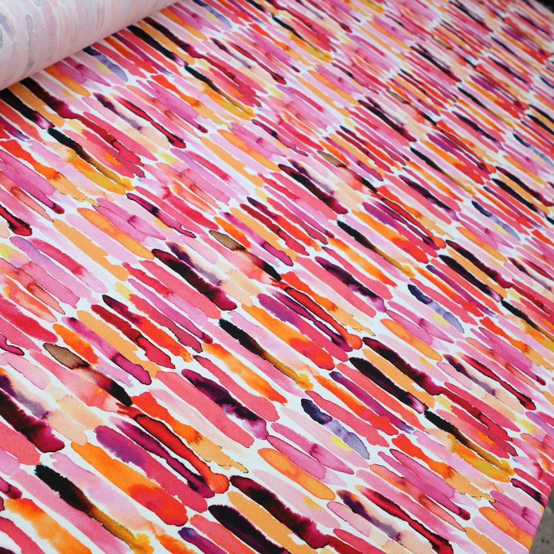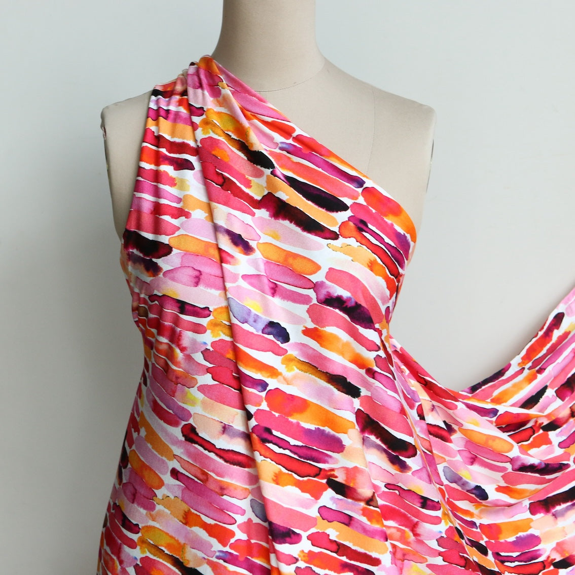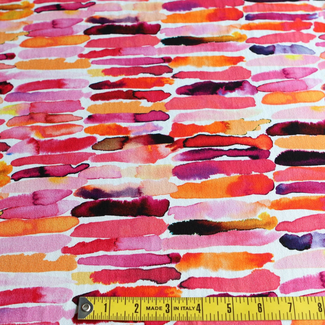 Italian pink/orange/garnet paint strokes printed 94% viscose 6% elastane jersey