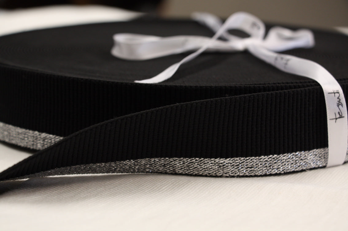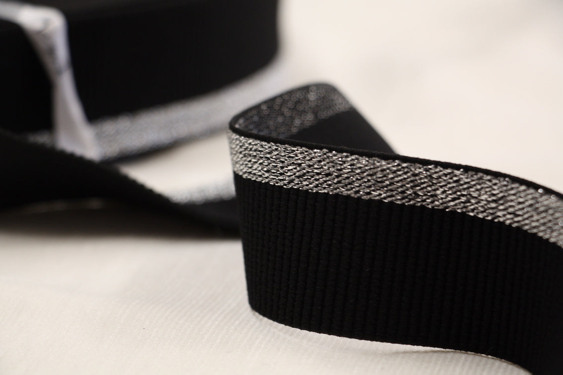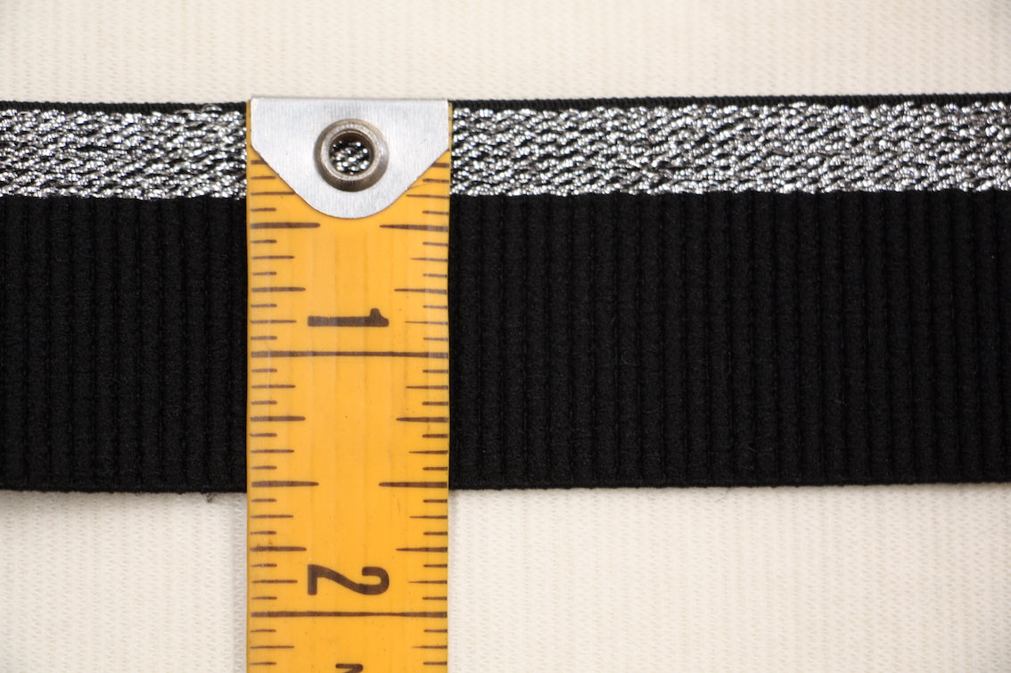 Firm ribbed 38mm or 1 1'2" stretch fancy elastic trim - Black with silver metallic.