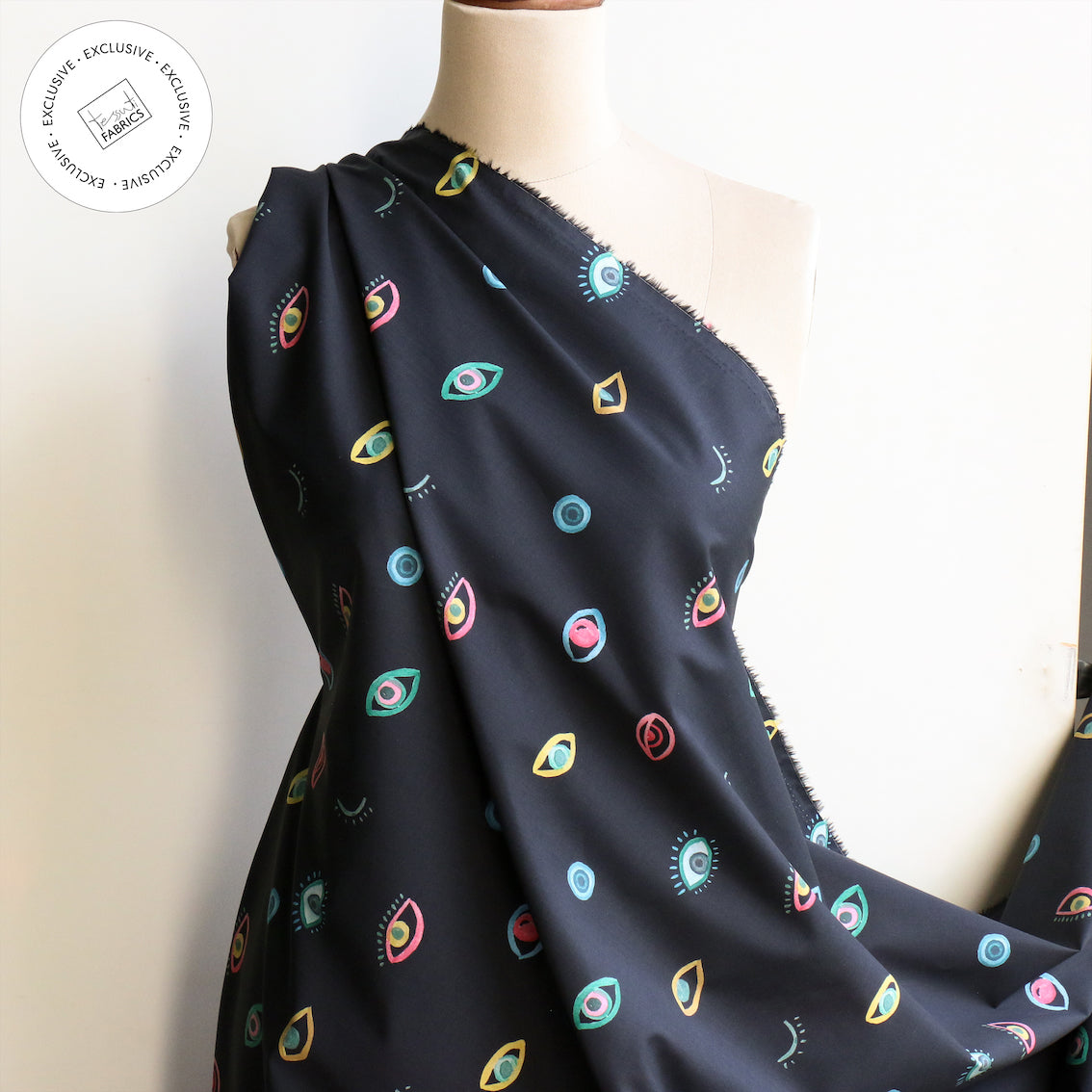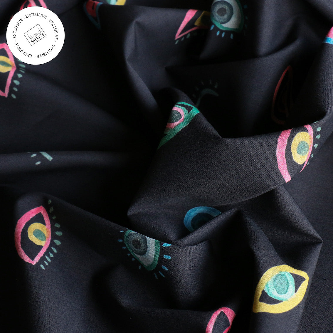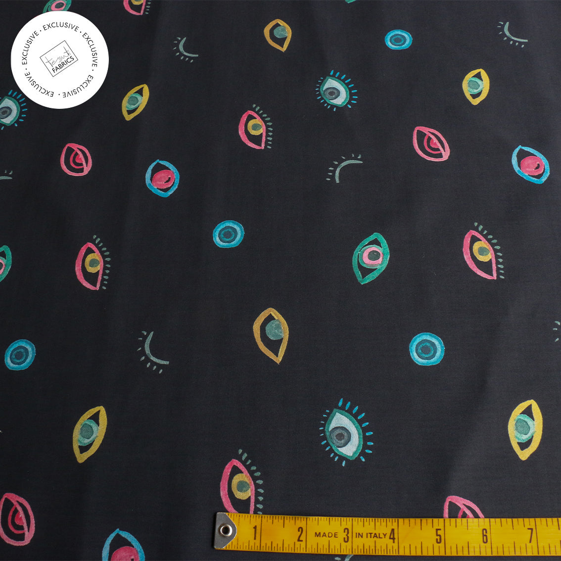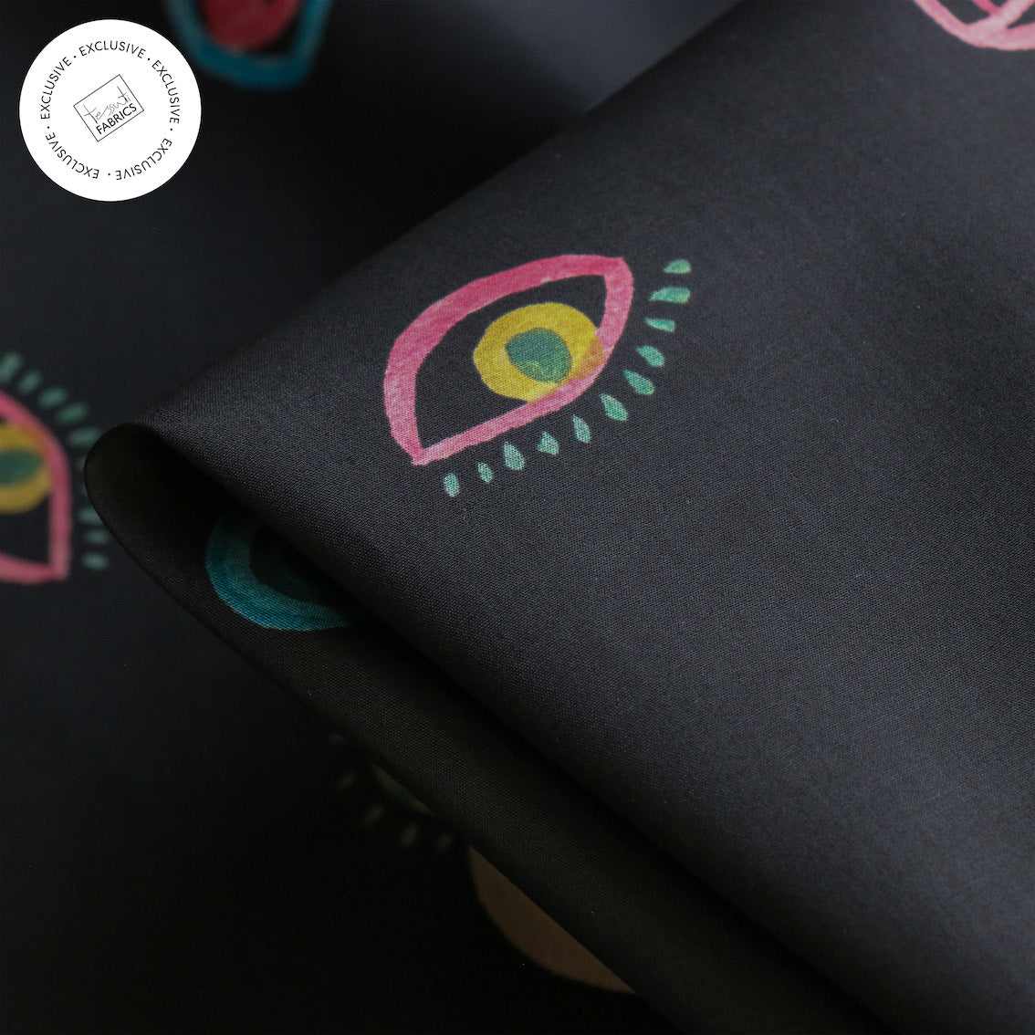Striking inky/multi eye printed 100% cotton poplin